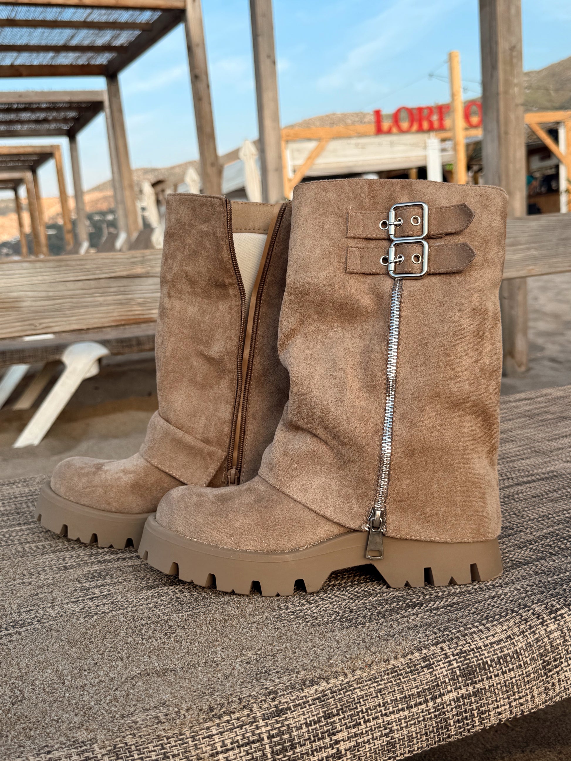 Botas de ante espectaculares, con un estilo motero muy de moda esta temporada. Son ese tipo de botas que no pueden faltar en tu armario: versátiles y llenas de carácter. Puedes combinarlas con un vestido, un short o un pantalón, ¡quedan increíbles con todo!✨
