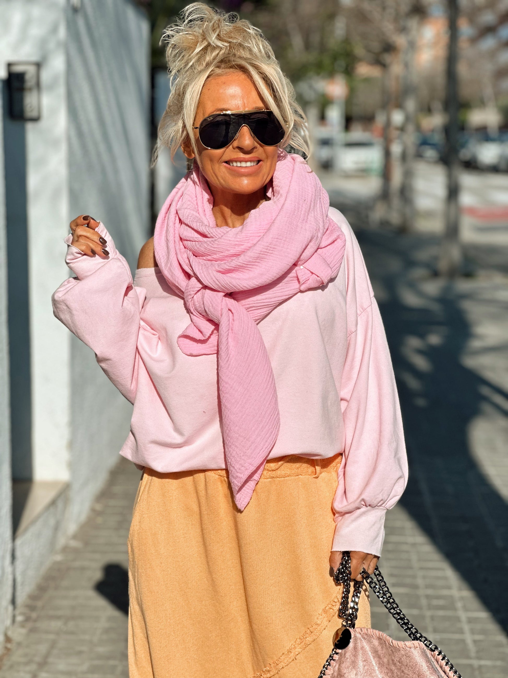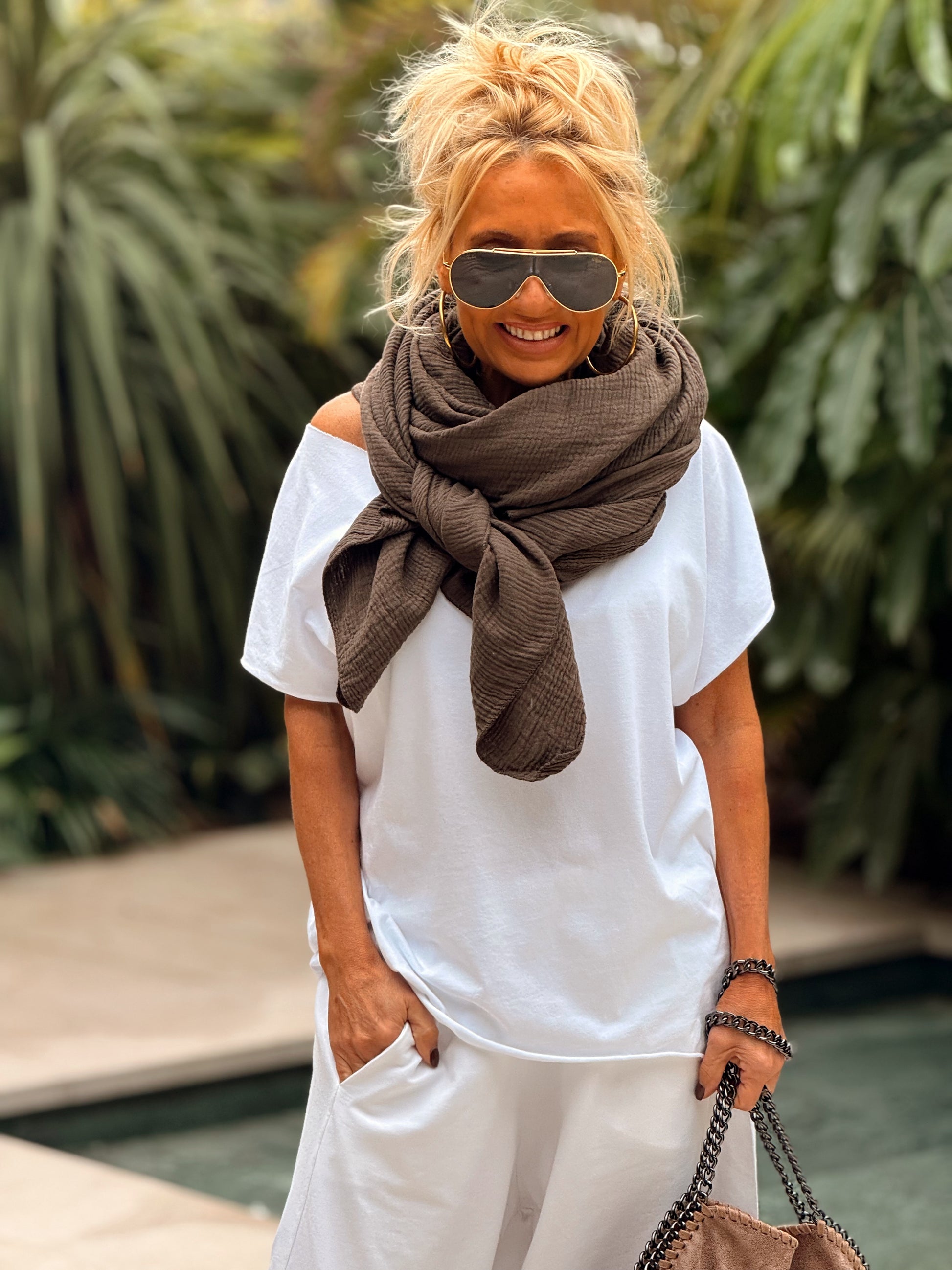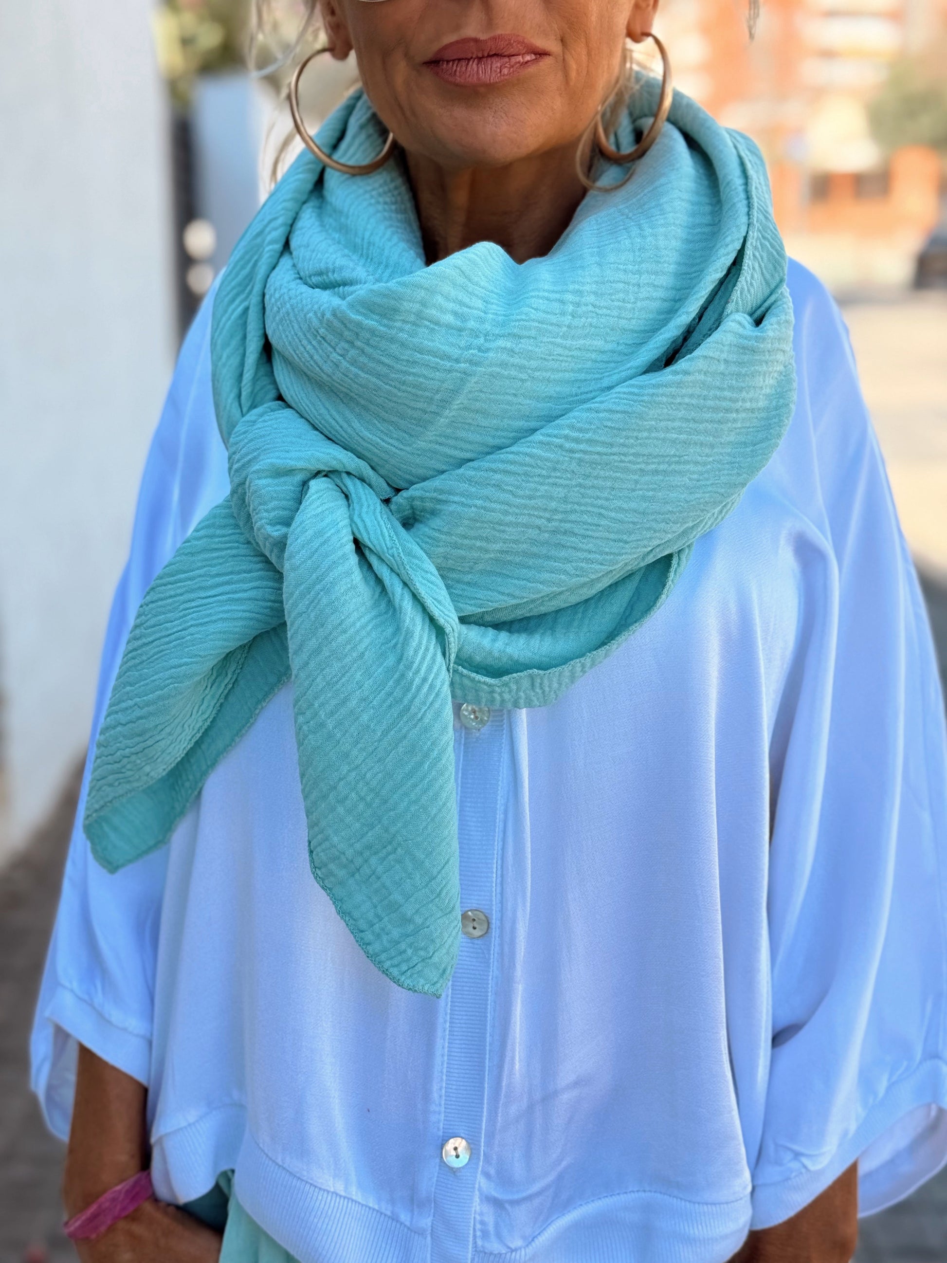 Esta espectacular bufanda es una pieza imprescindible para tu colección. Su gran diseño, con un amplio corte cuadrado, te permite llevarlo de mil maneras: como pareo, como pañuelo, como chal o incluso como un sofisticado complemento para tus looks.