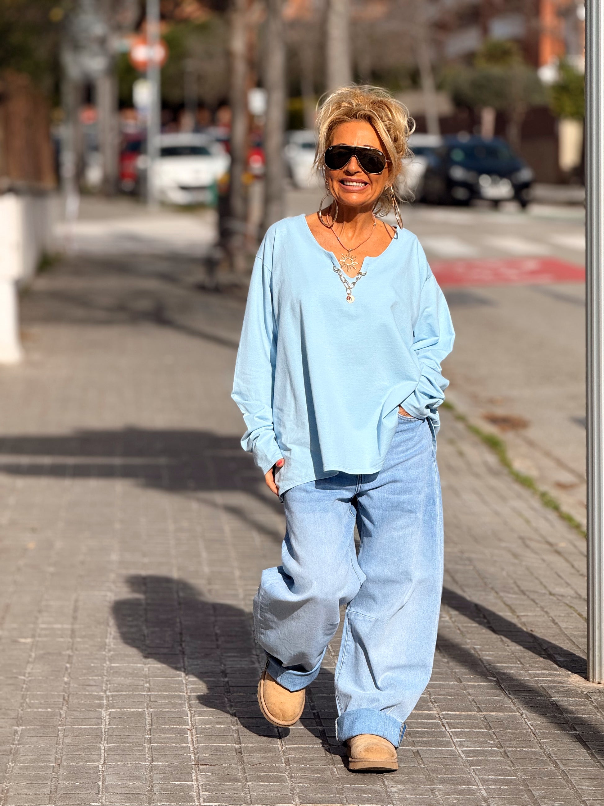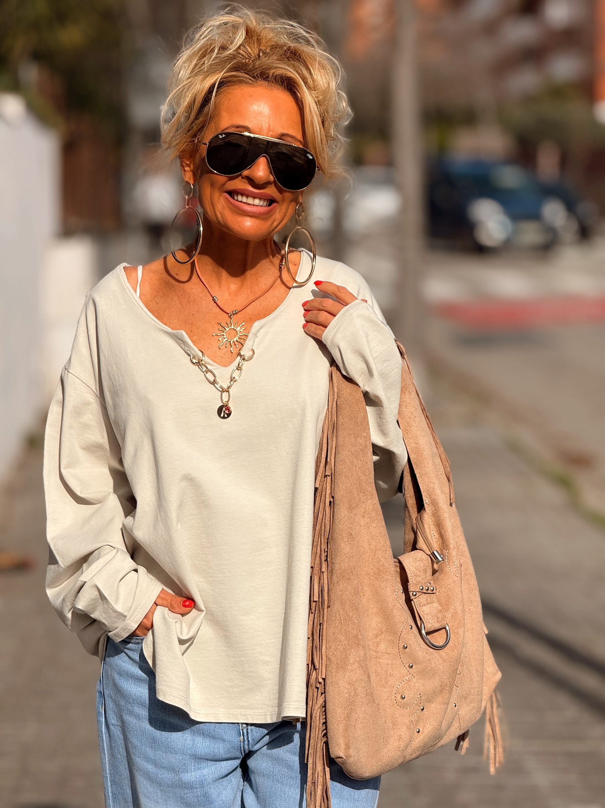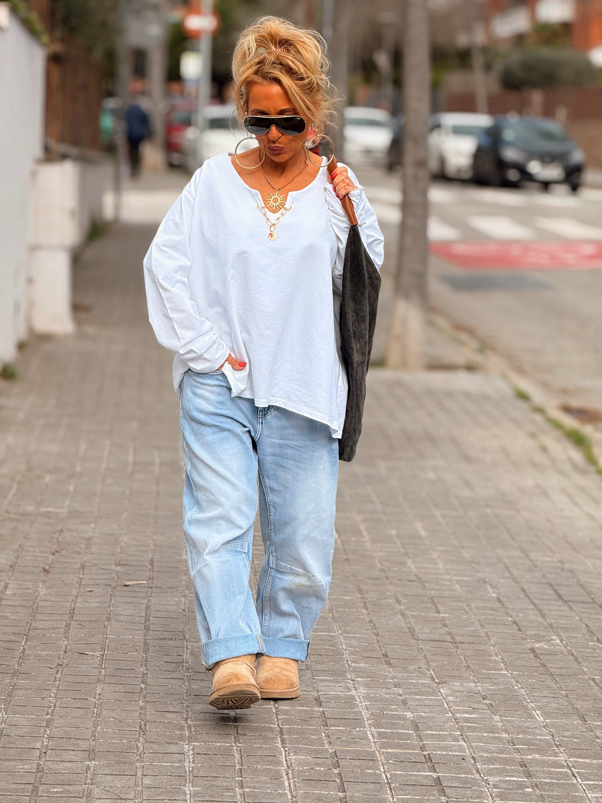 No es solo una camiseta… es una pieza especial. Su diseño es moderno y favorecedor, con una caída bonita que se adapta perfectamente al cuerpo. Pero lo que la hace única es su collar integrado, que viene incluido y crea un look completo, elegante y original en un solo gesto.