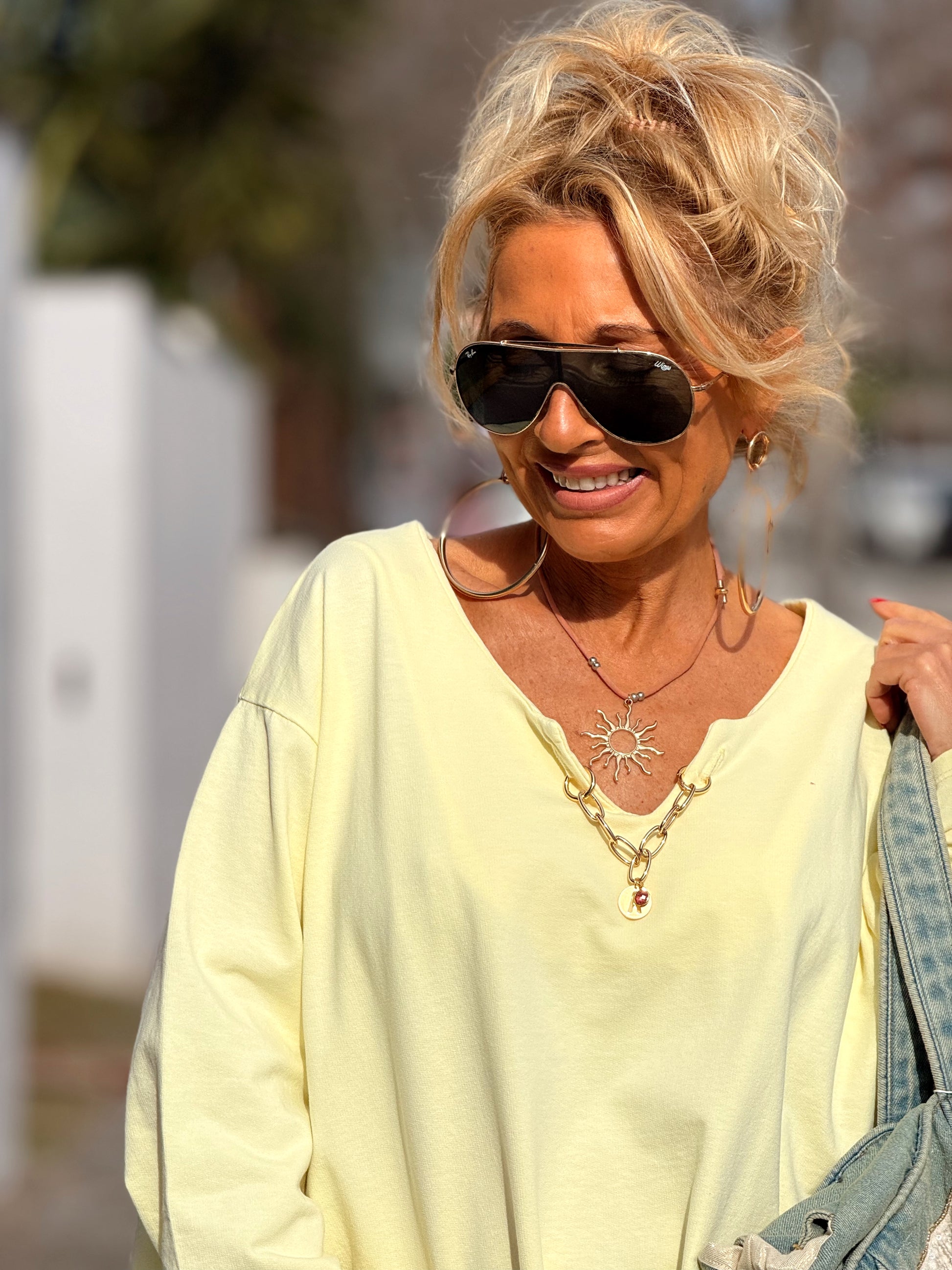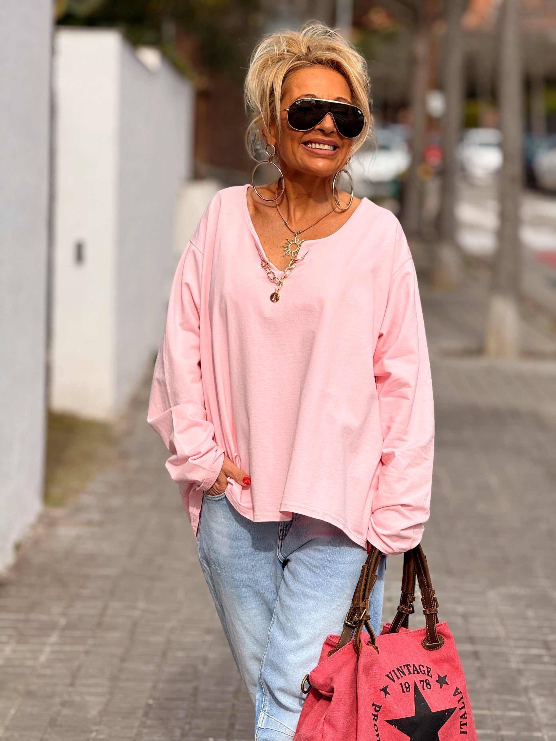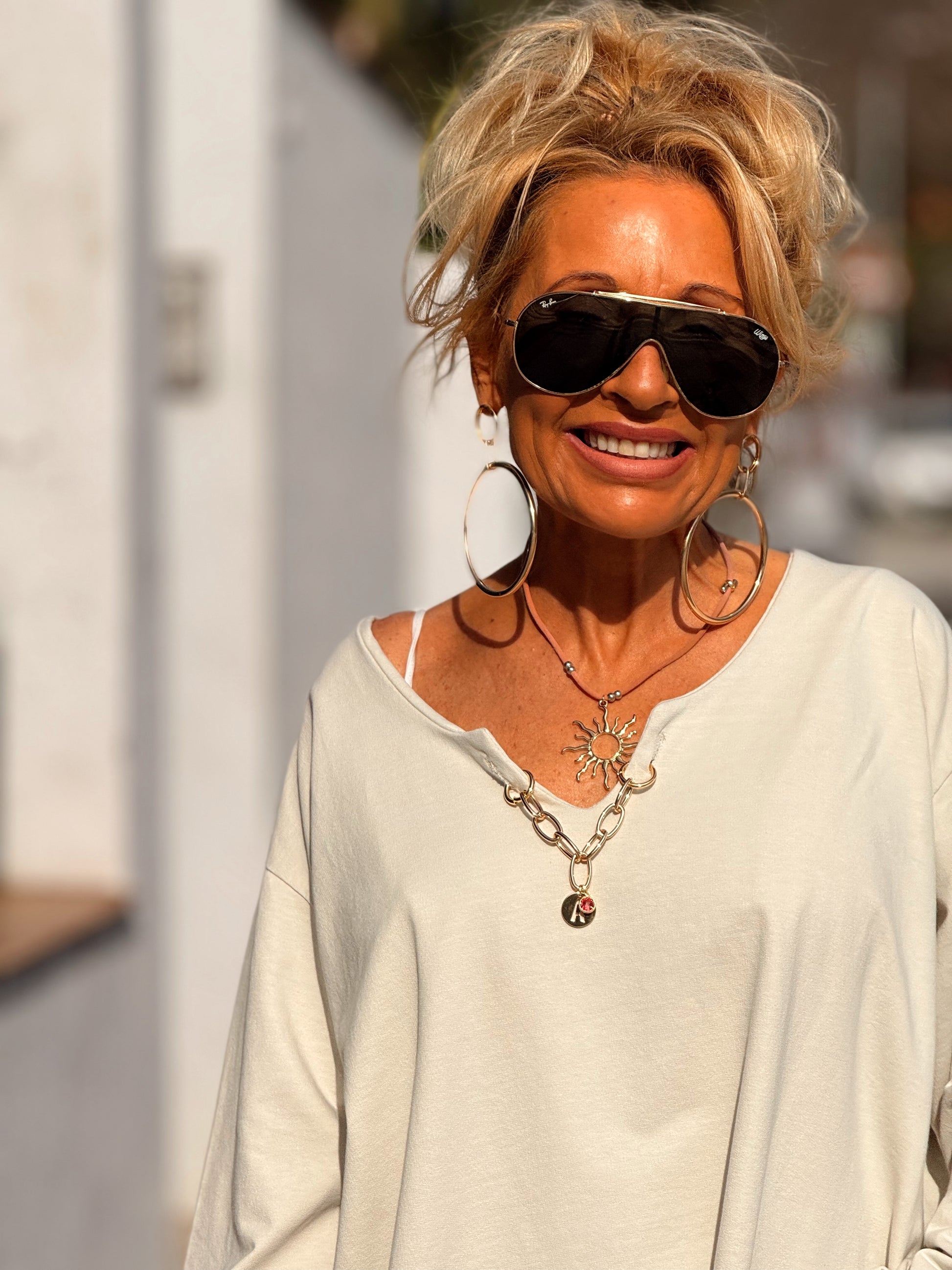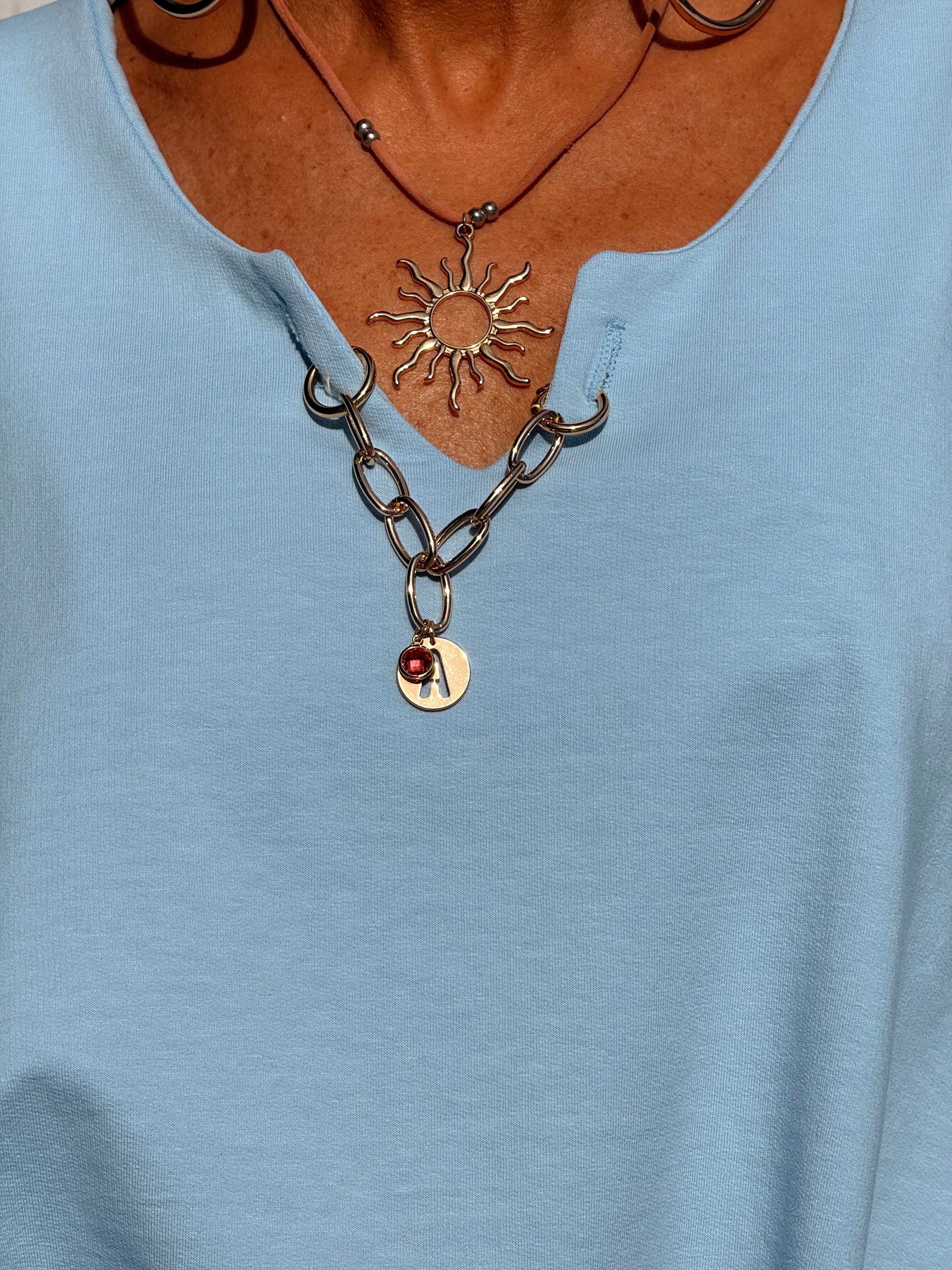 No es solo una camiseta… es una pieza especial. Su diseño es moderno y favorecedor, con una caída bonita que se adapta perfectamente al cuerpo. Pero lo que la hace única es su collar integrado, que viene incluido y crea un look completo, elegante y original en un solo gesto.