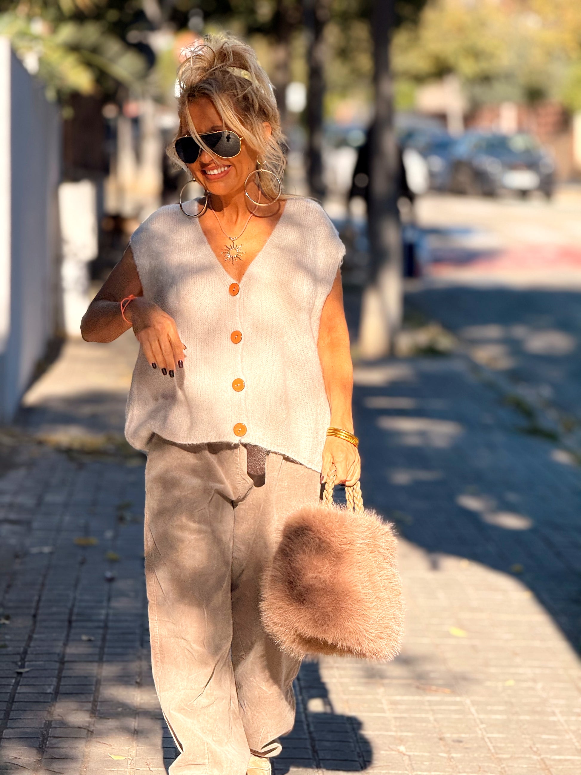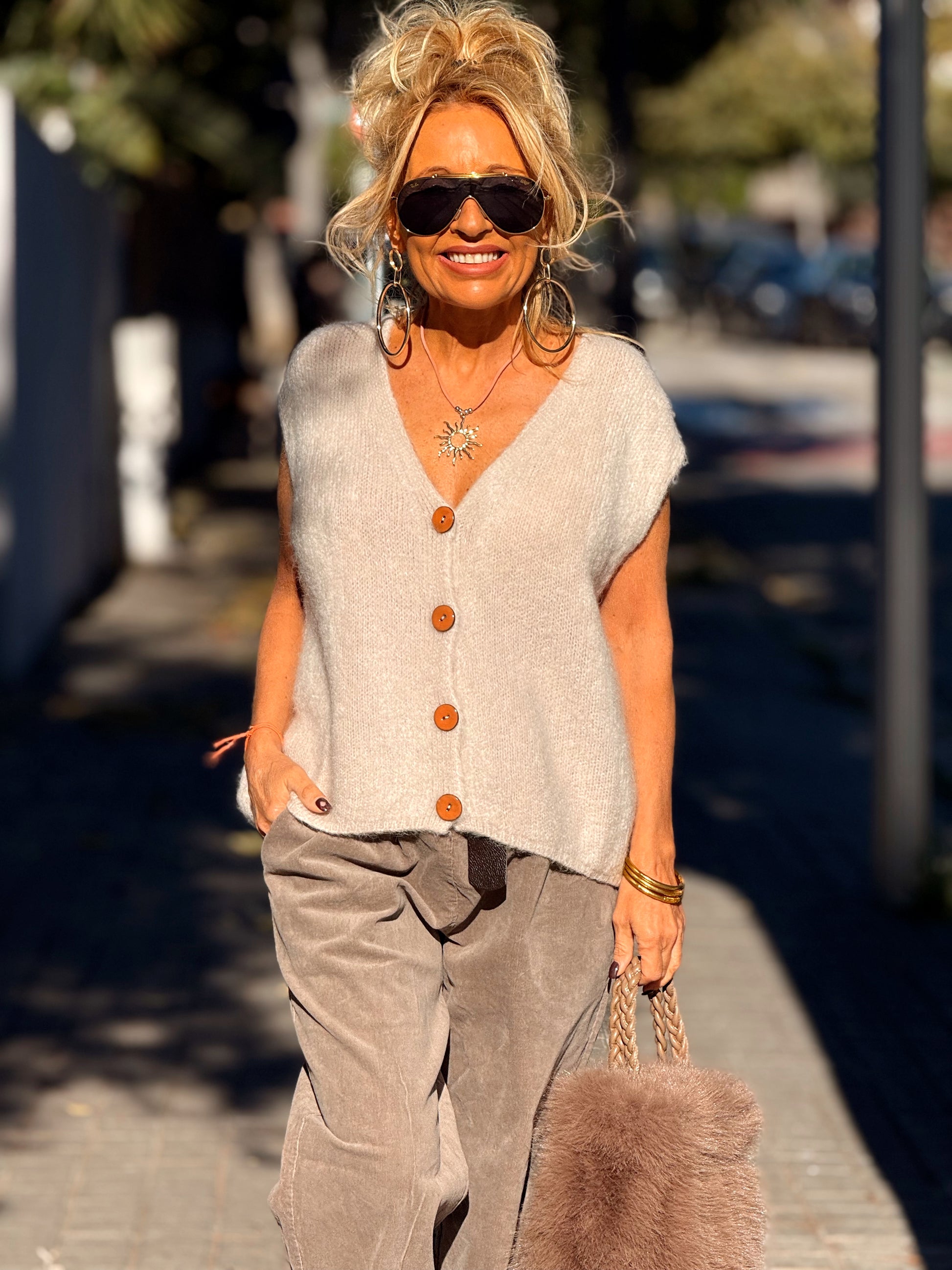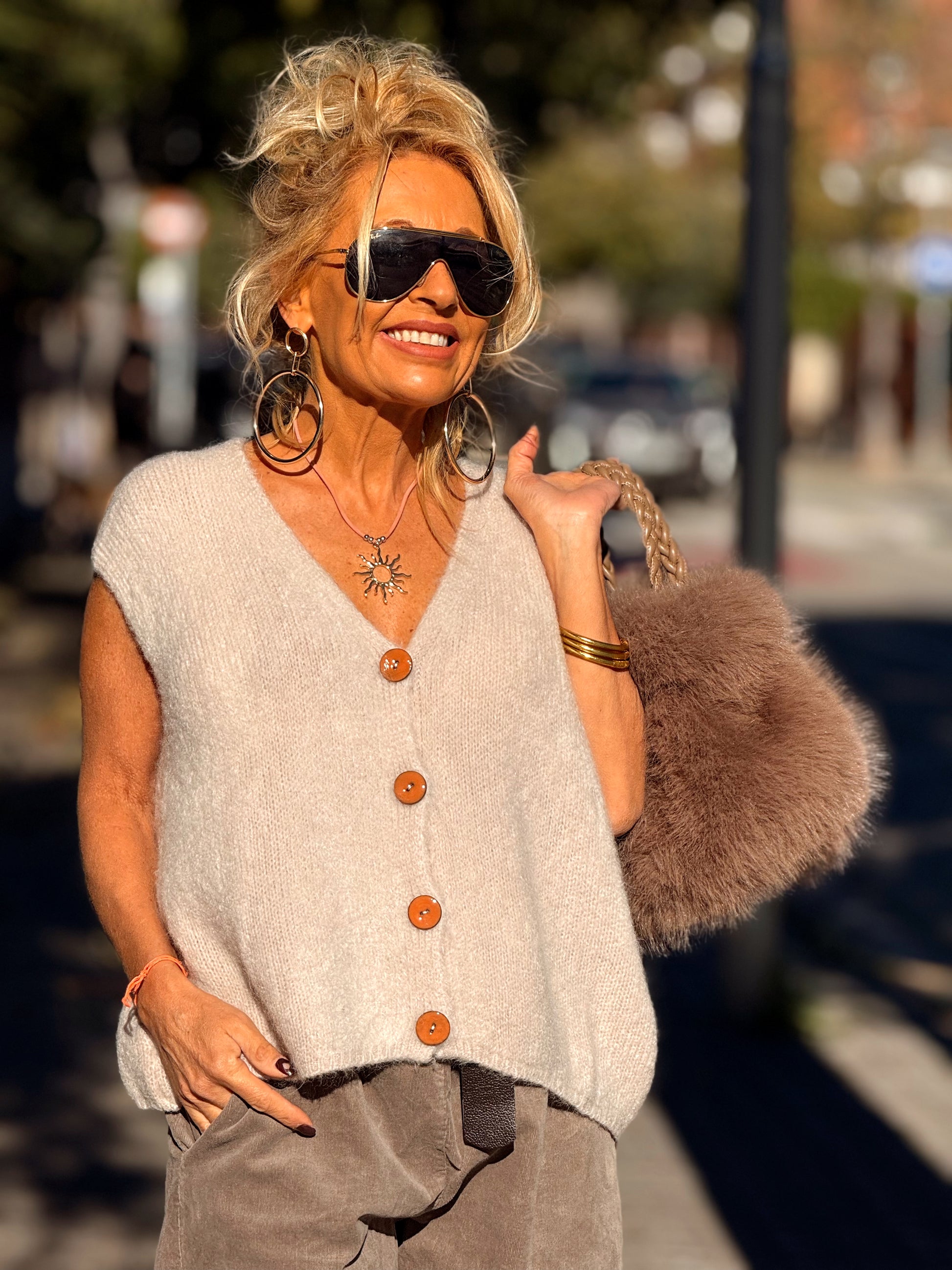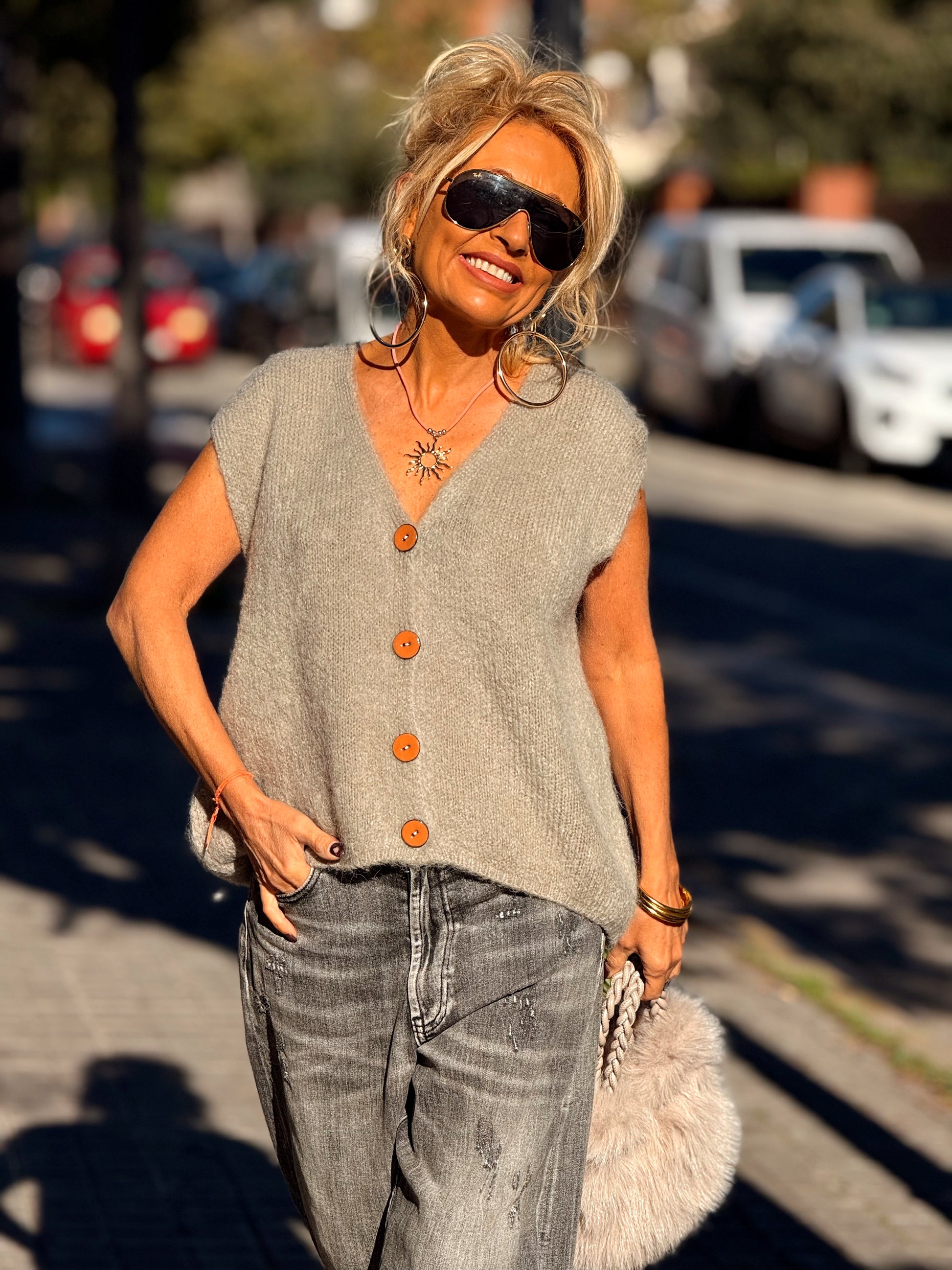 Chaleco de punto sin mangas, suave y cómodo, adornado con botones de coco que aportan un toque natural y refinado. Una prenda fácil de combinar e ideal para completar cualquier look.✨