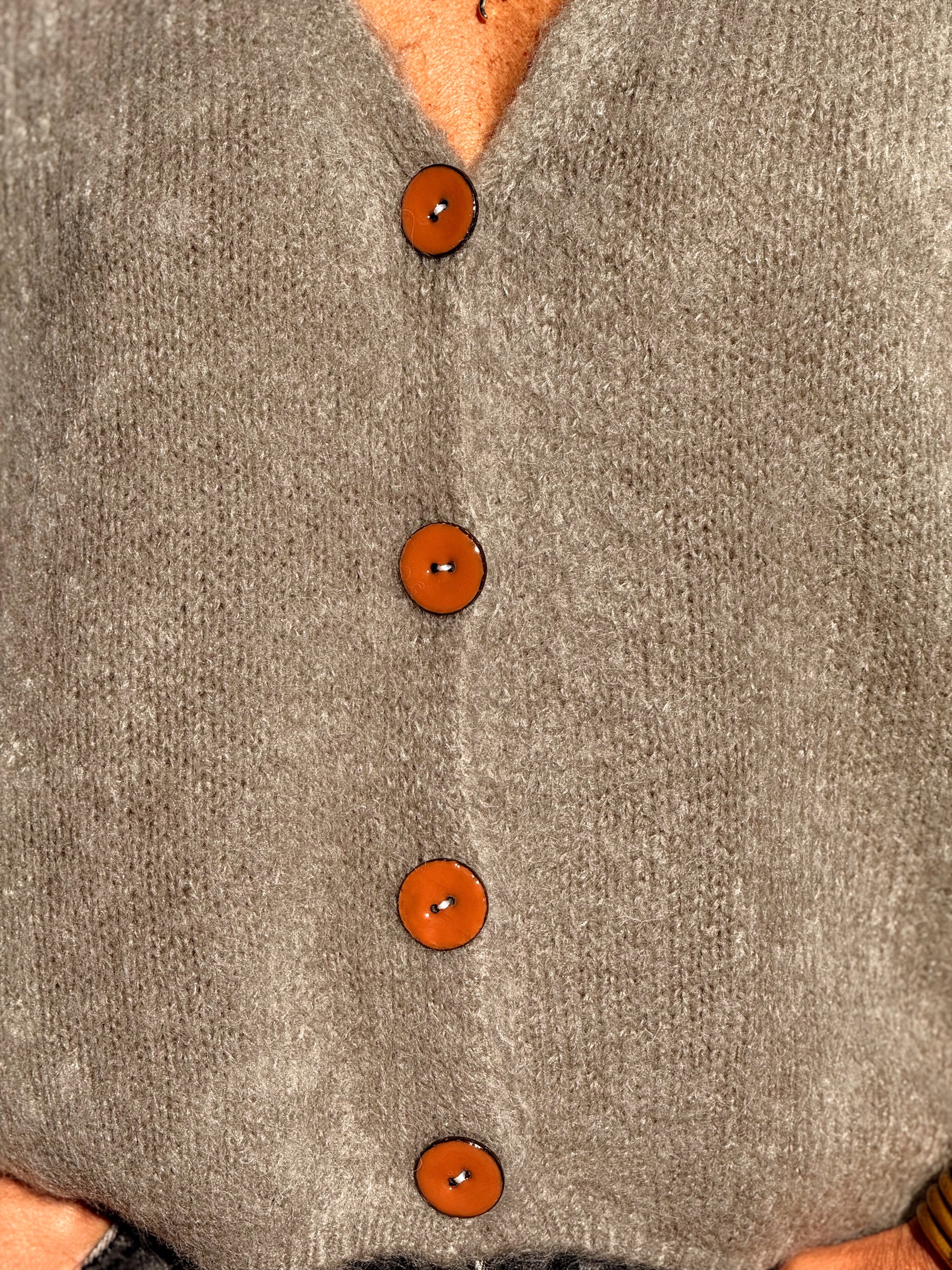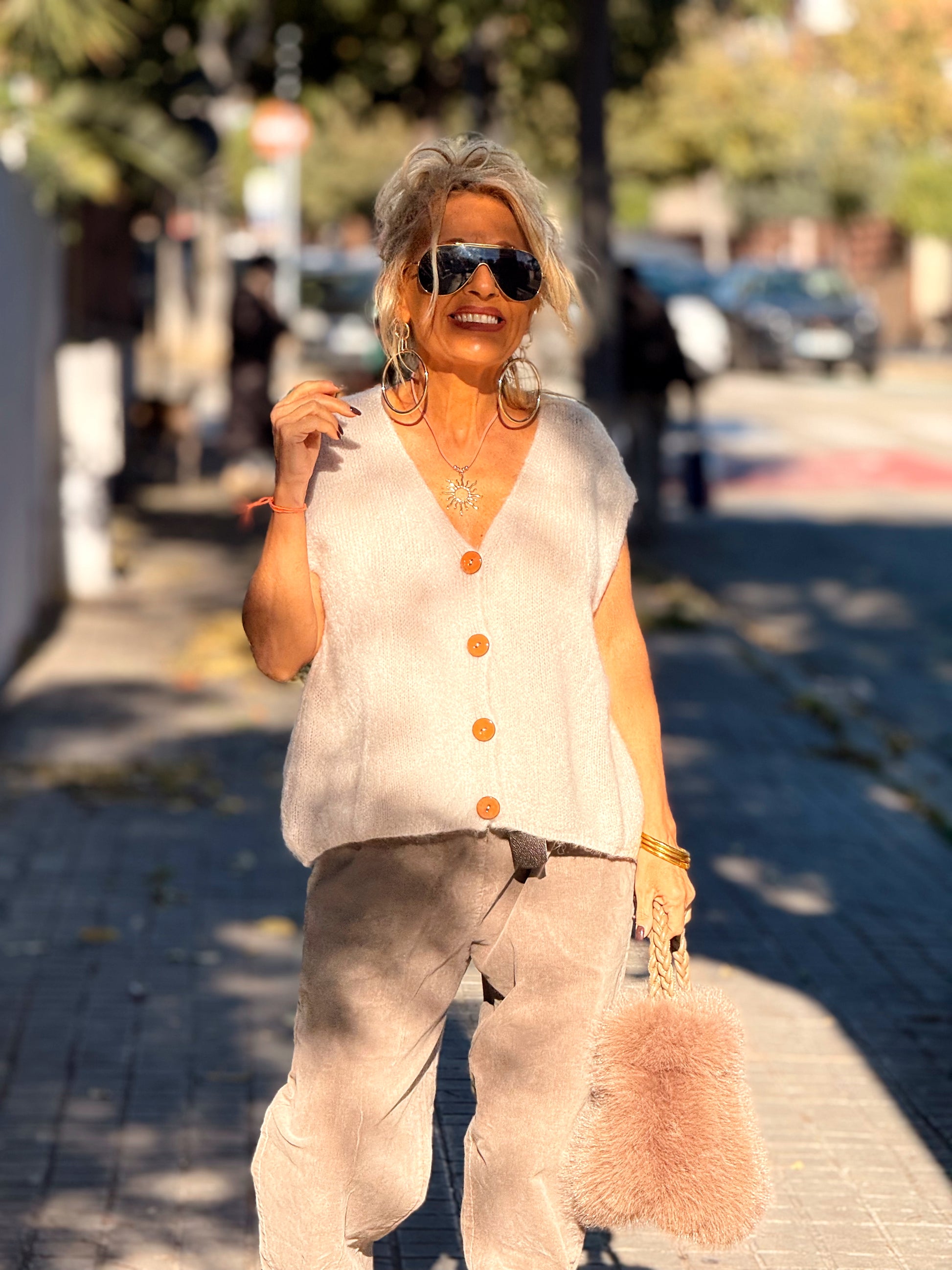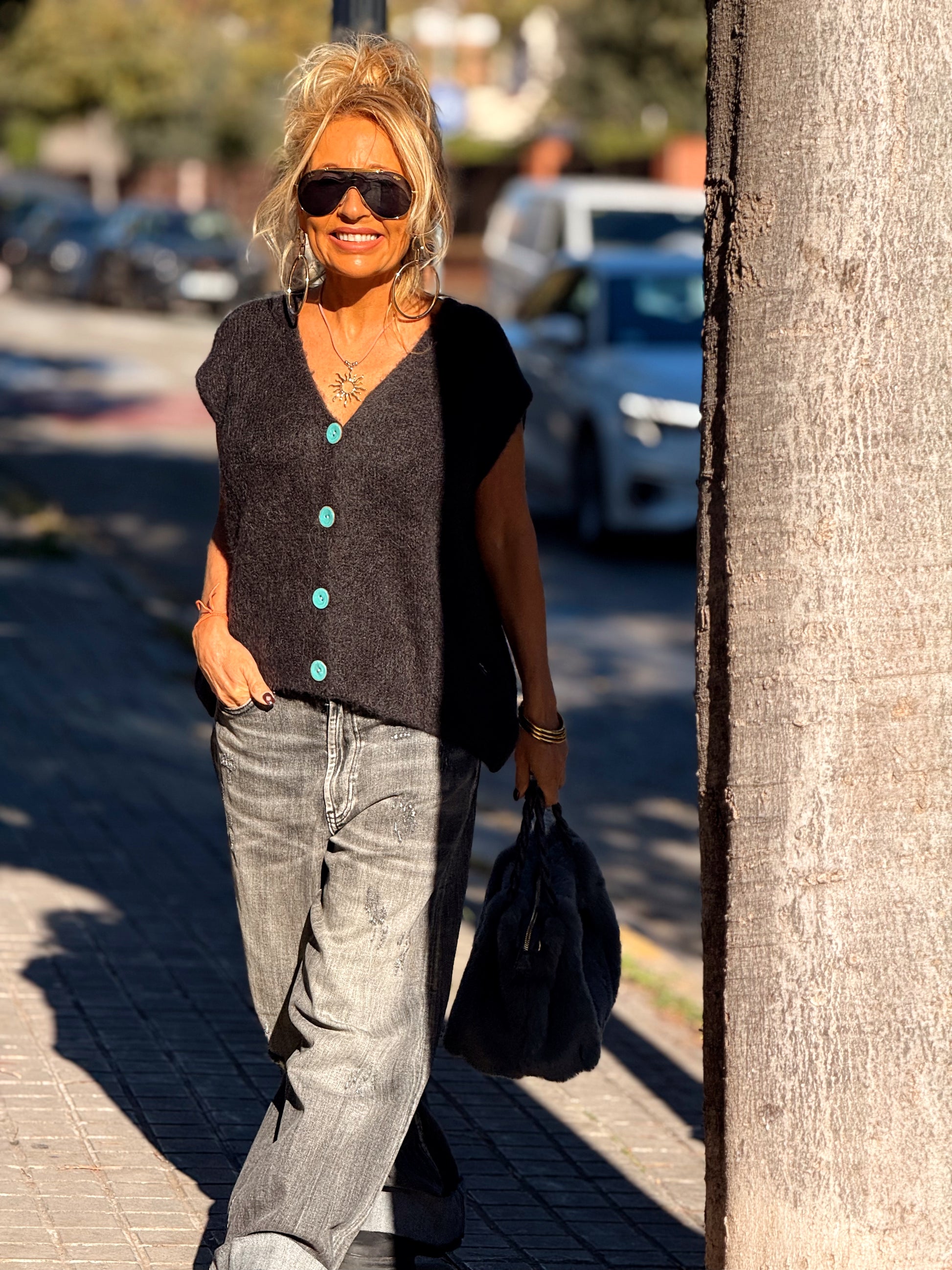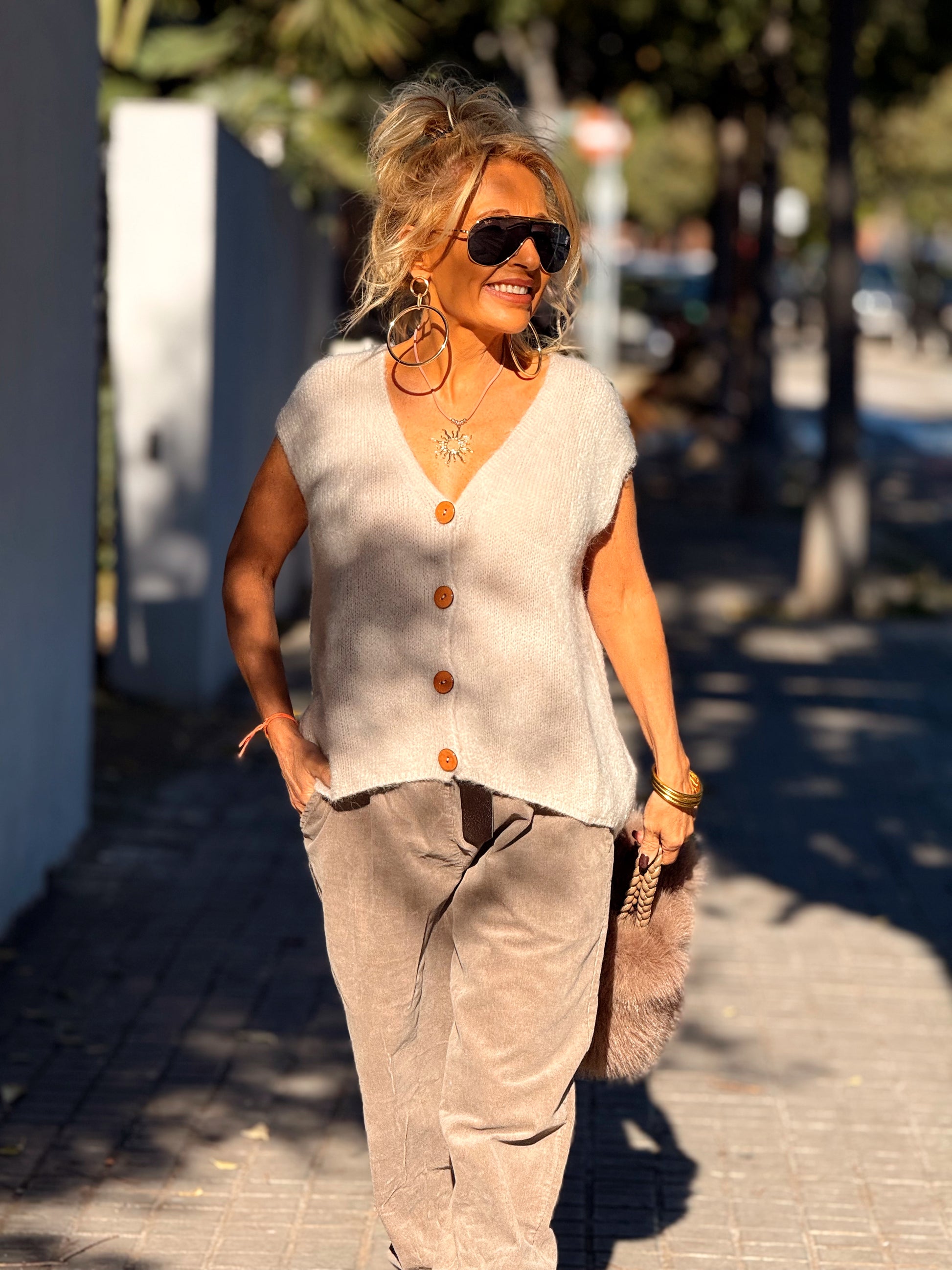 Chaleco de punto sin mangas, suave y cómodo, adornado con botones de coco que aportan un toque natural y refinado. Una prenda fácil de combinar e ideal para completar cualquier look.✨