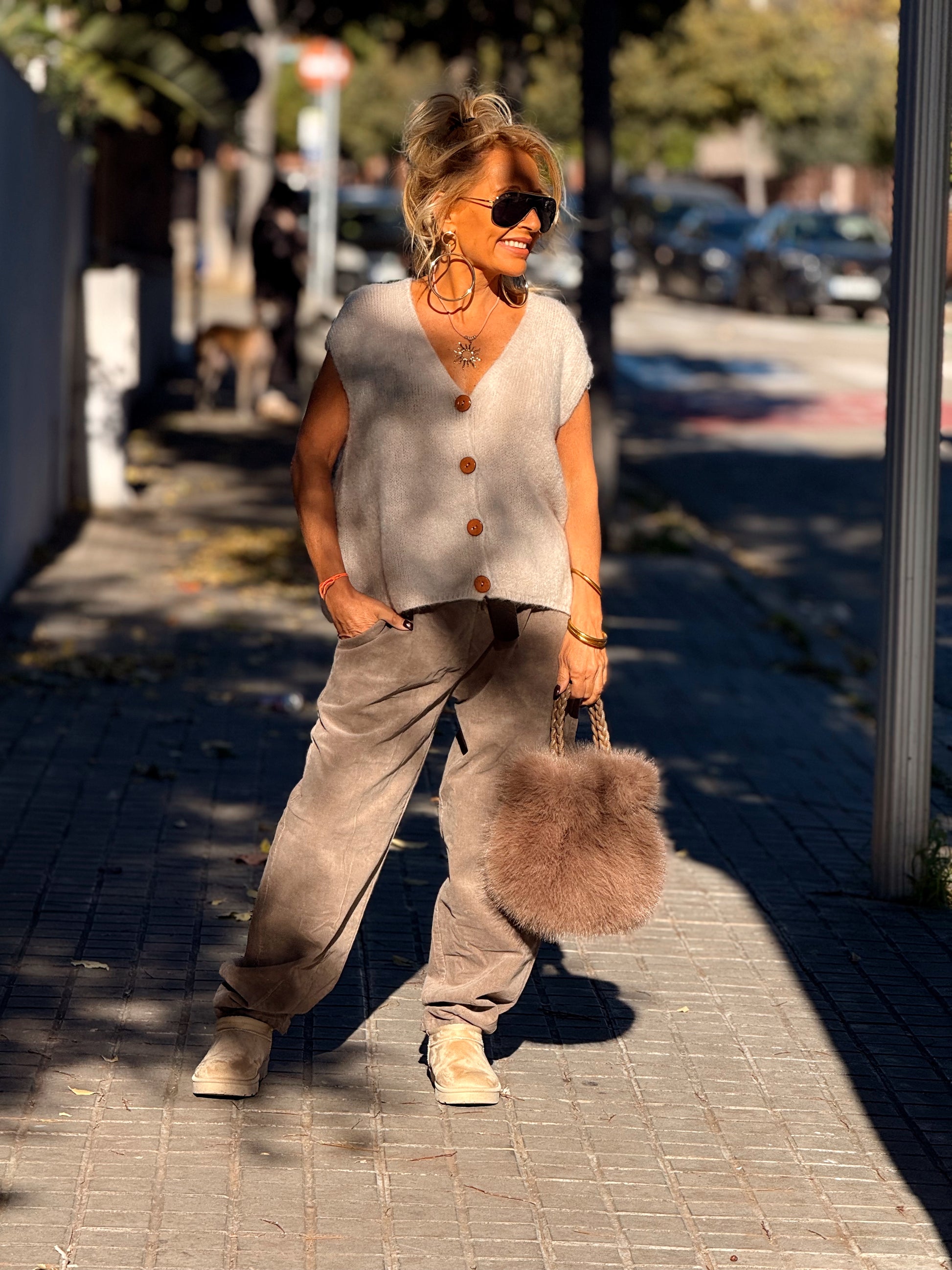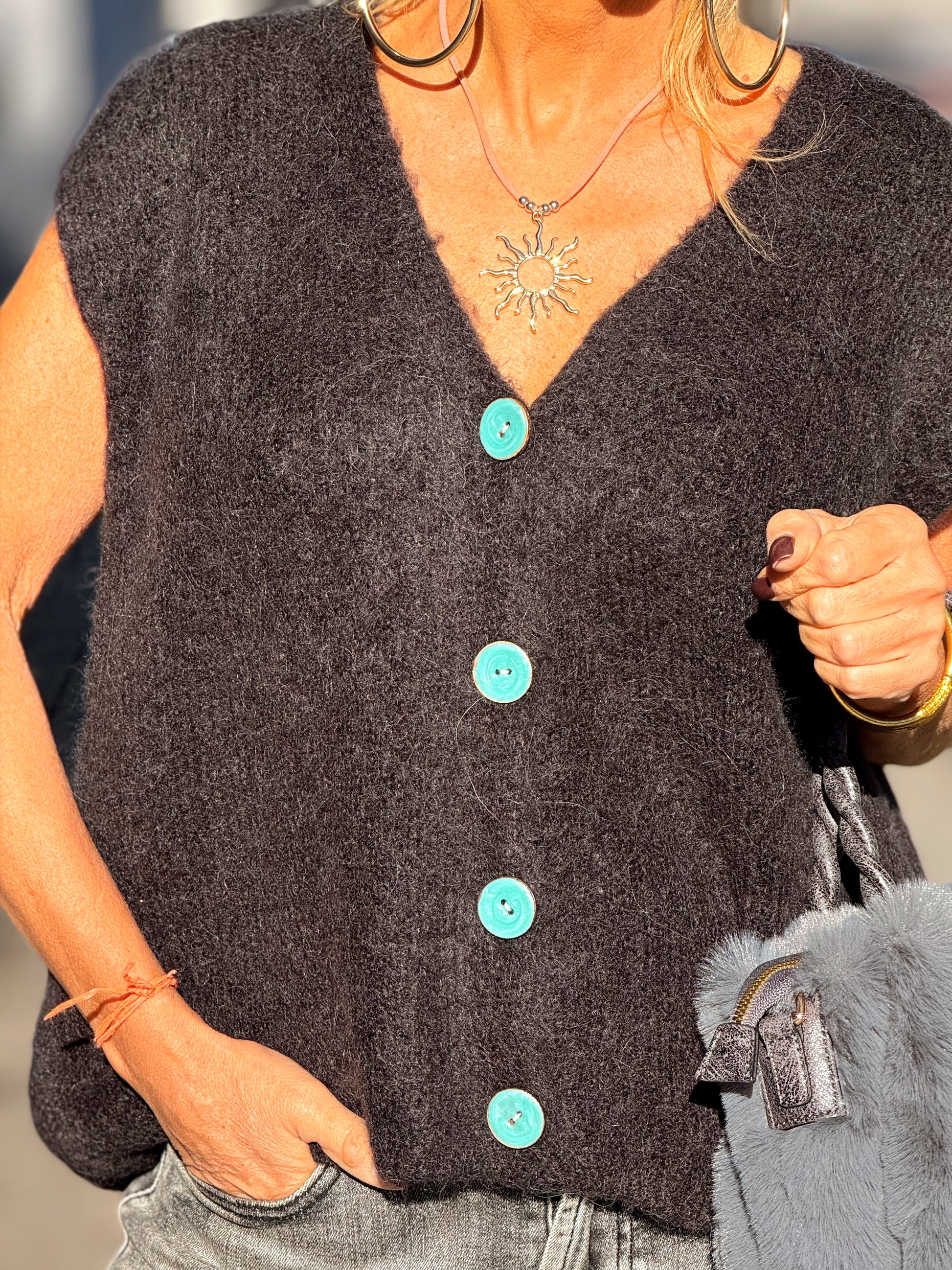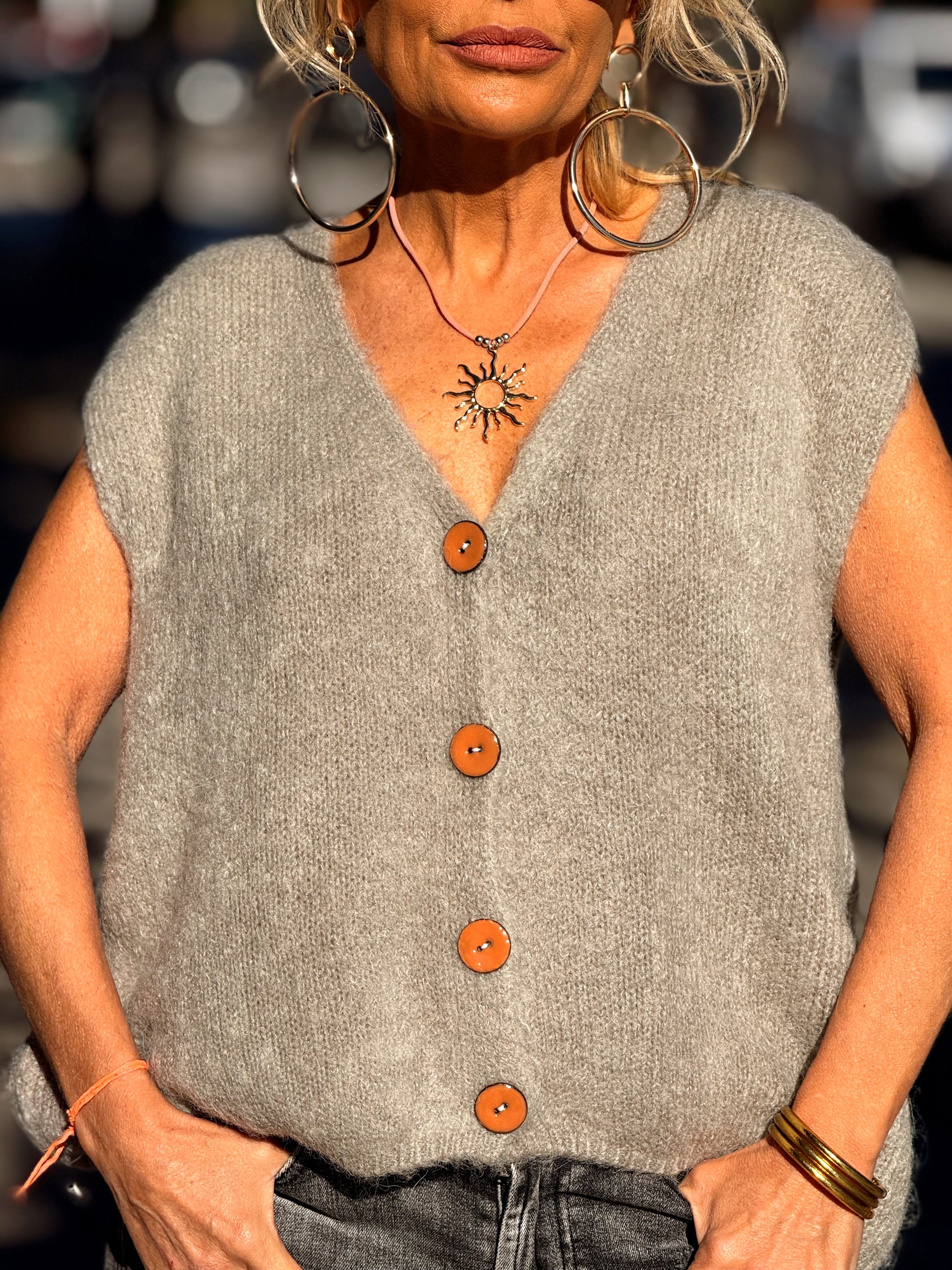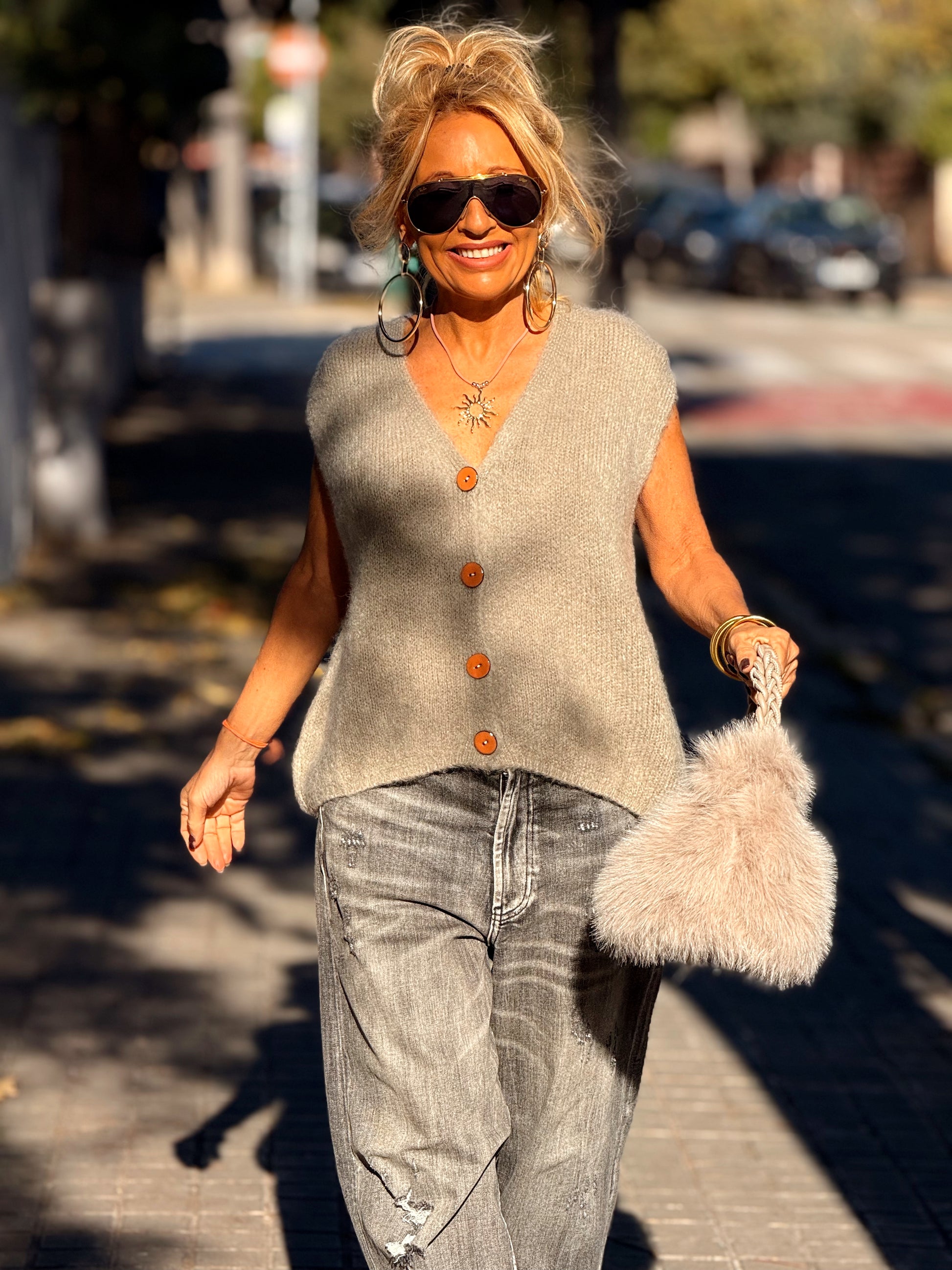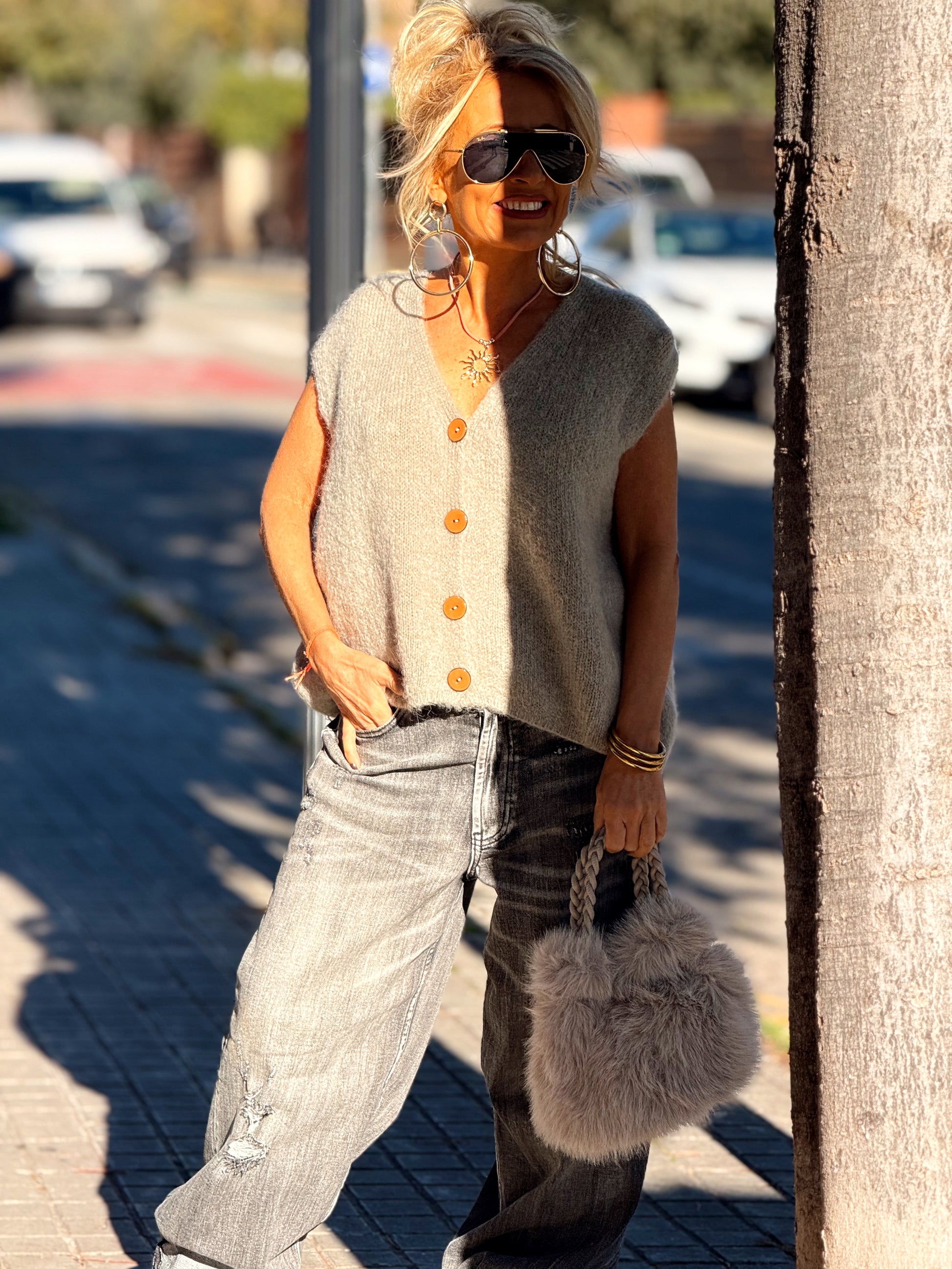 Chaleco de punto sin mangas, suave y cómodo, adornado con botones de coco que aportan un toque natural y refinado. Una prenda fácil de combinar e ideal para completar cualquier look.✨