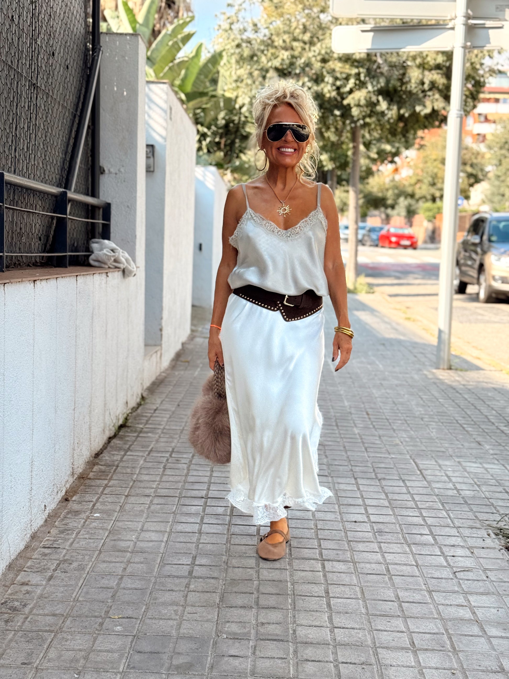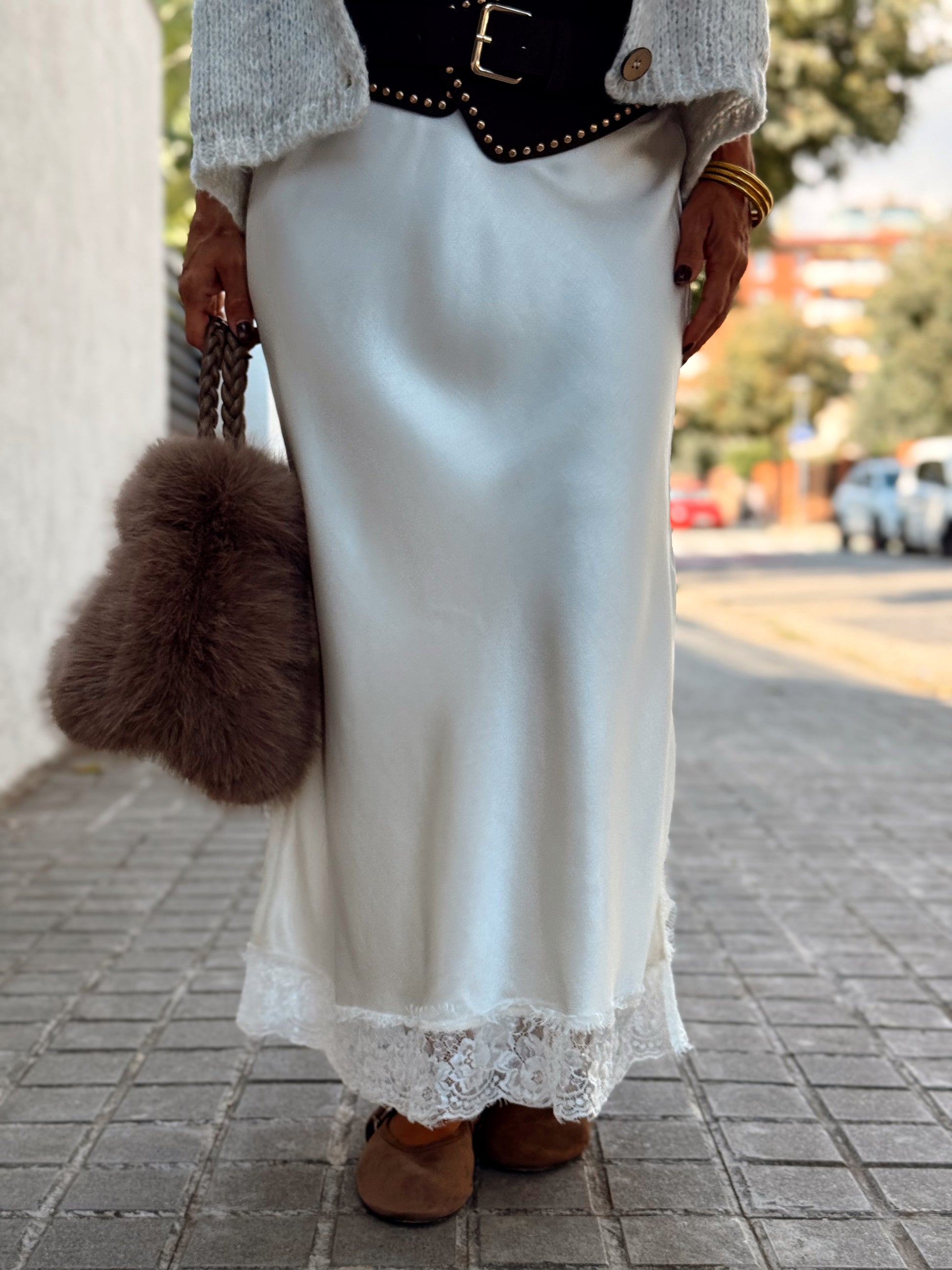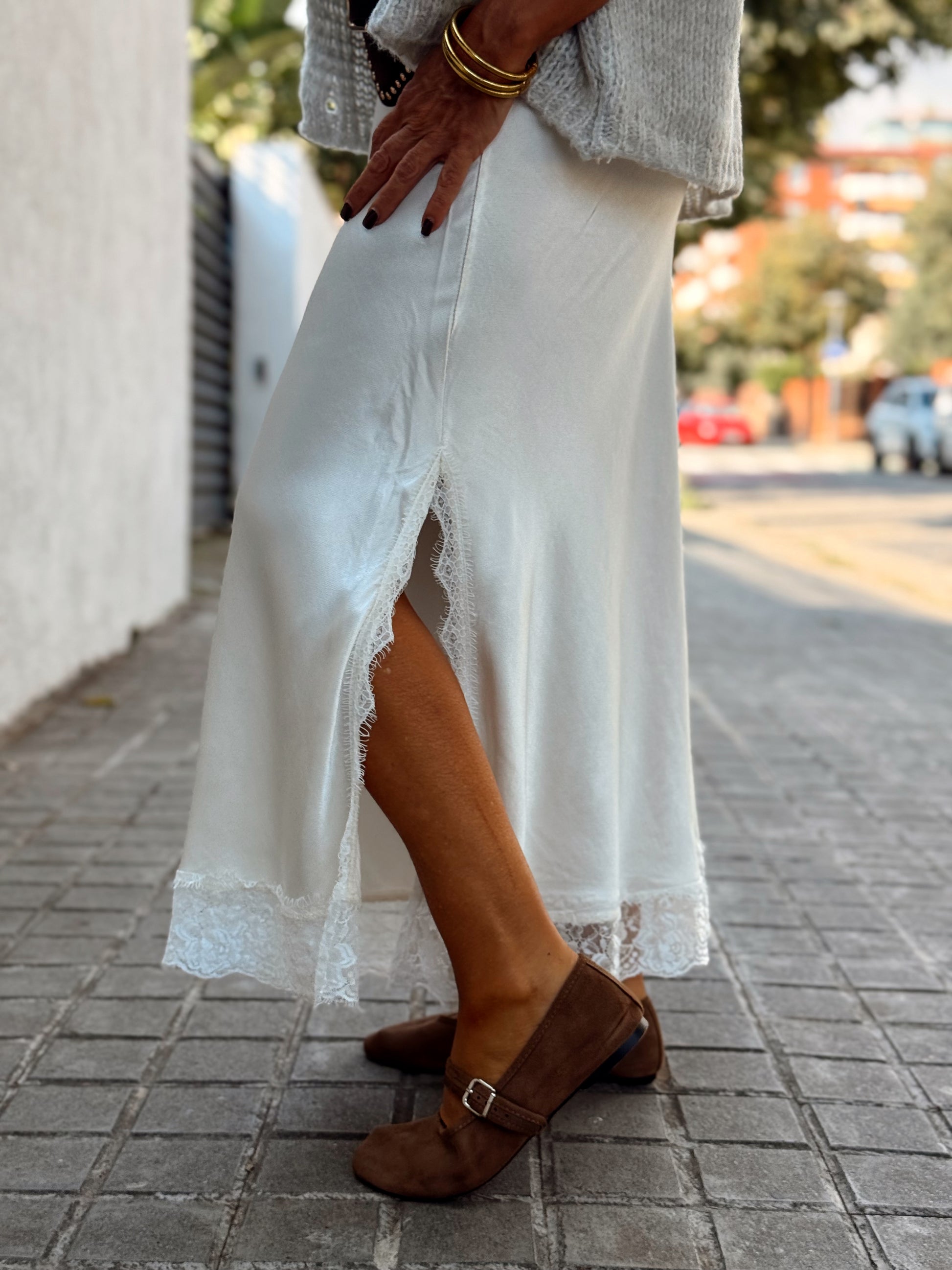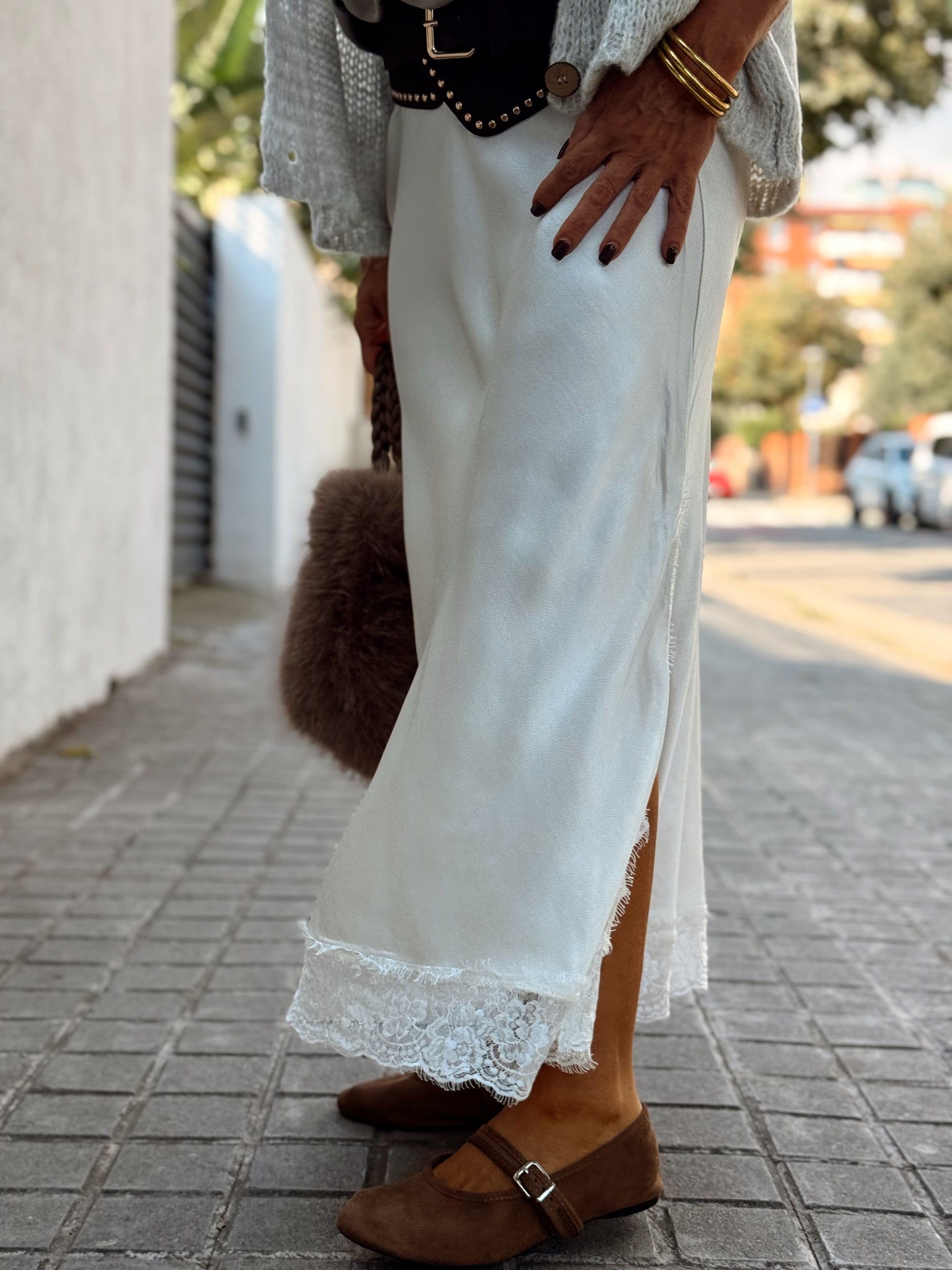 Falda 100 % viscosa, con un acabado de encaje y una delicada abertura lateral adornada también con encaje. Femenina, ligera y sofisticada, es la prenda ideal para lucir un estilo elegante y con un toque de sensualidad esta temporada.✨