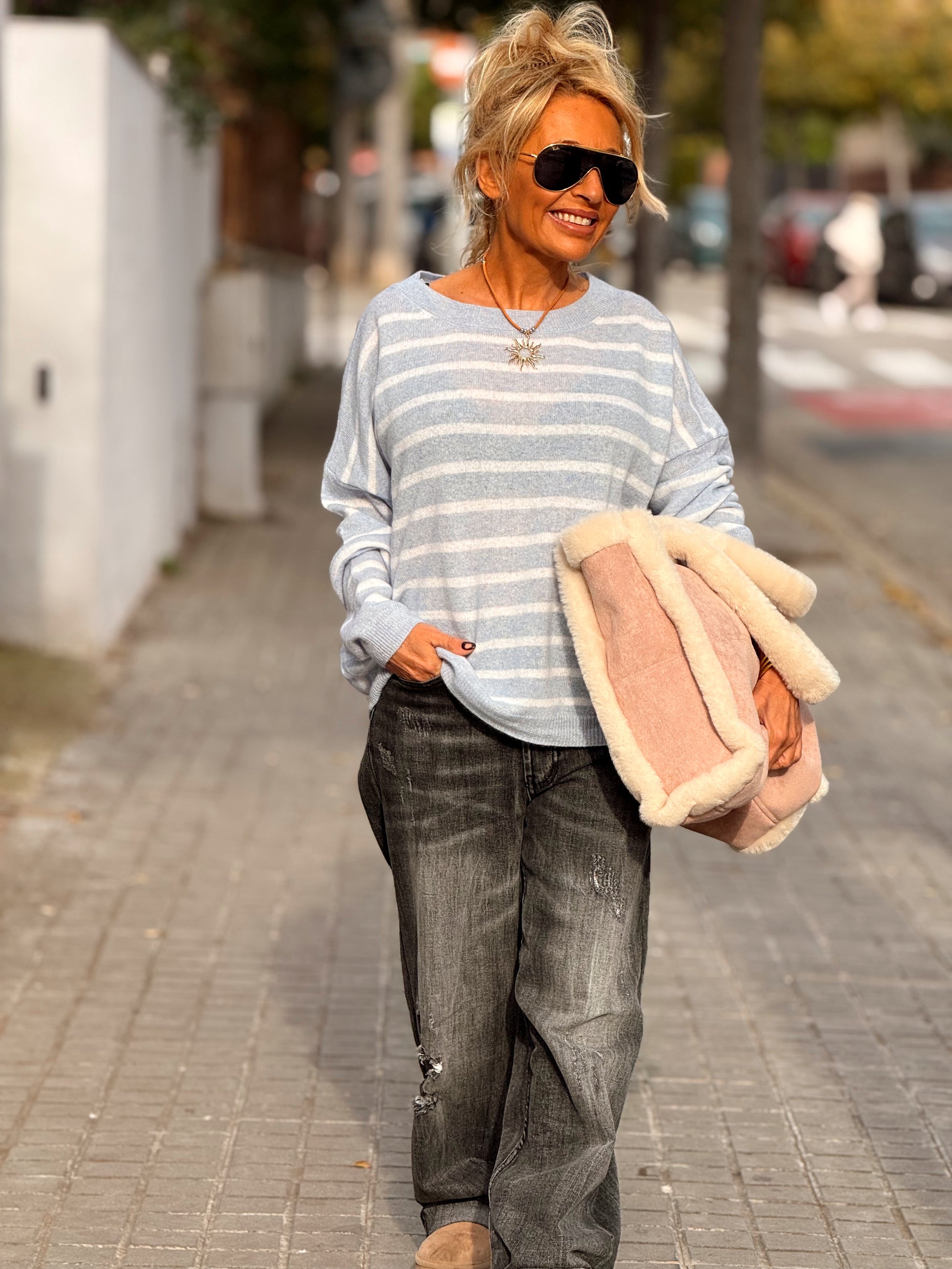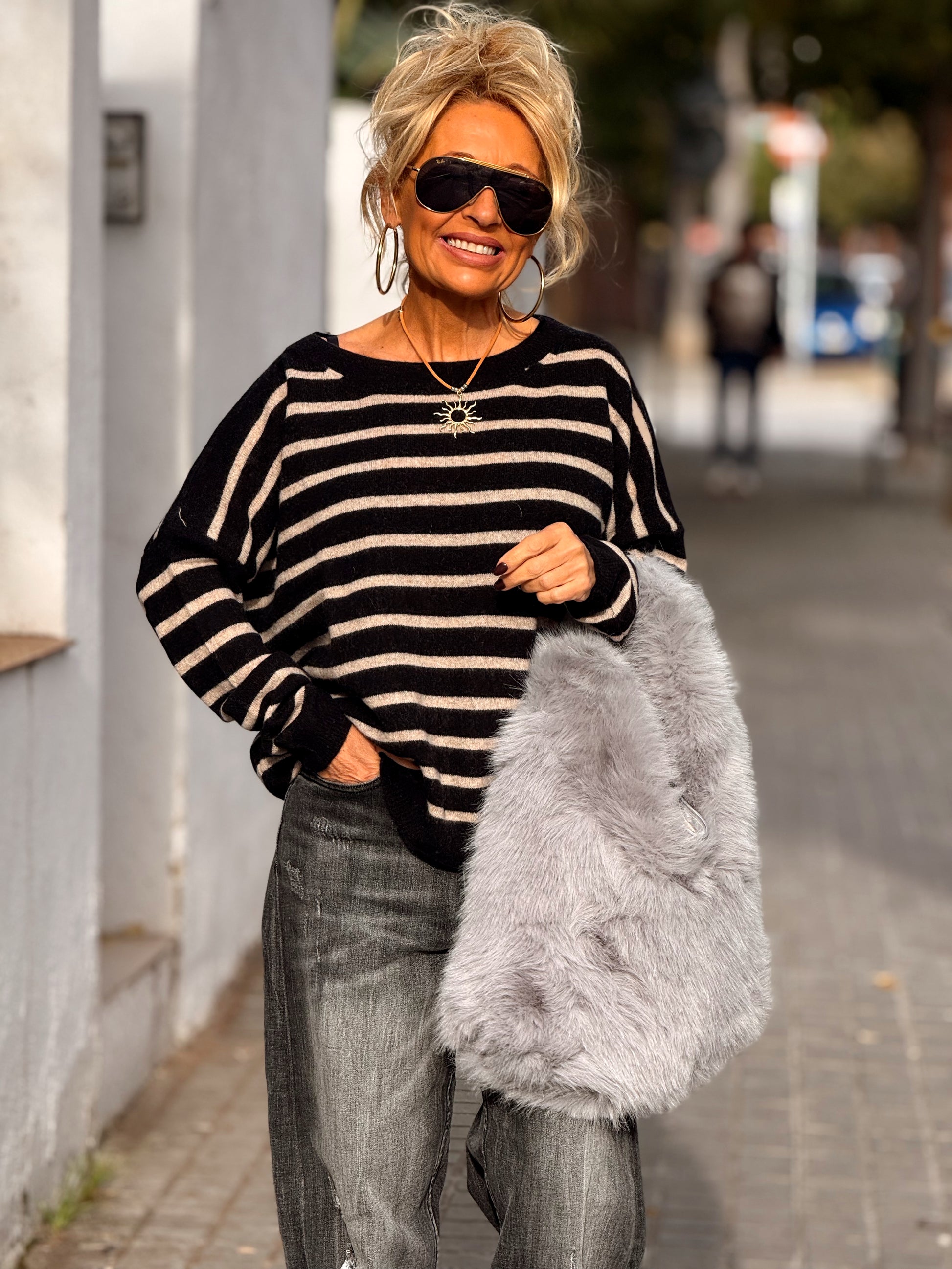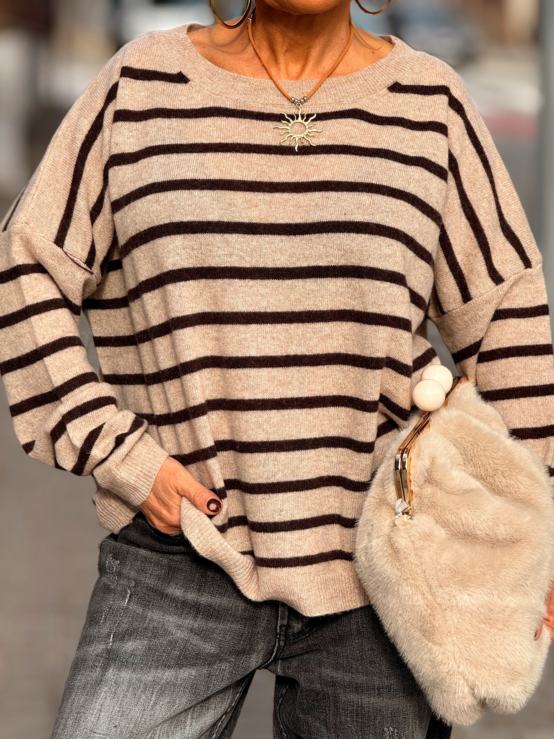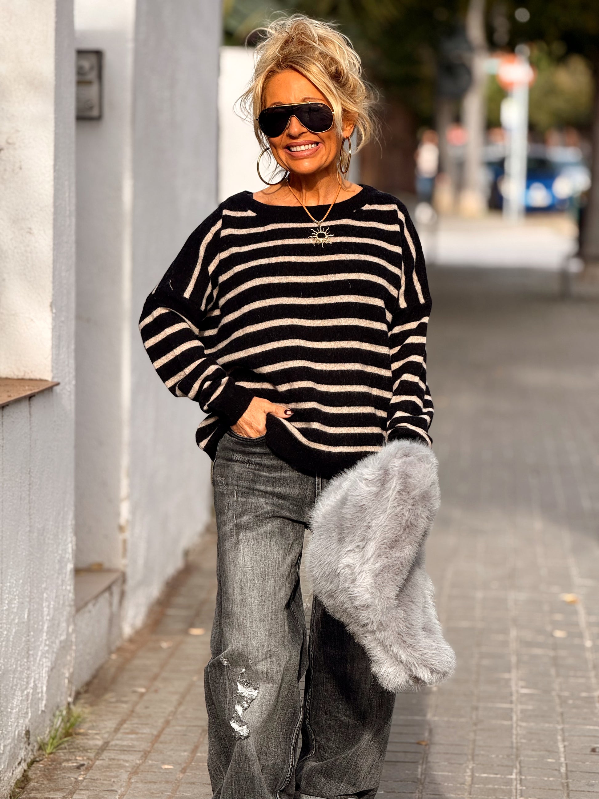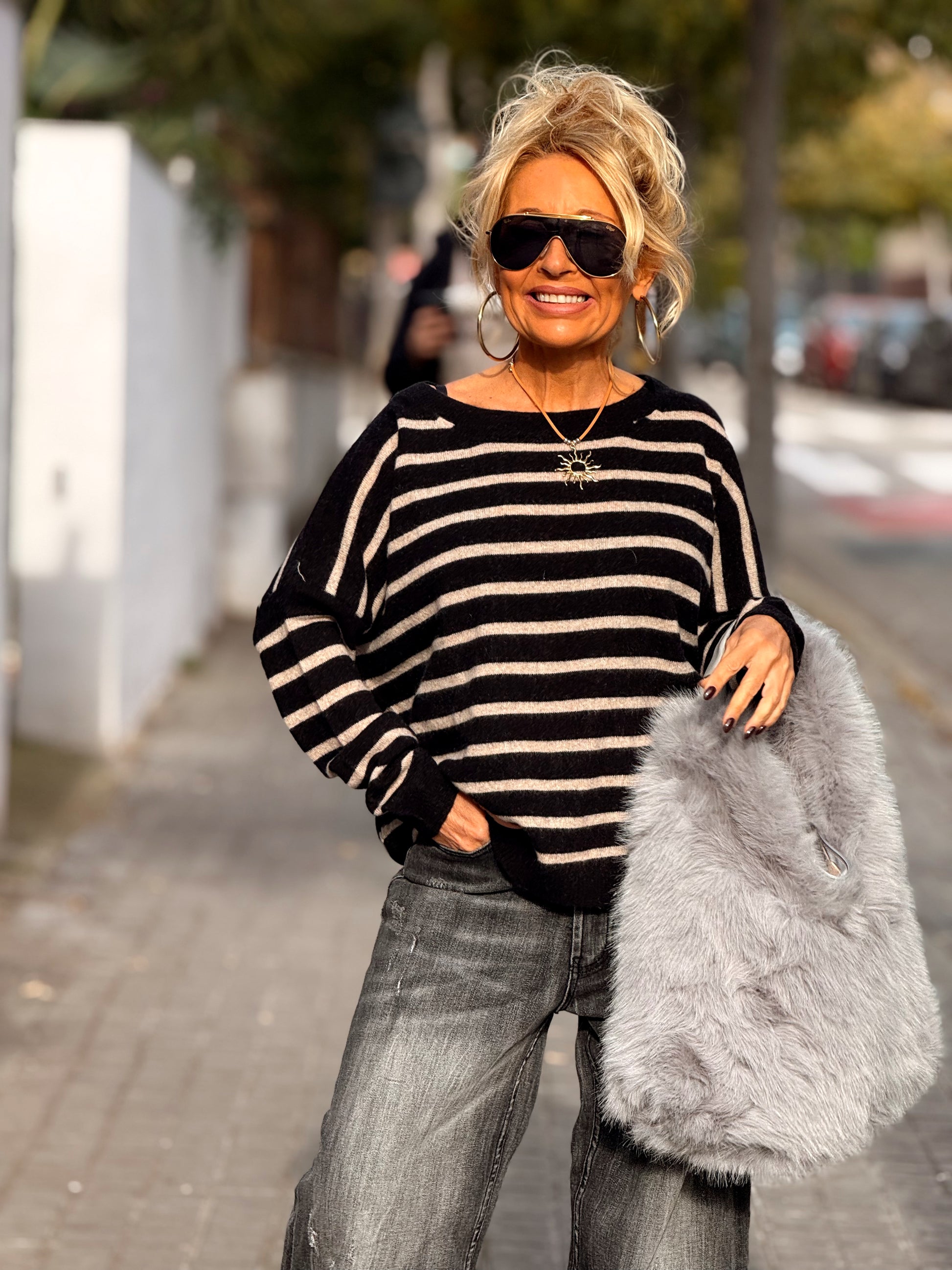 Jersey de lana 100%: una prenda realmente preciosa. Es extremadamente suave, muy agradable de llevar y no pica en absoluto. Un básico imprescindible en cualquier armario. Las rayas aportan un toque elegante y sofisticado.✨