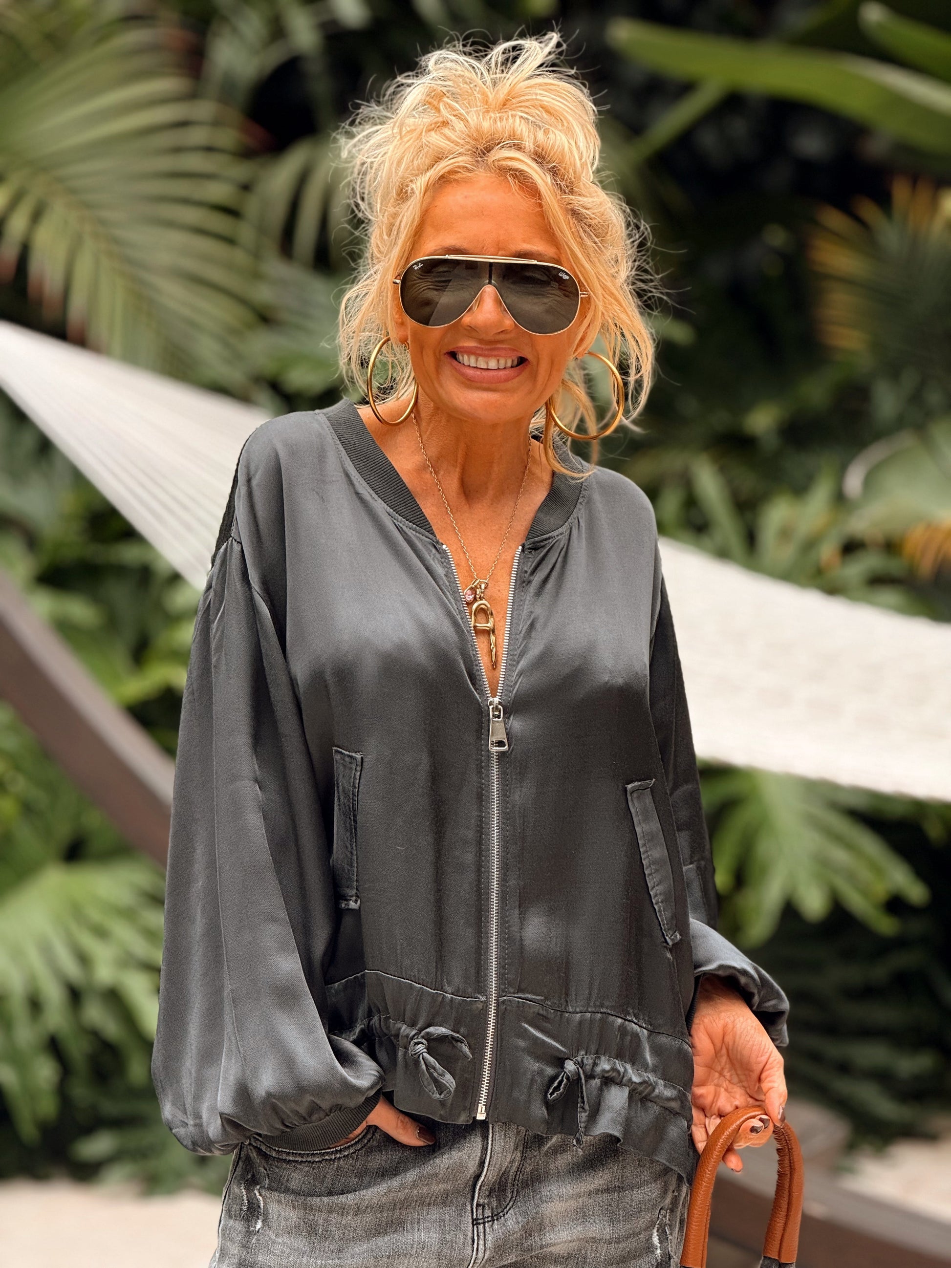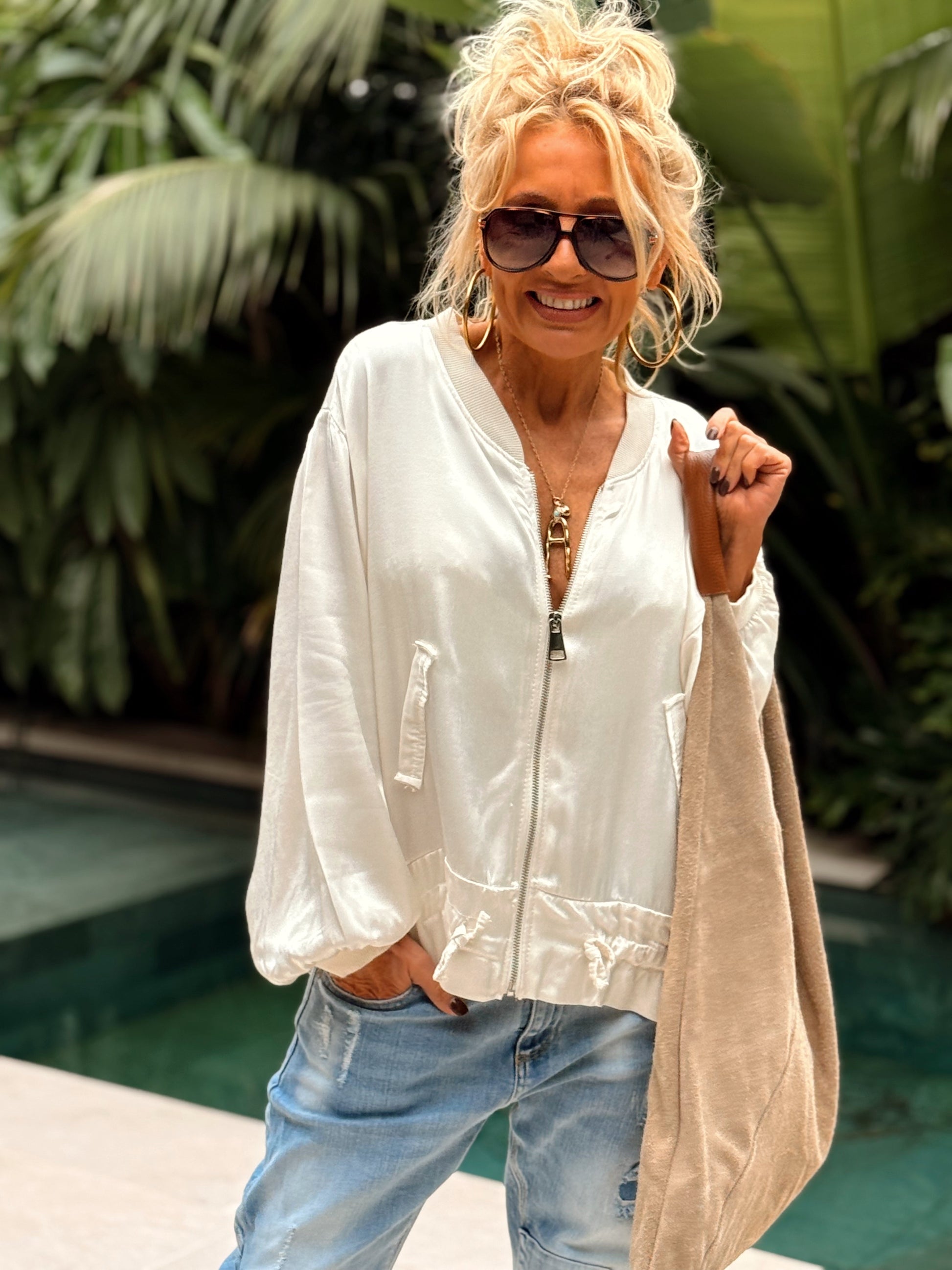 Este bomber, confeccionado 100% en viscosa, es muy agradable al tacto y puede combinarse con cualquier conjunto, añadiendo un toque de estilo y confort a tu look.✨