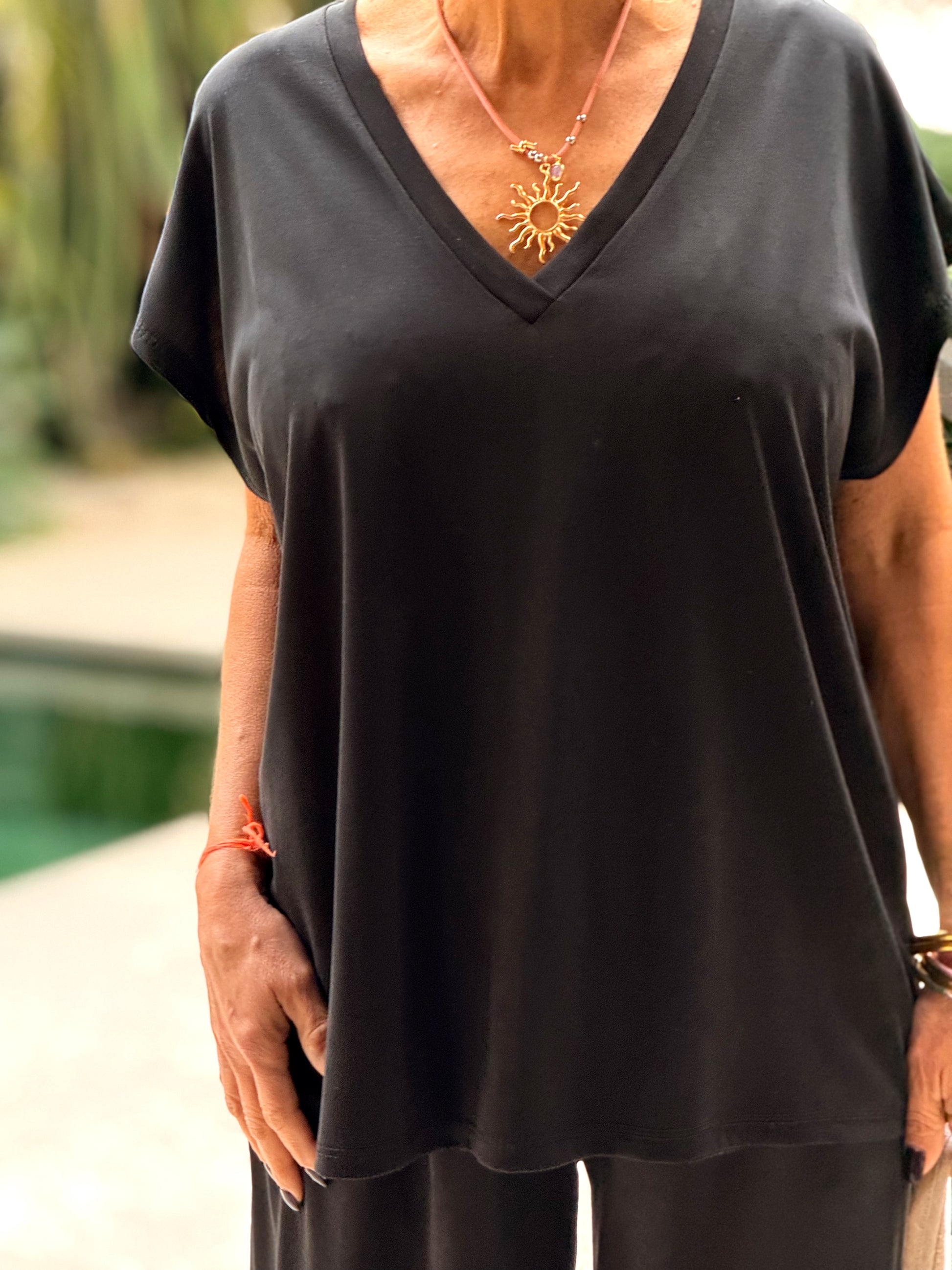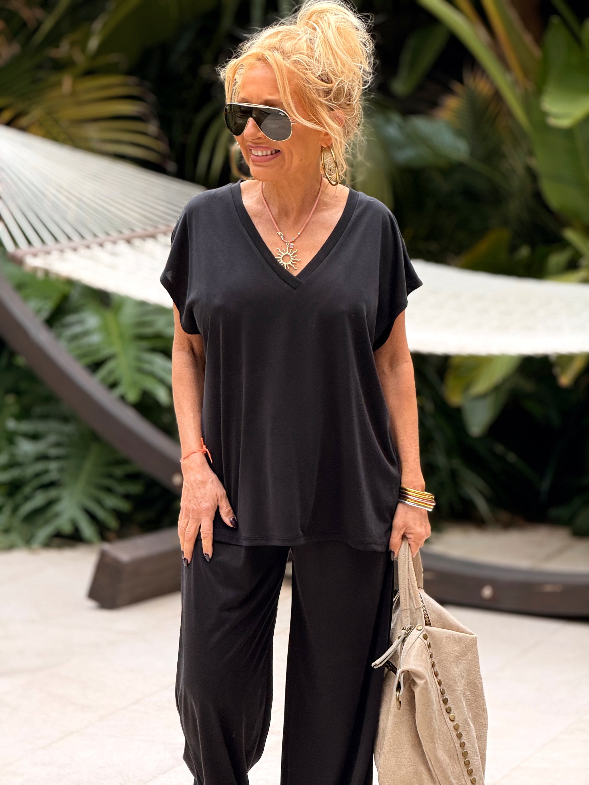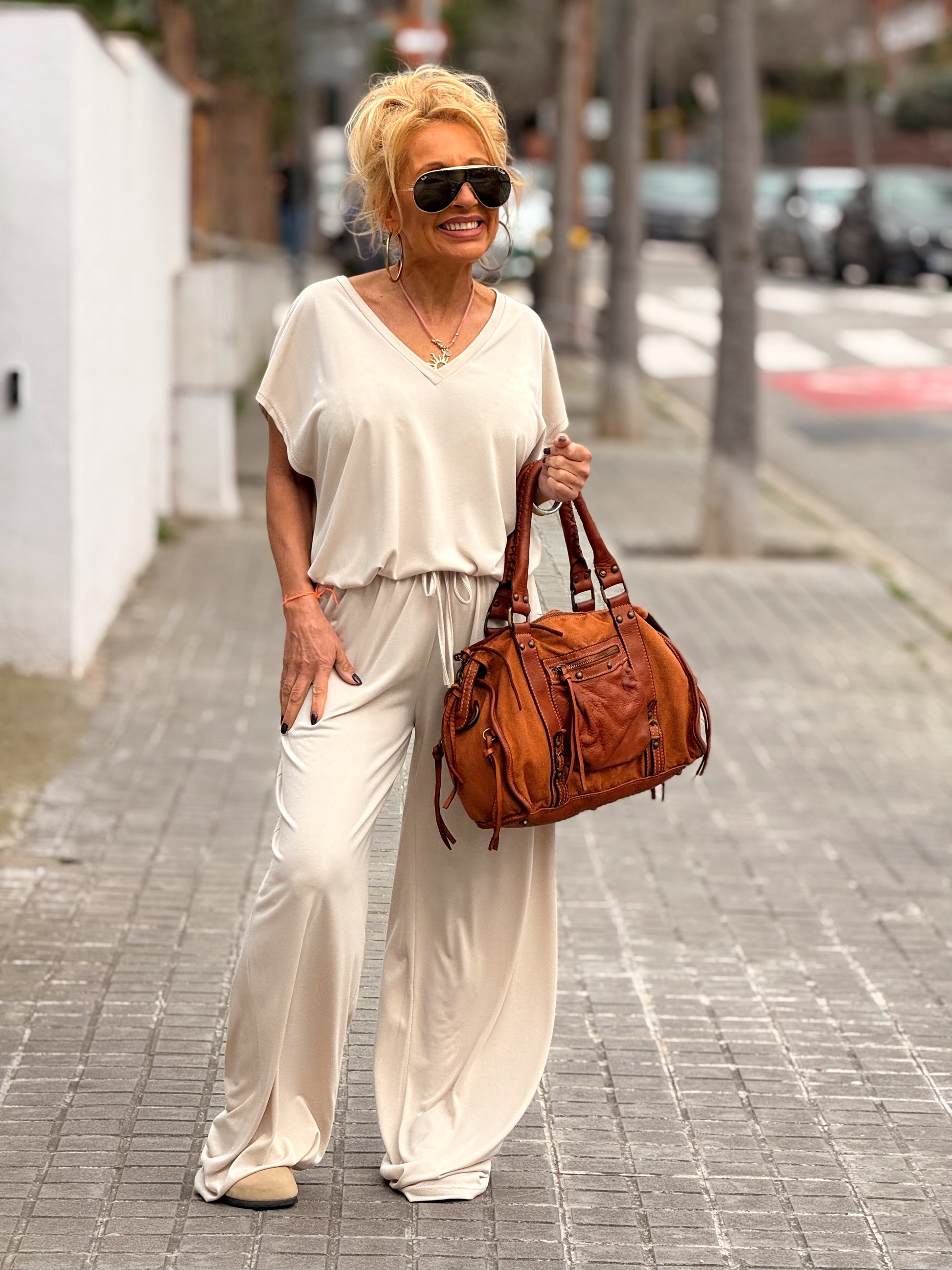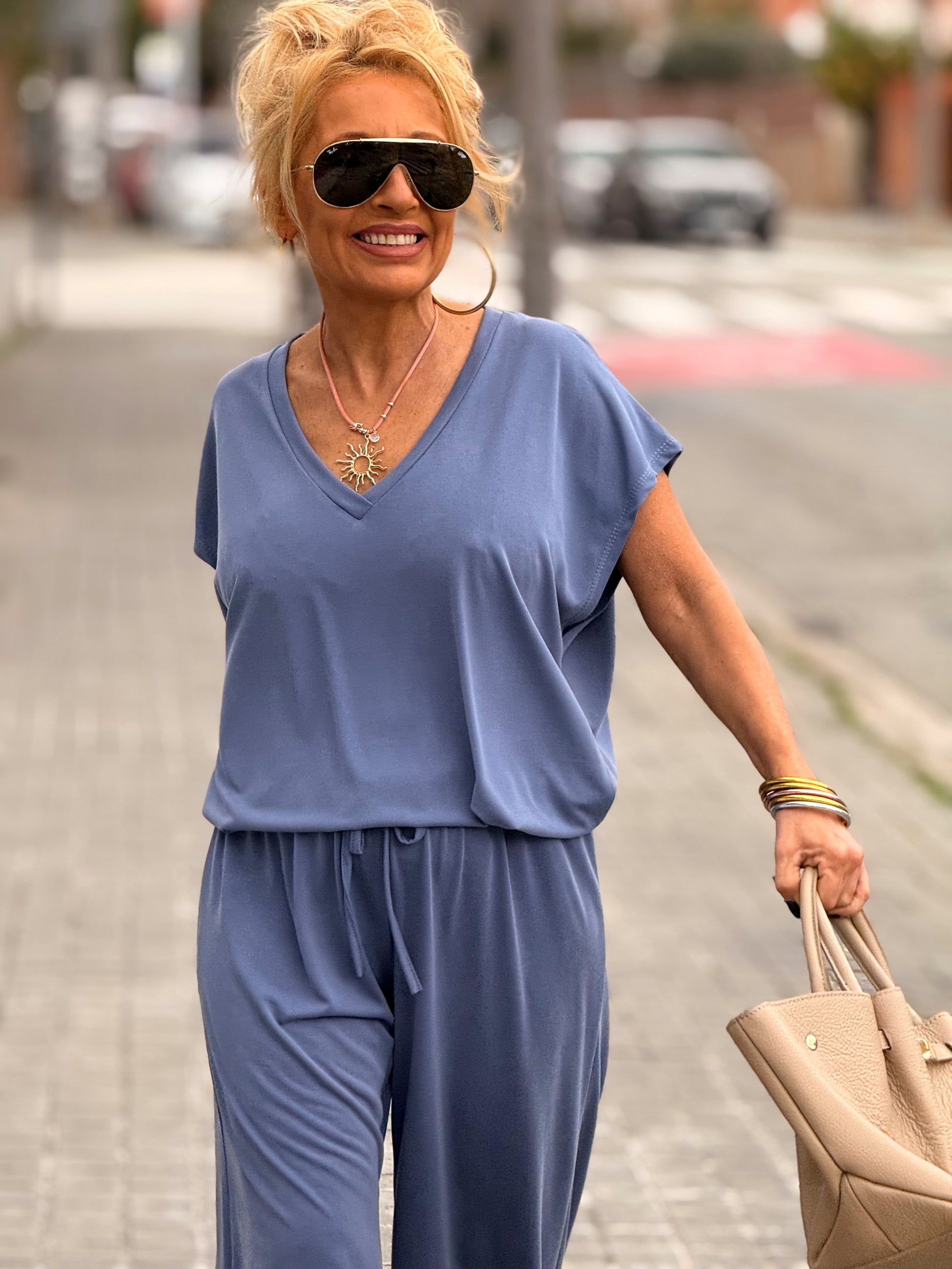 Conjunto espectacular, increíblemente cómodo de llevar. Está confeccionado en una mezcla de viscosa y poliéster, ligera y prácticamente infalible contra las arrugas, ideal para el día a día o para viajar sin preocupaciones.