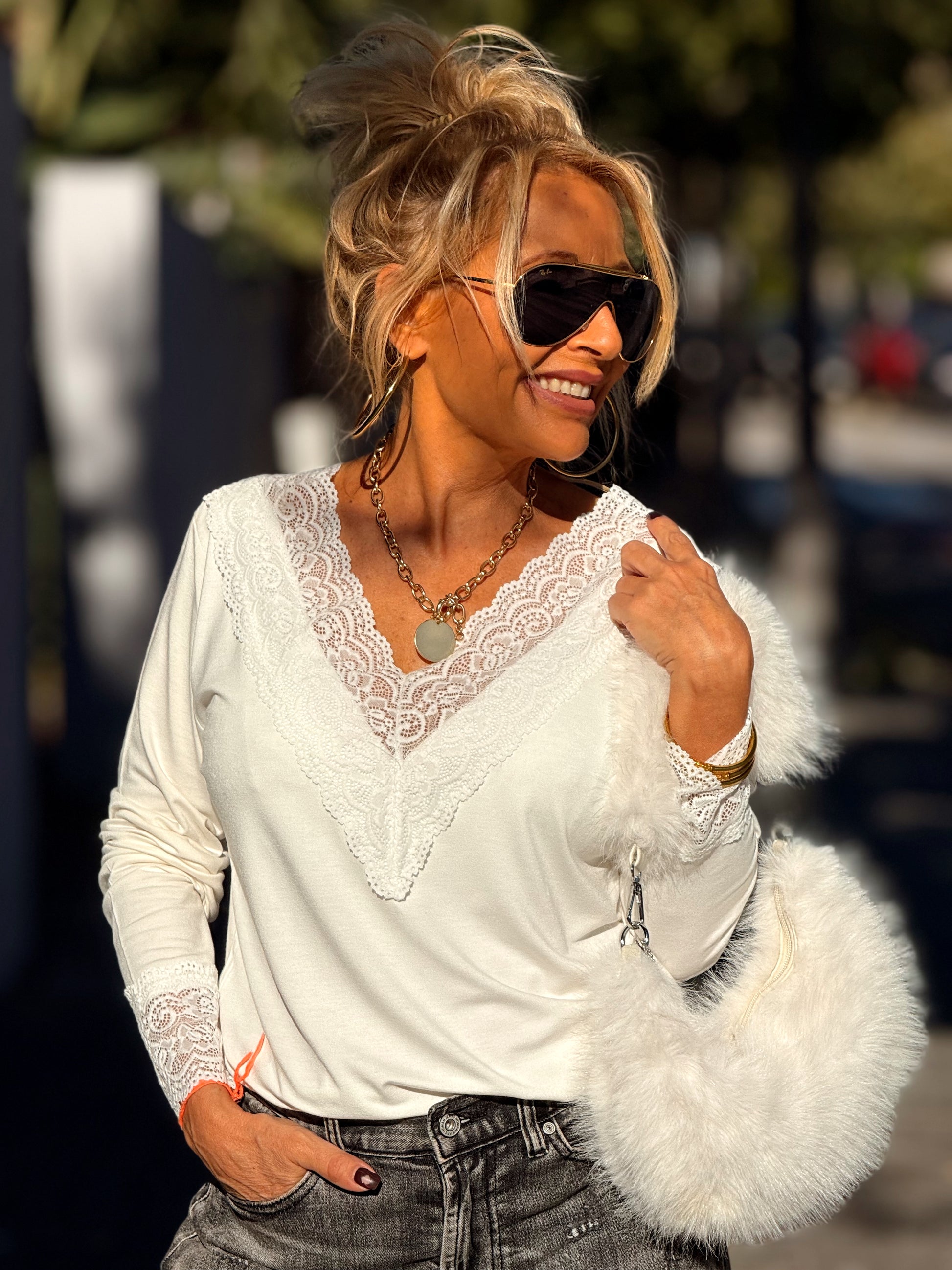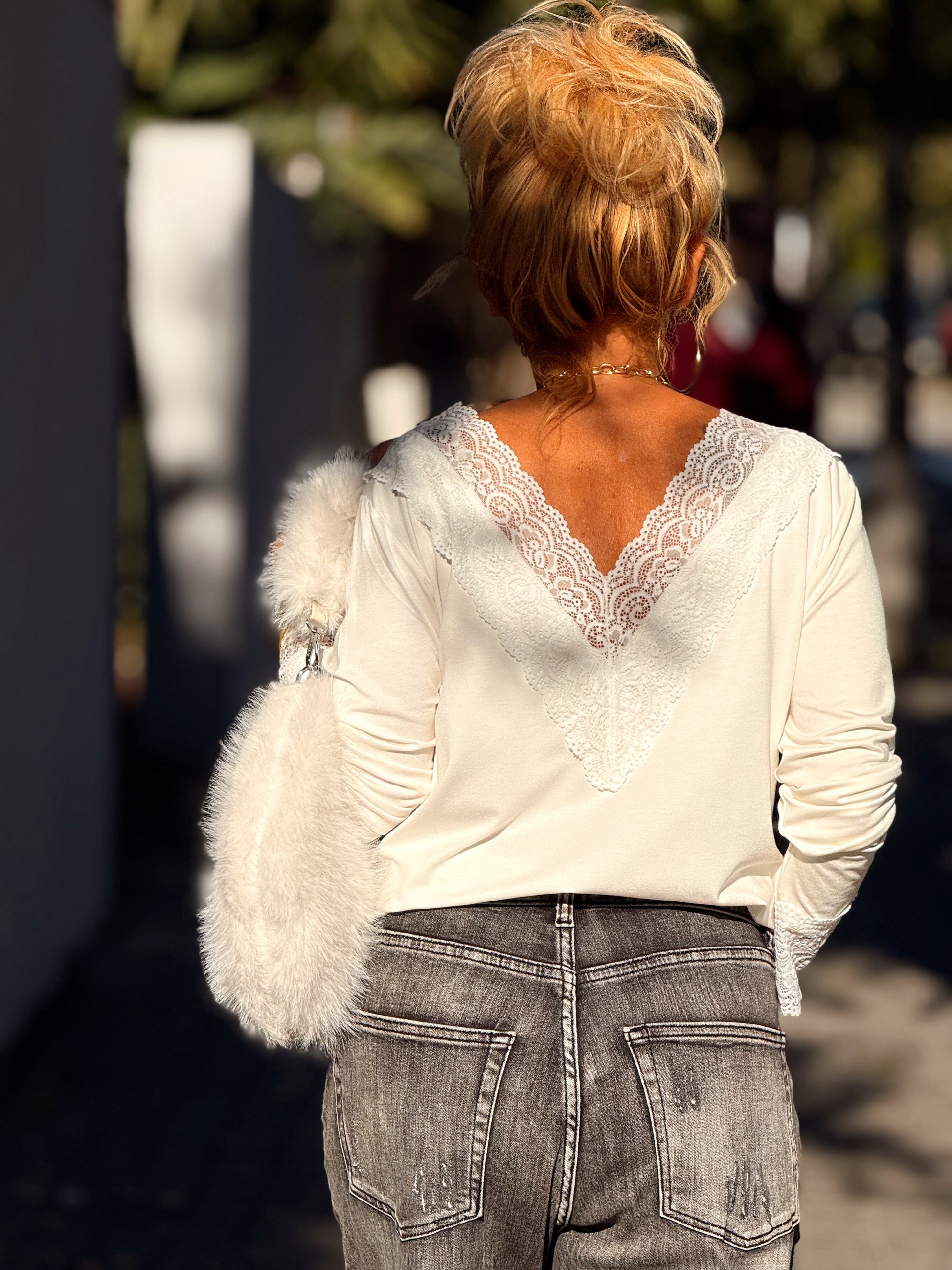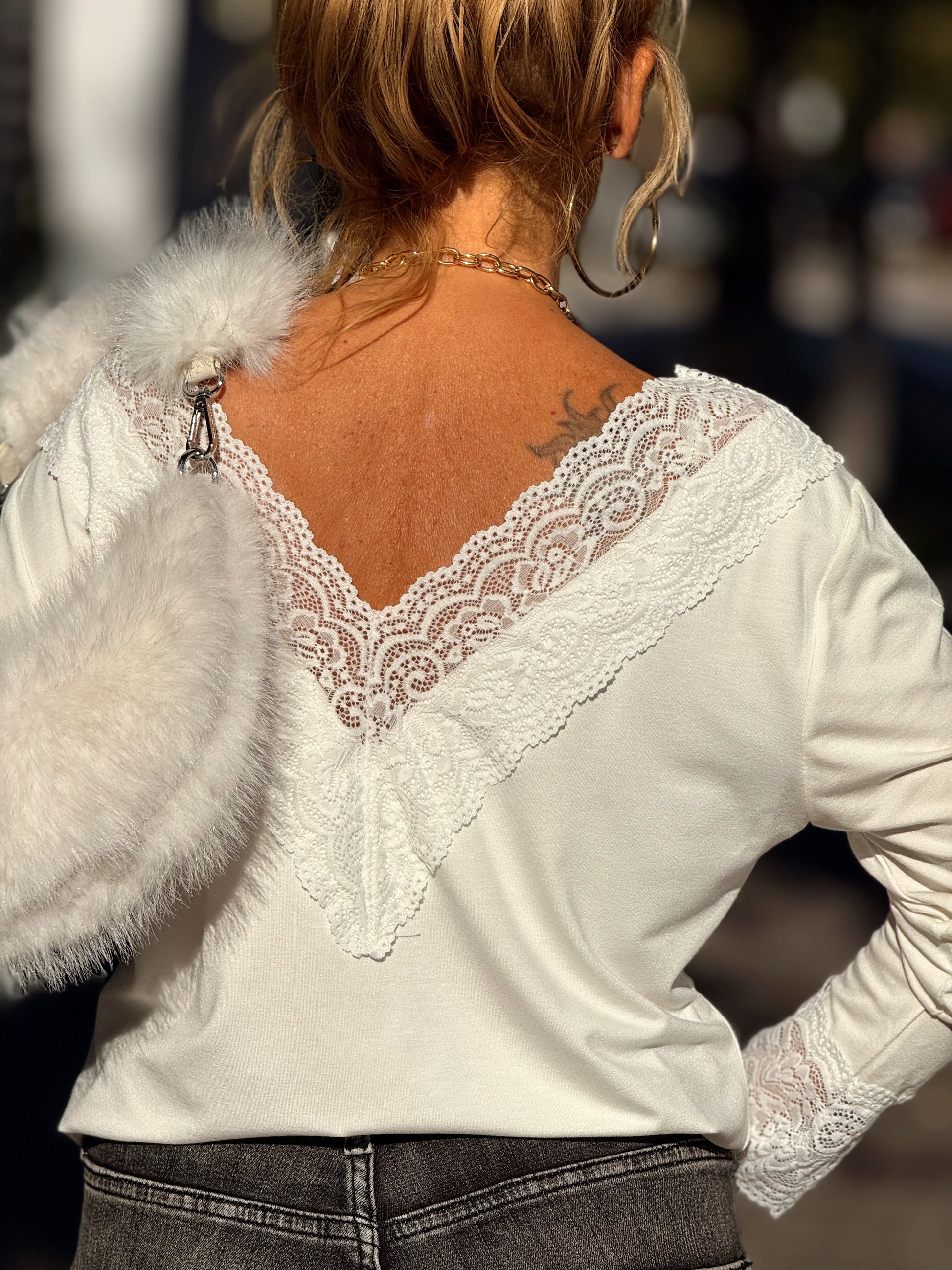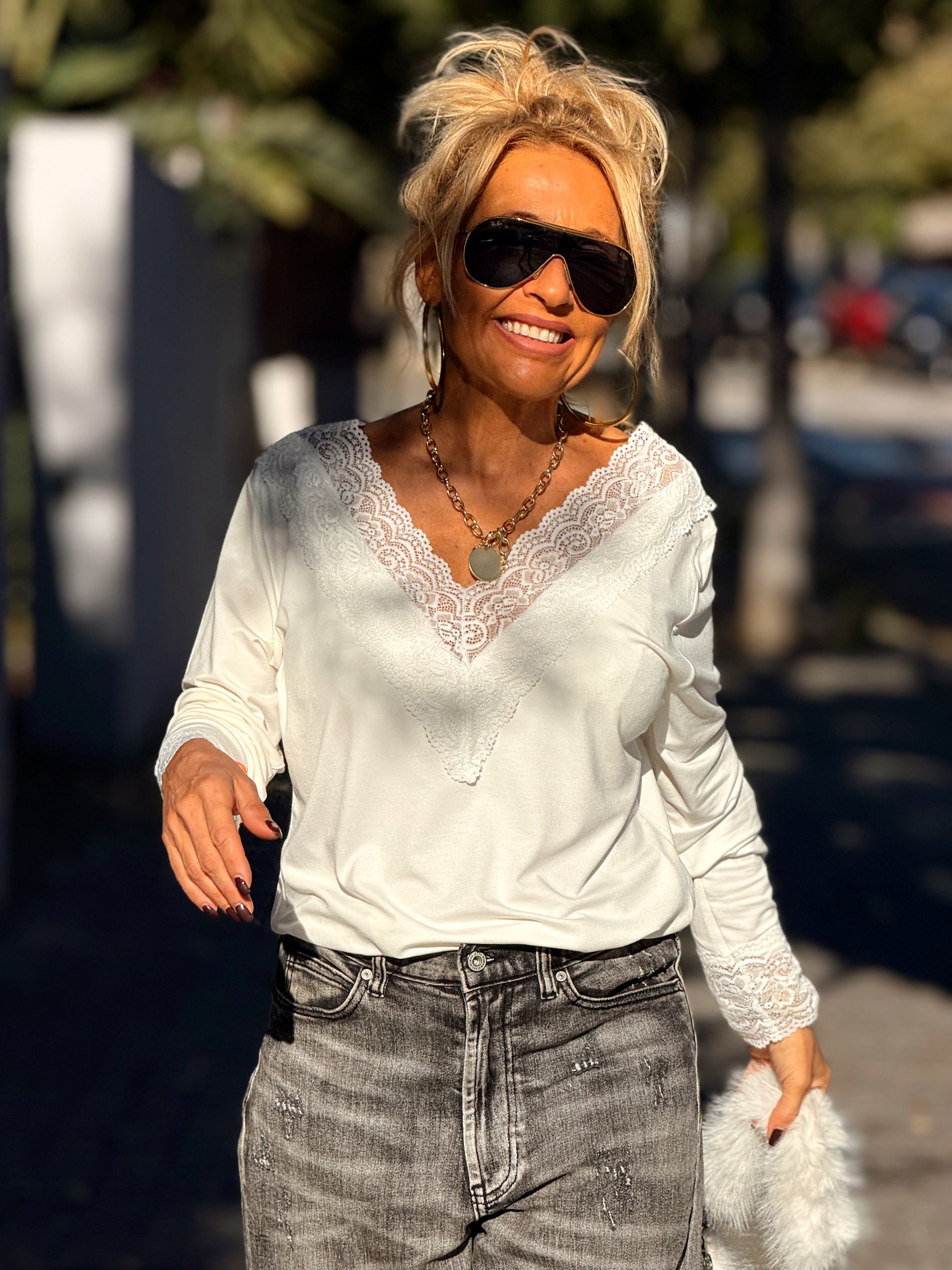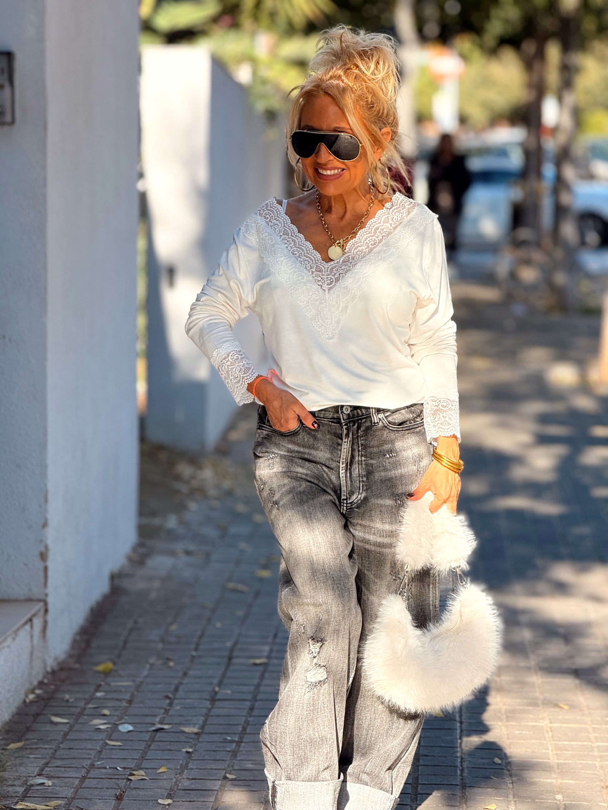 Camiseta oversize con detalles de encaje en las mangas, en el bajo y en el escote.