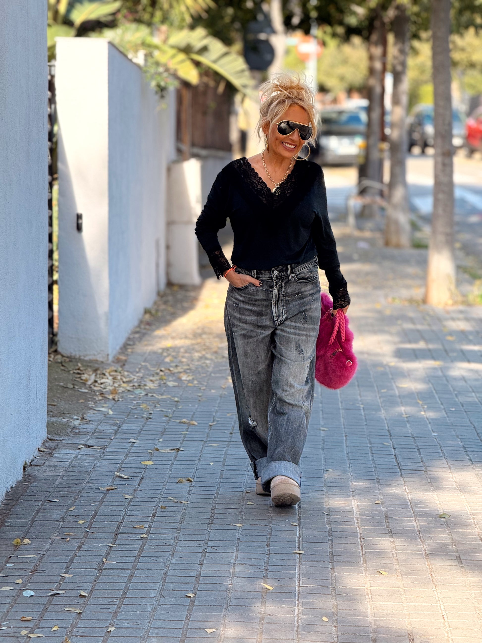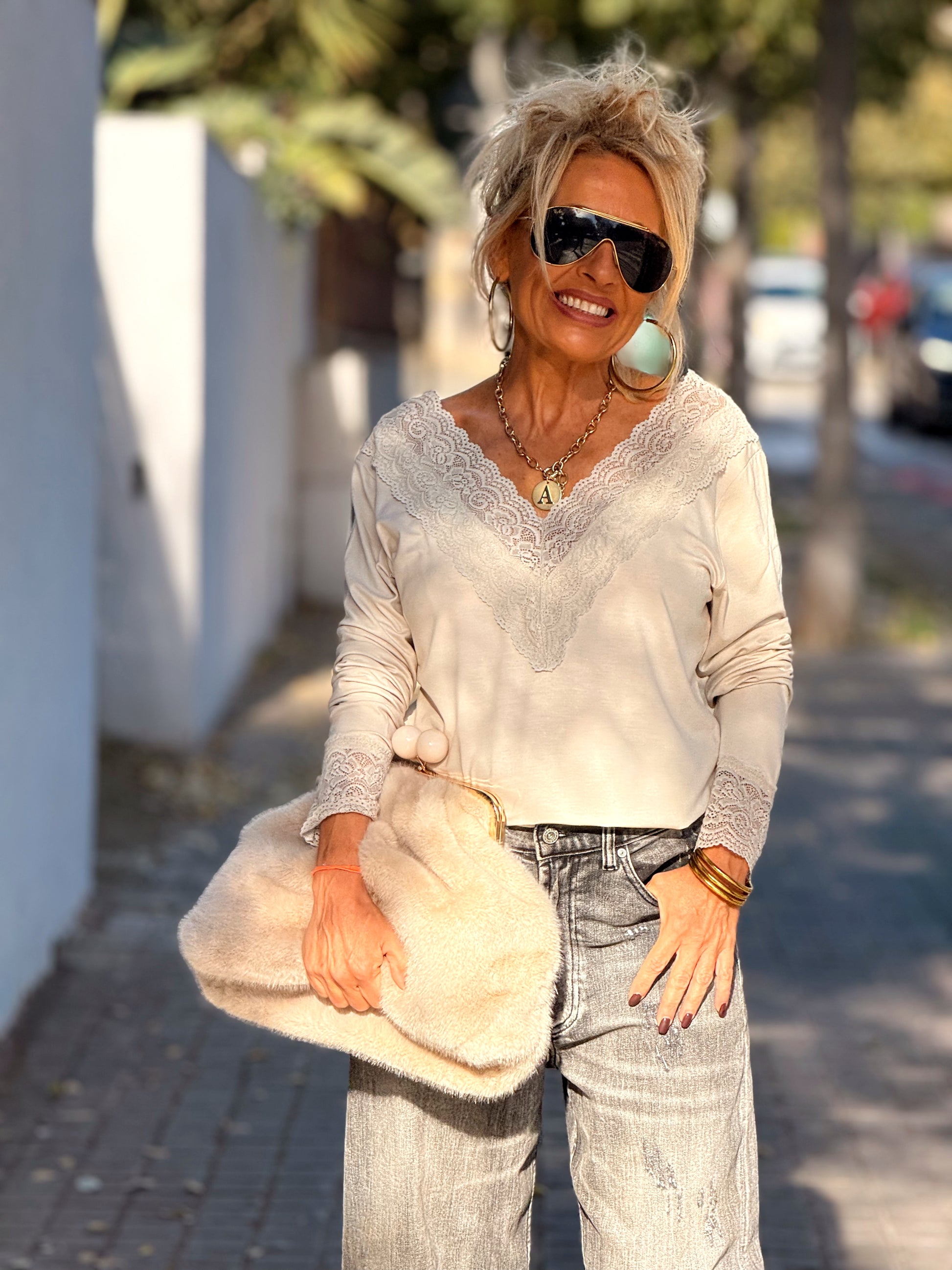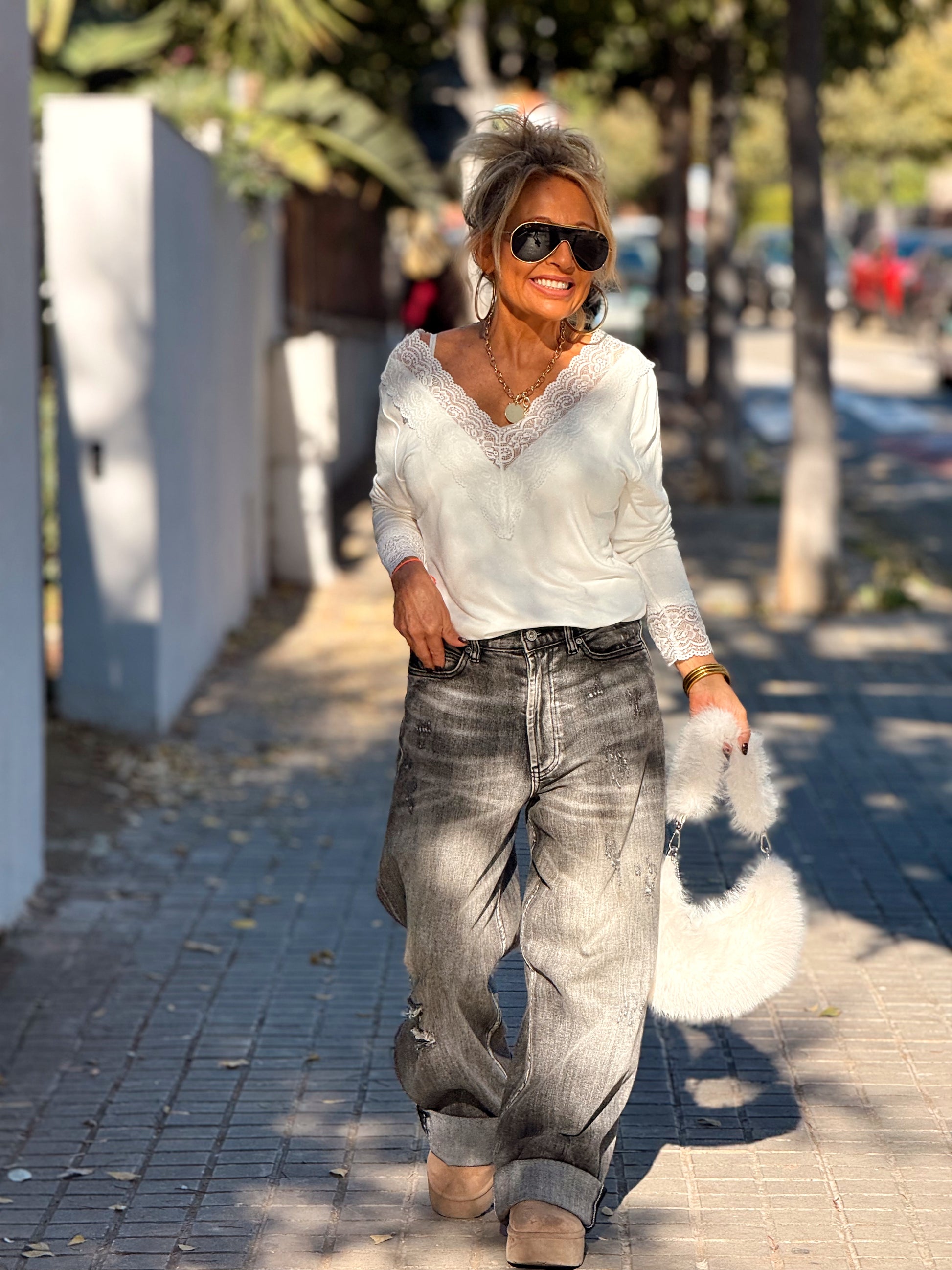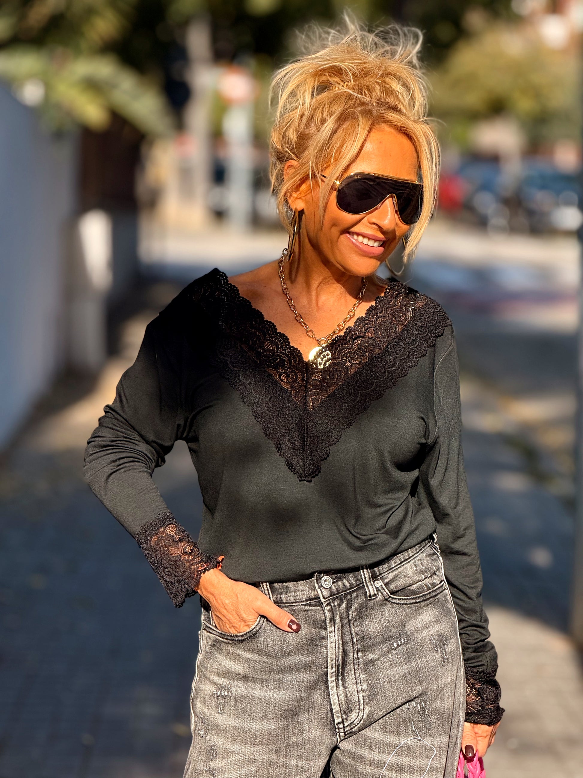 Es una prenda espectacular, amplia y cómoda, que se puede llevar perfectamente hasta una talla 48. El encaje le da un toque femenino y precioso, convirtiéndola en una pieza especial y muy favorecedora.