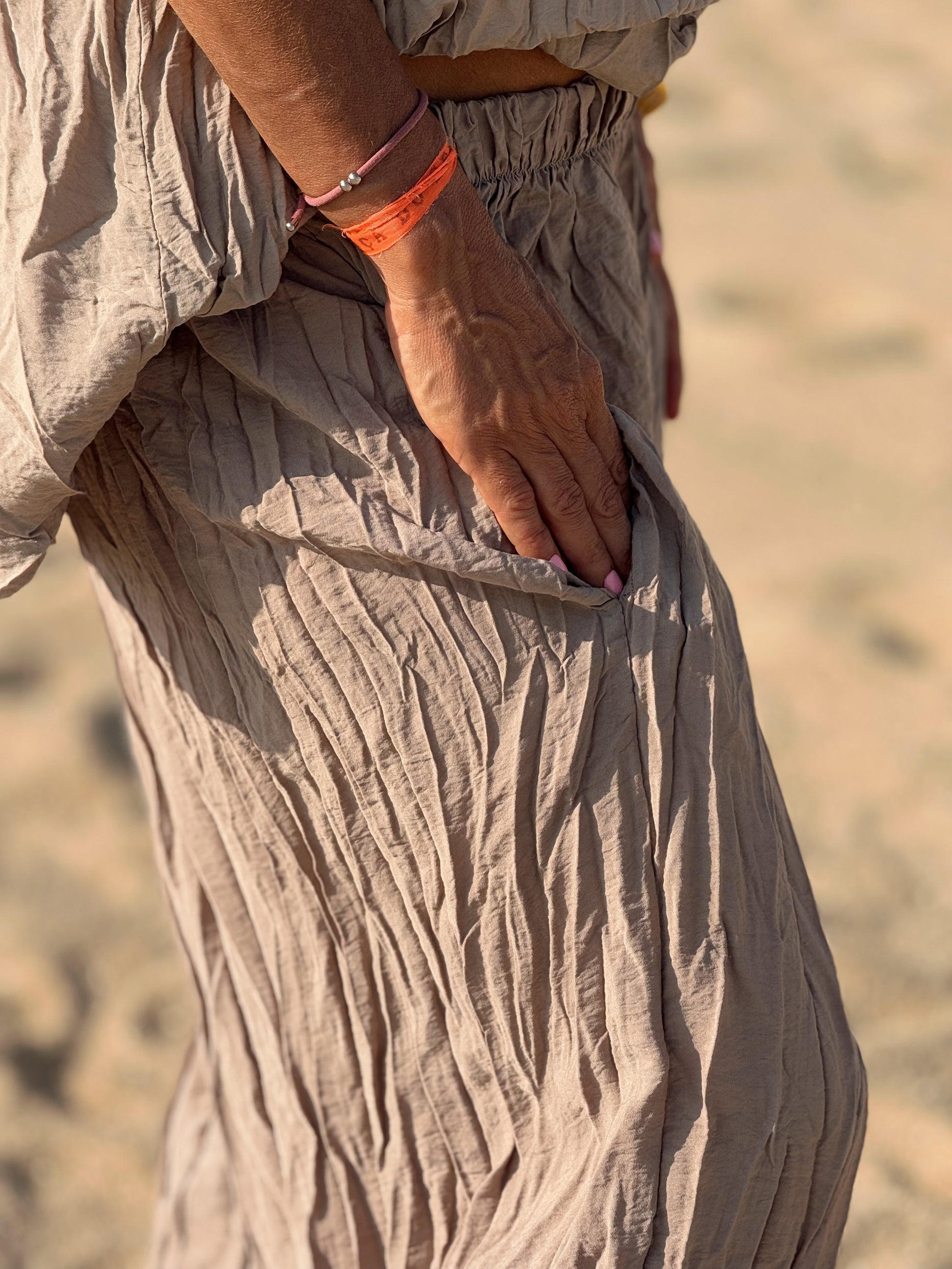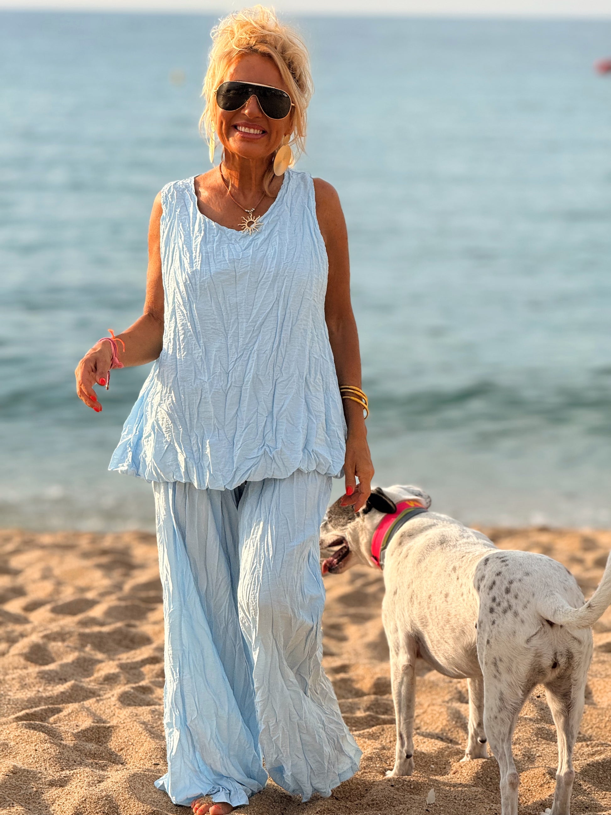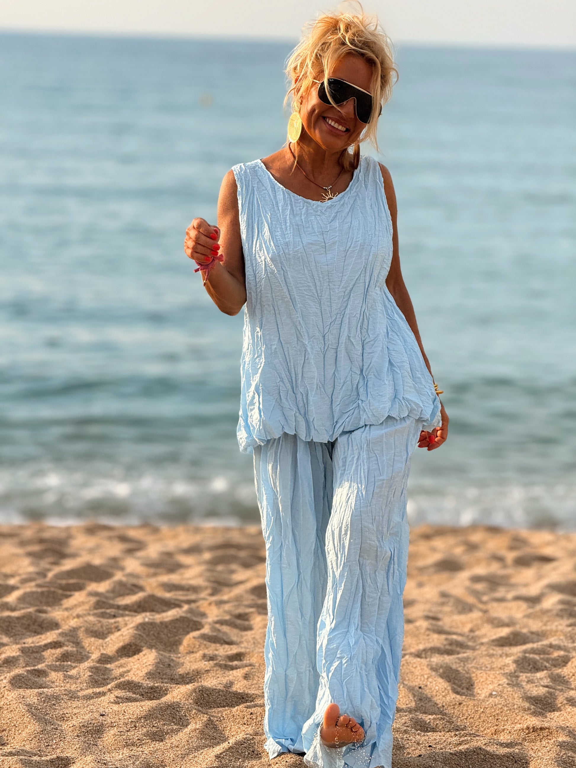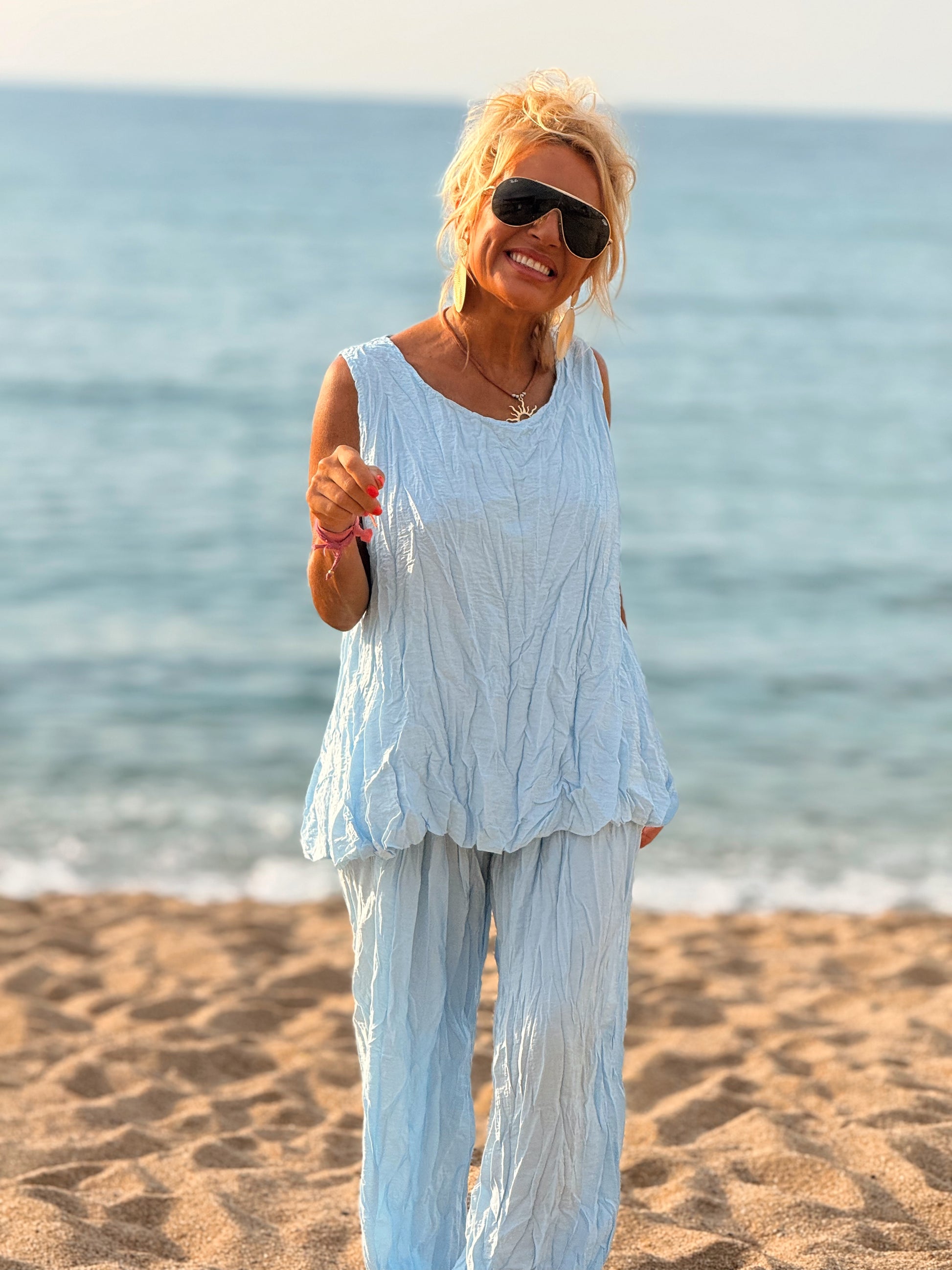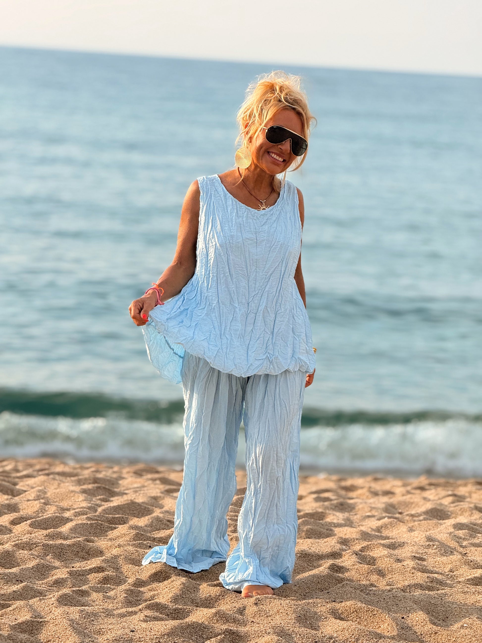 Este conjunto está formado por un top tipo blusa y un pantalón con cintura elástica. El tejido es plisado y con un efecto arrugado que se lleva así, y es justamente lo que le da todo su estilo y personalidad.