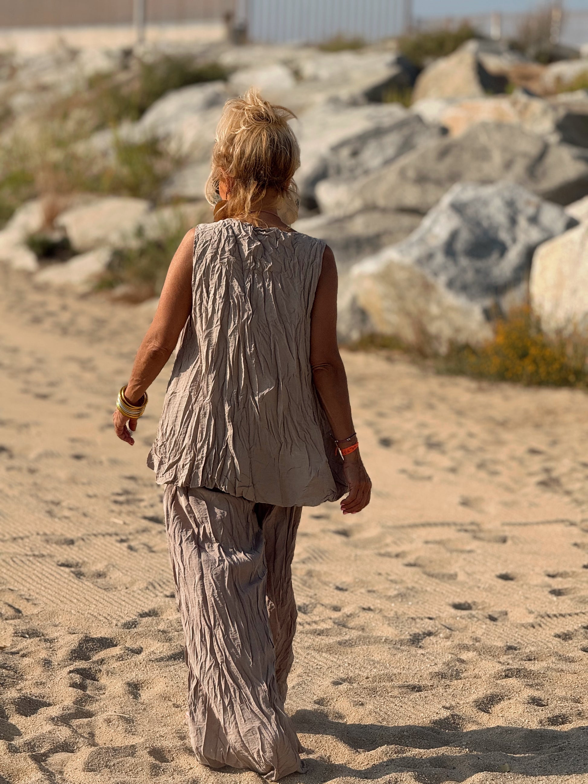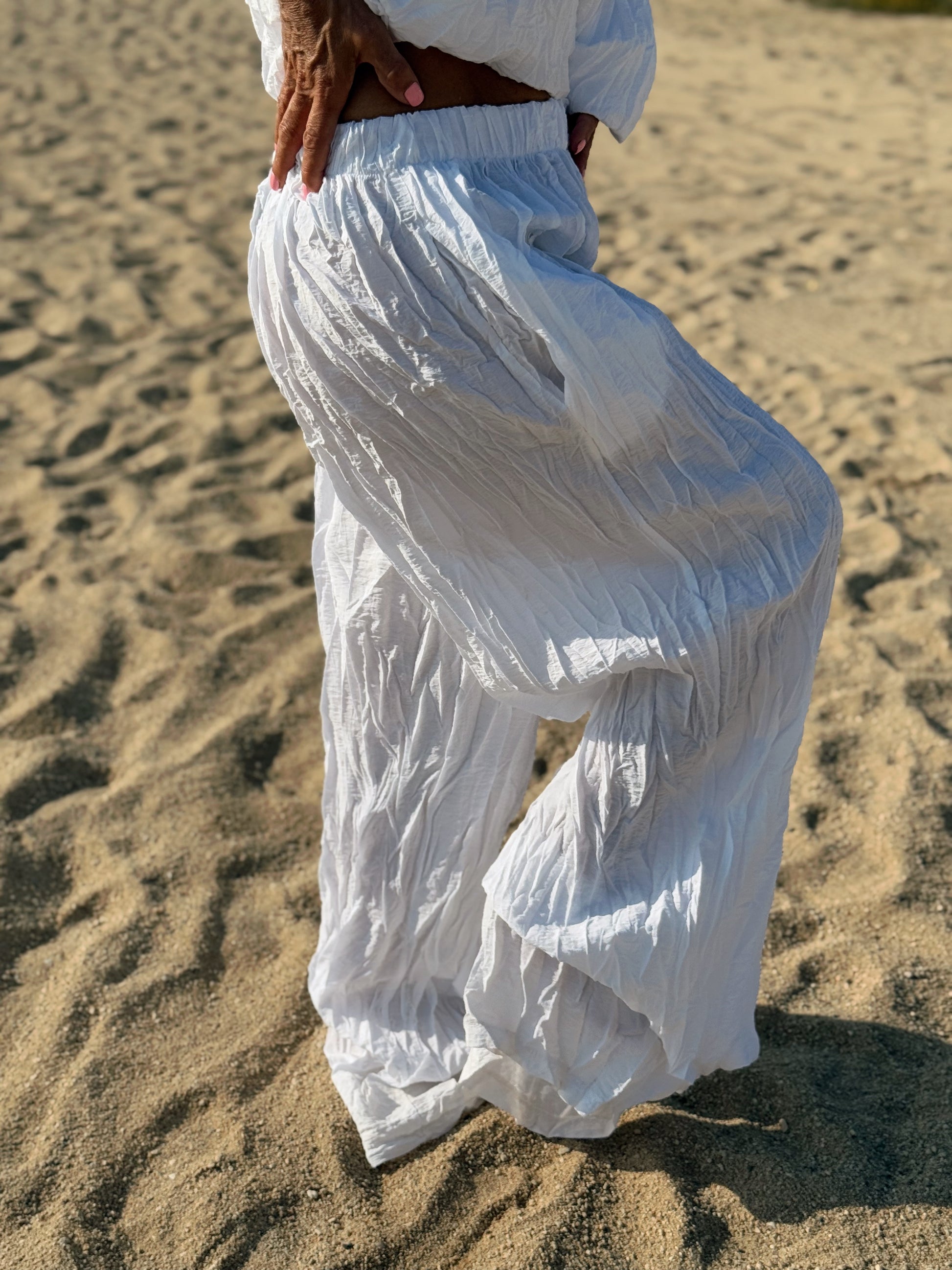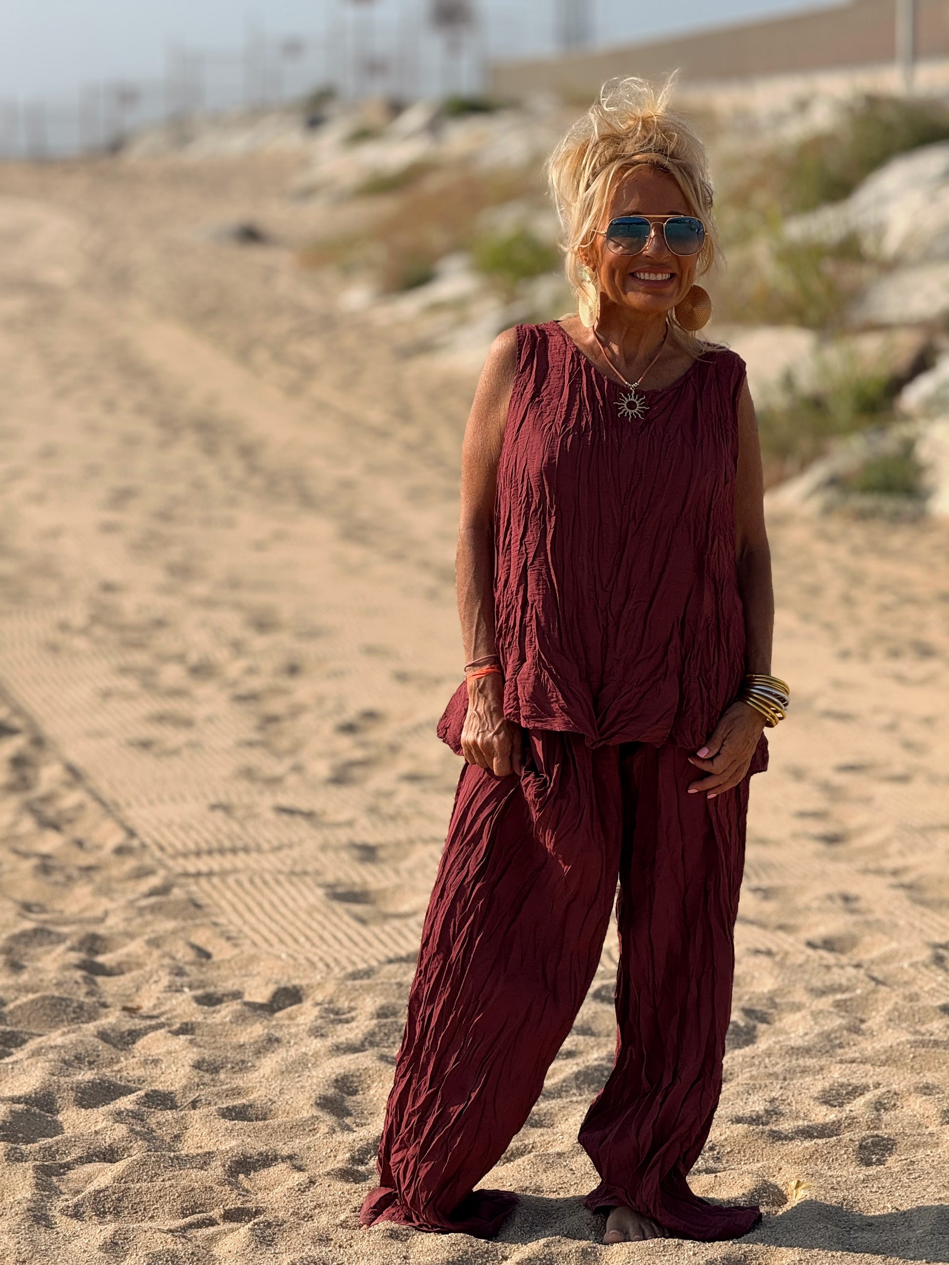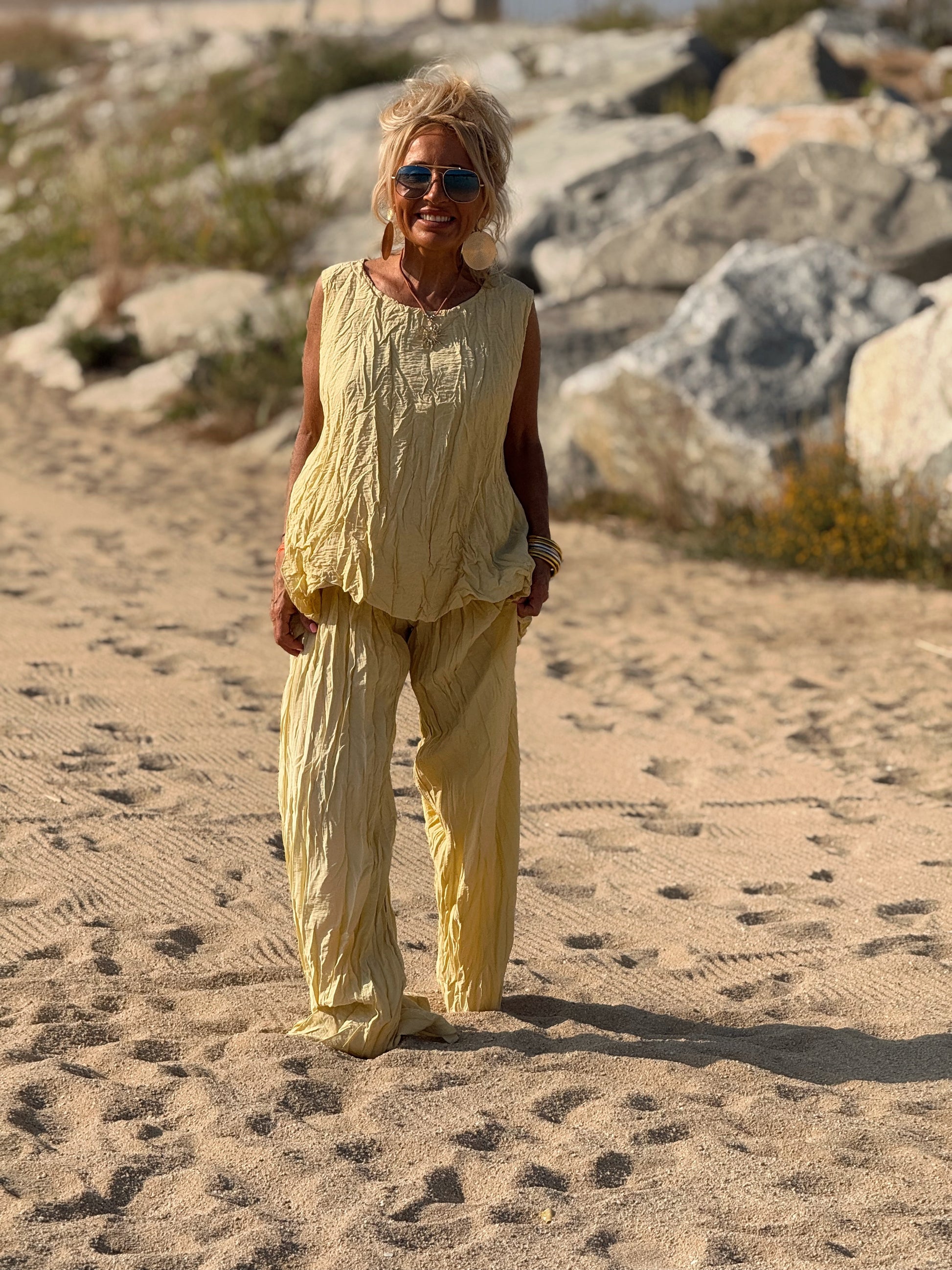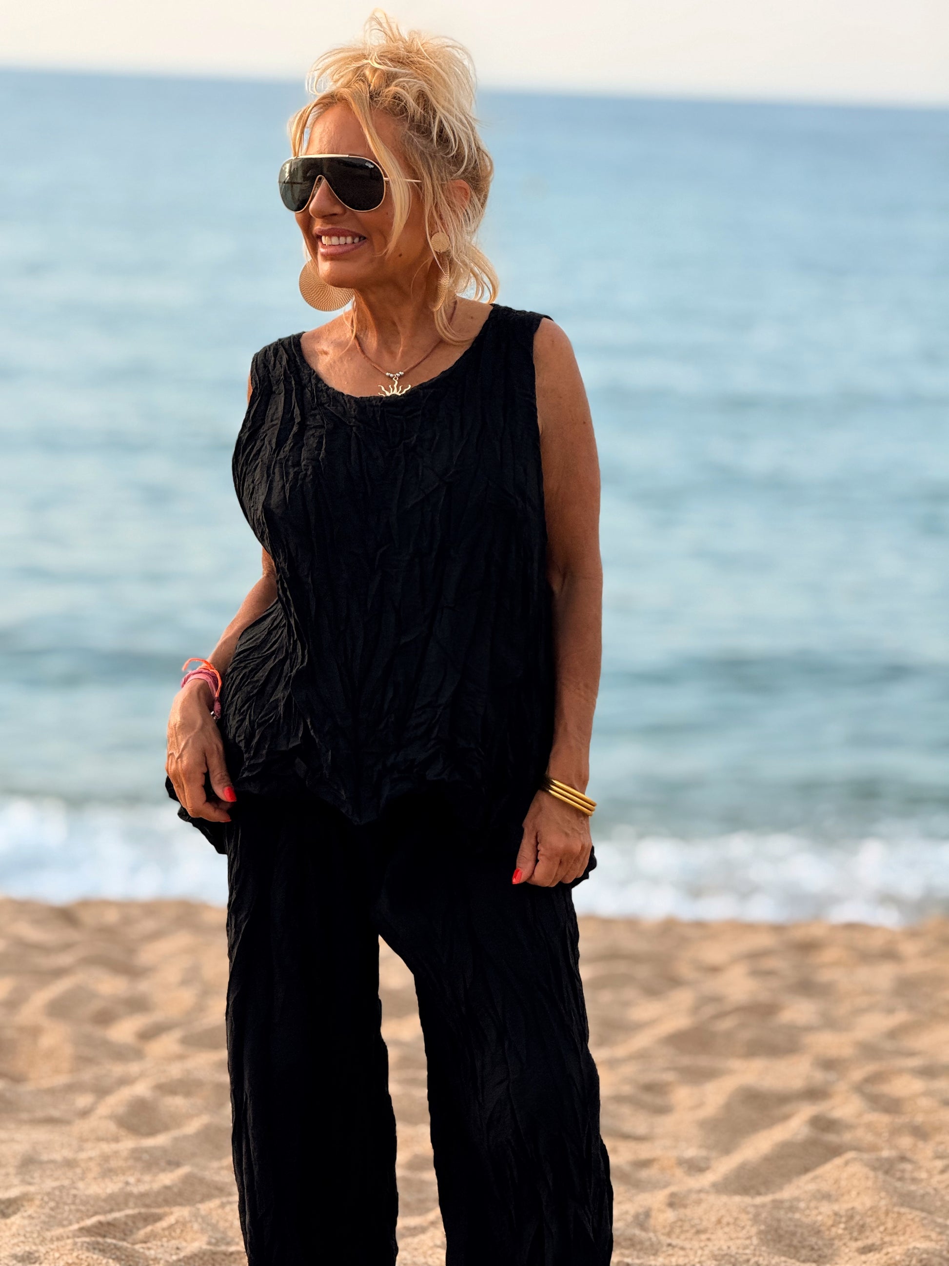 Este conjunto está formado por un top tipo blusa y un pantalón con cintura elástica. El tejido es plisado y con un efecto arrugado que se lleva así, y es justamente lo que le da todo su estilo y personalidad.