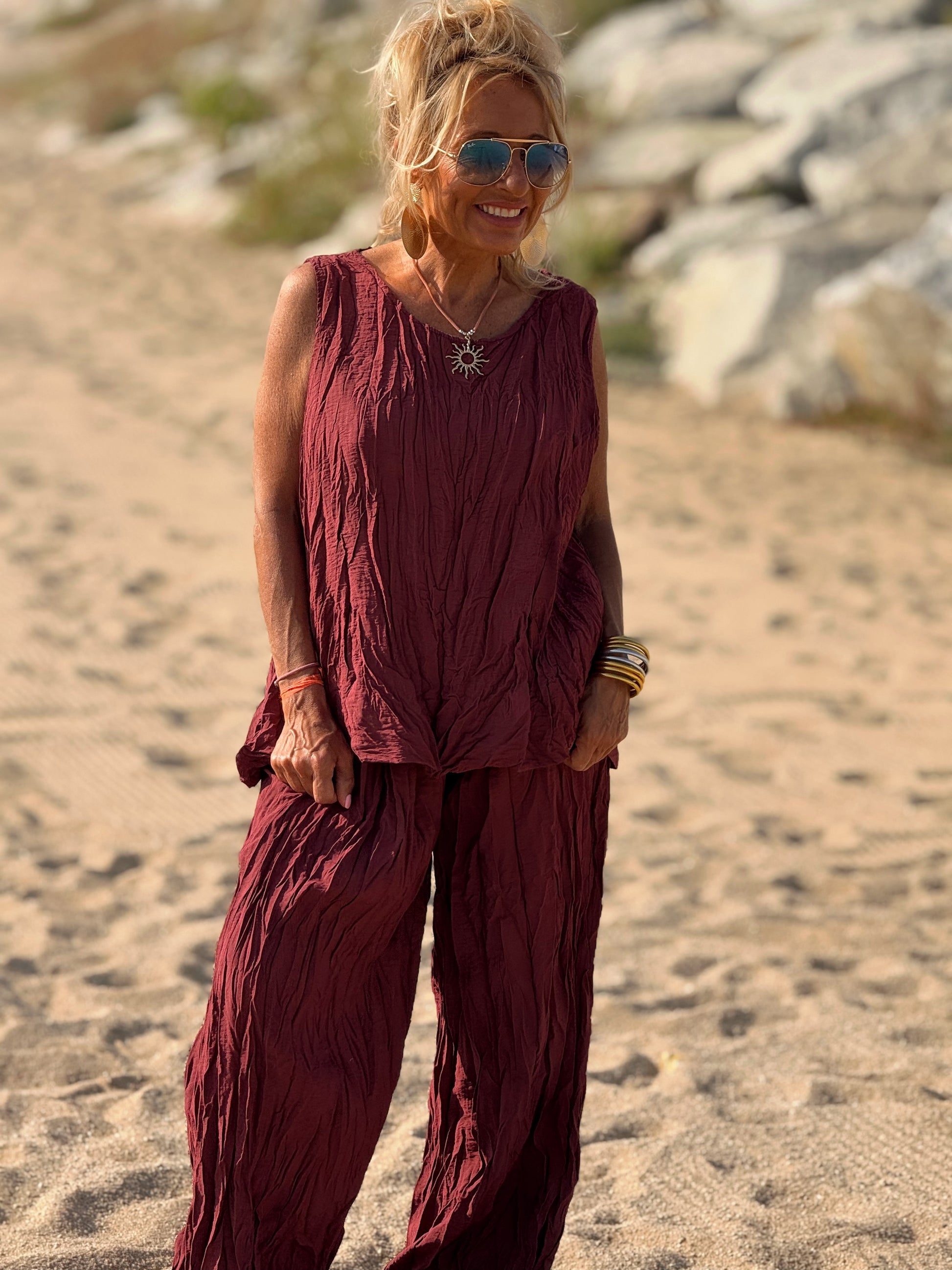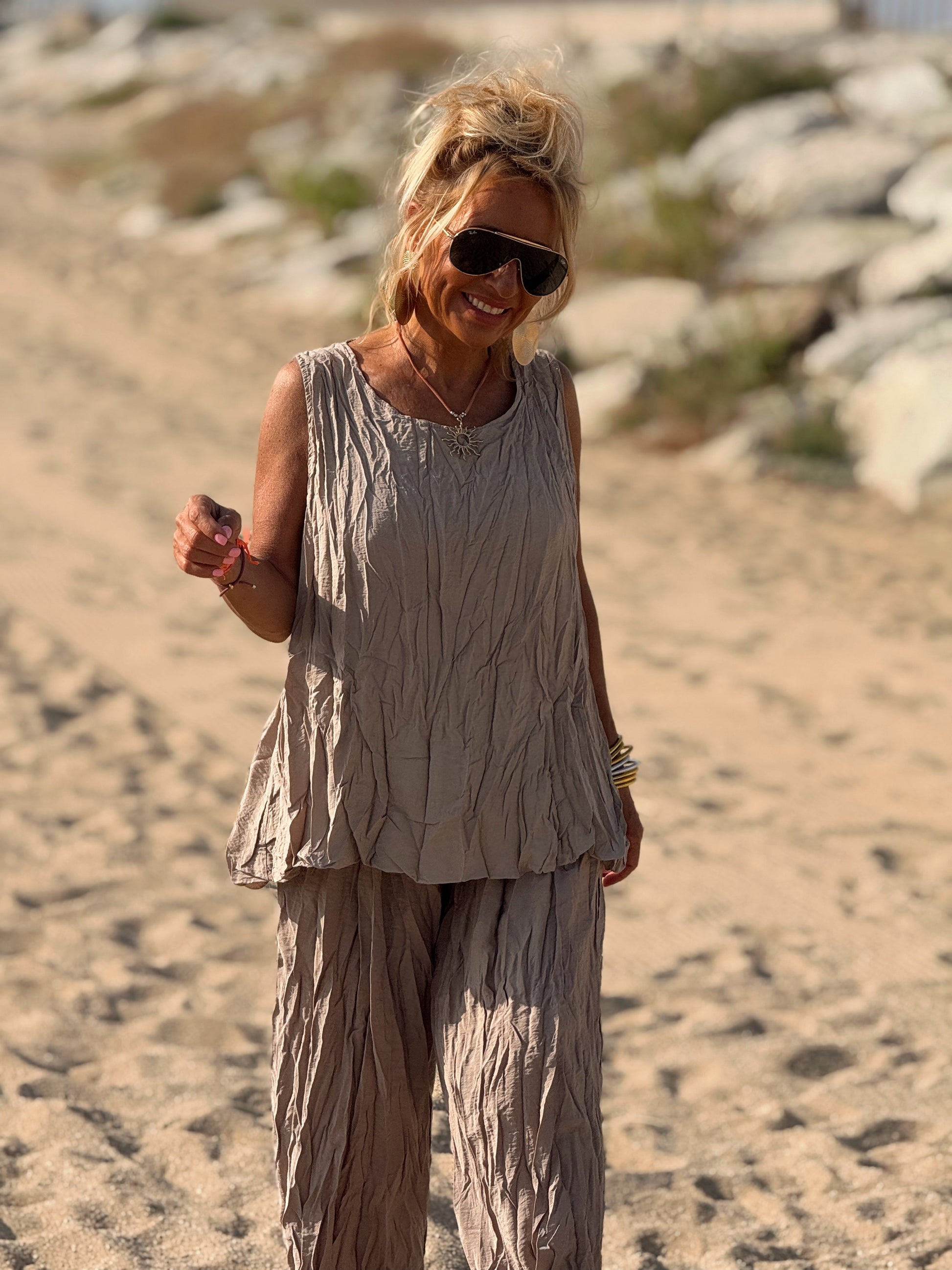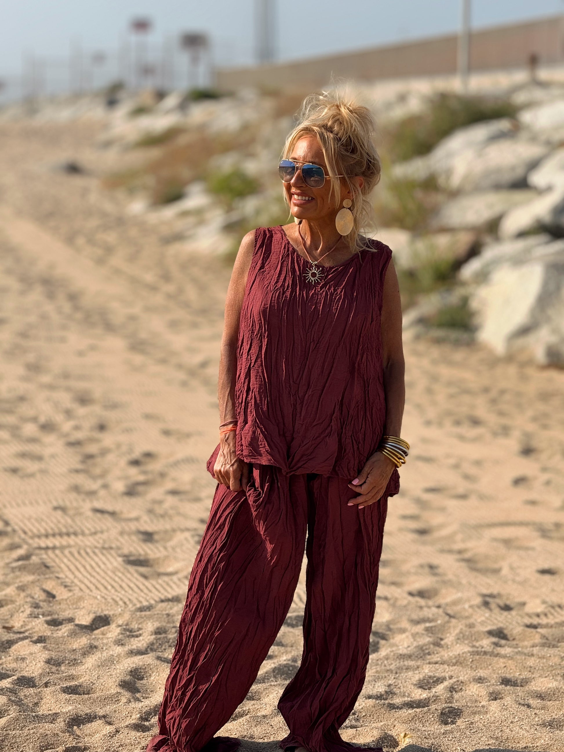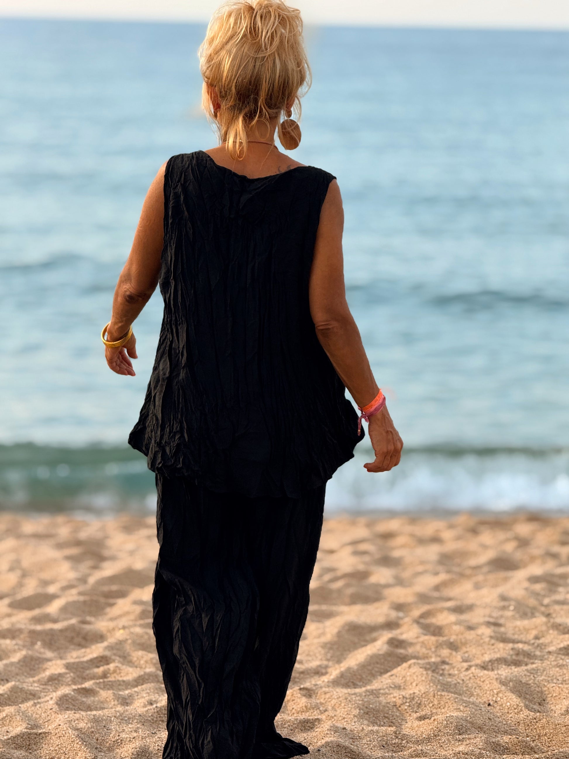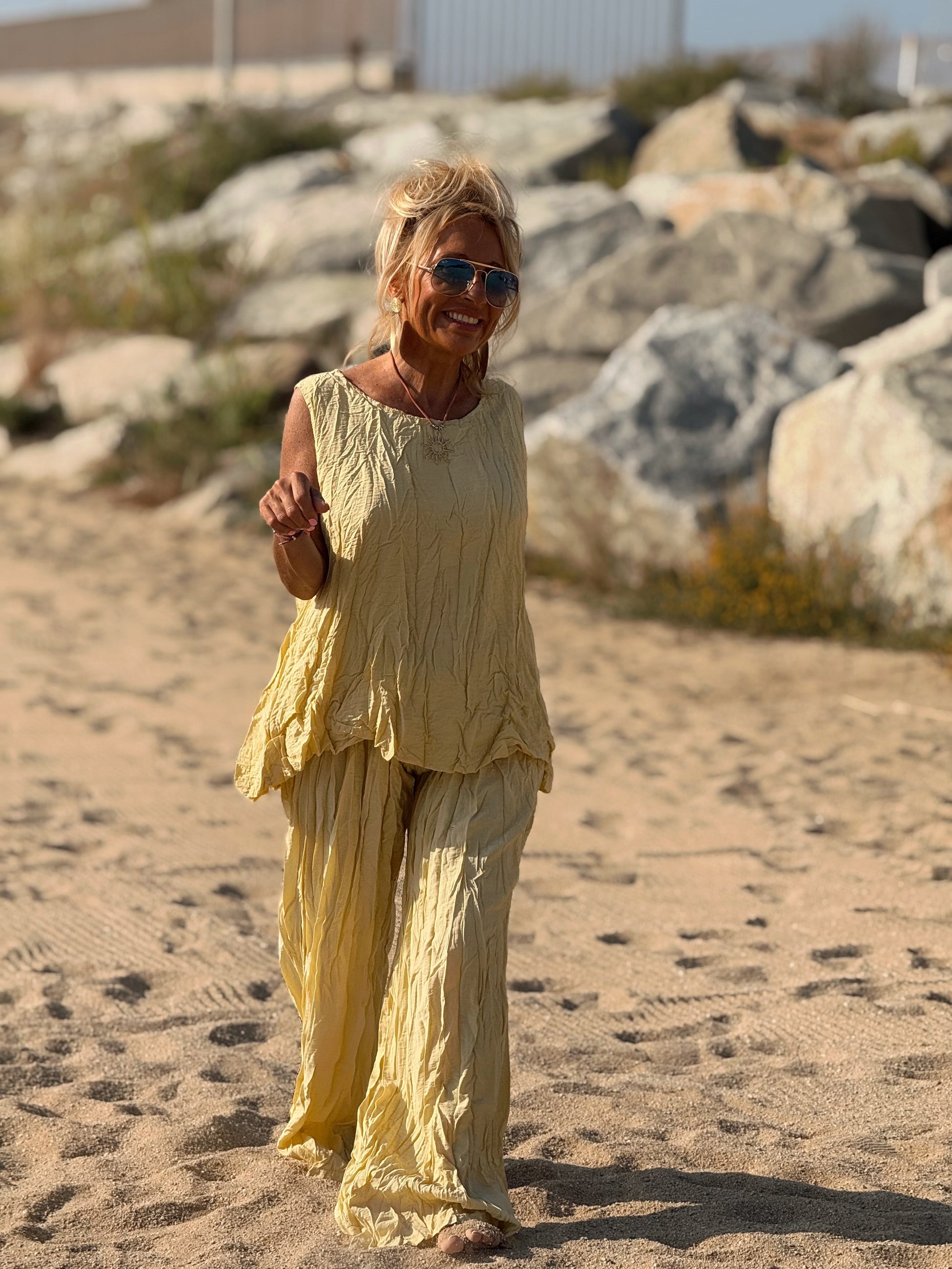Este conjunto está formado por un top tipo blusa y un pantalón con cintura elástica. El tejido es plisado y con un efecto arrugado que se lleva así, y es justamente lo que le da todo su estilo y personalidad.