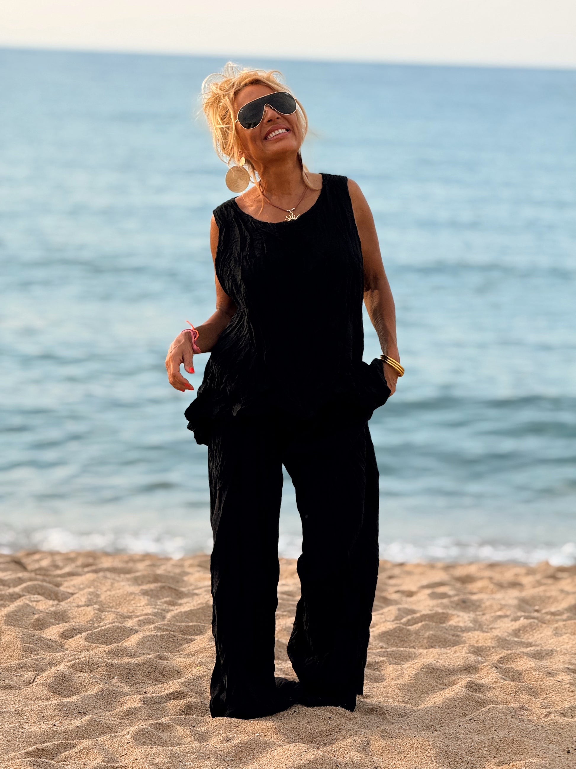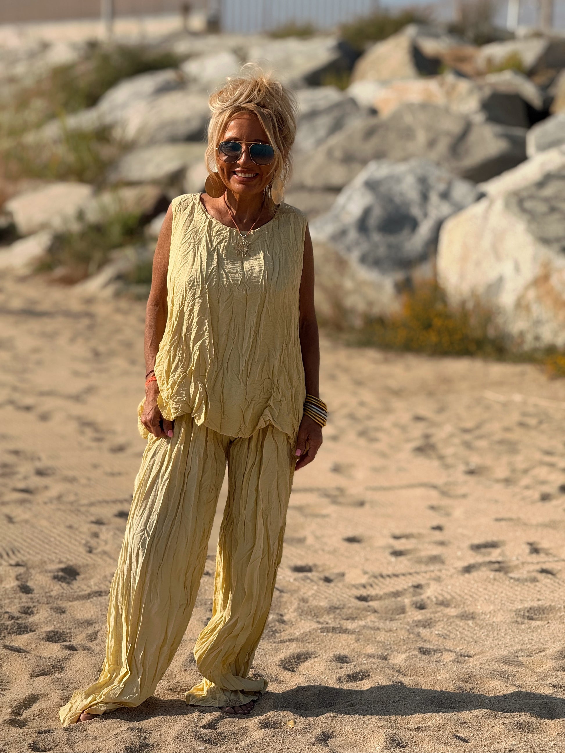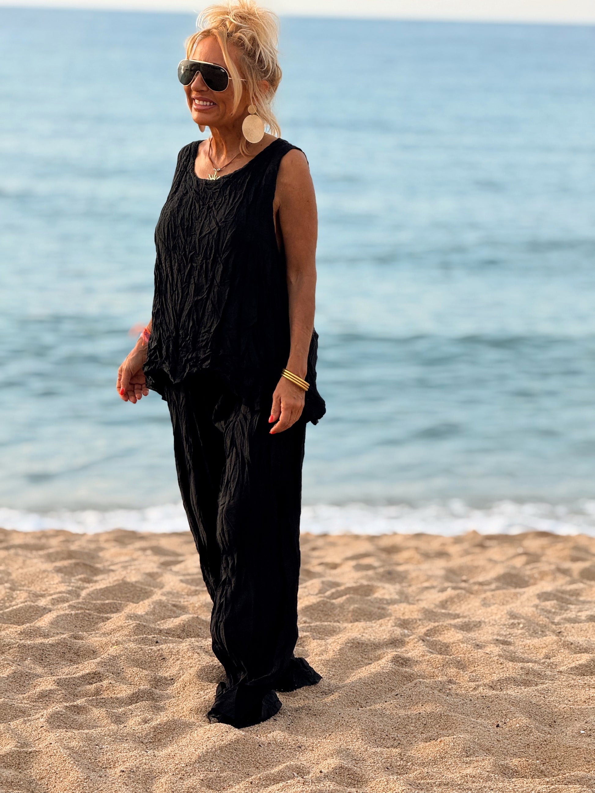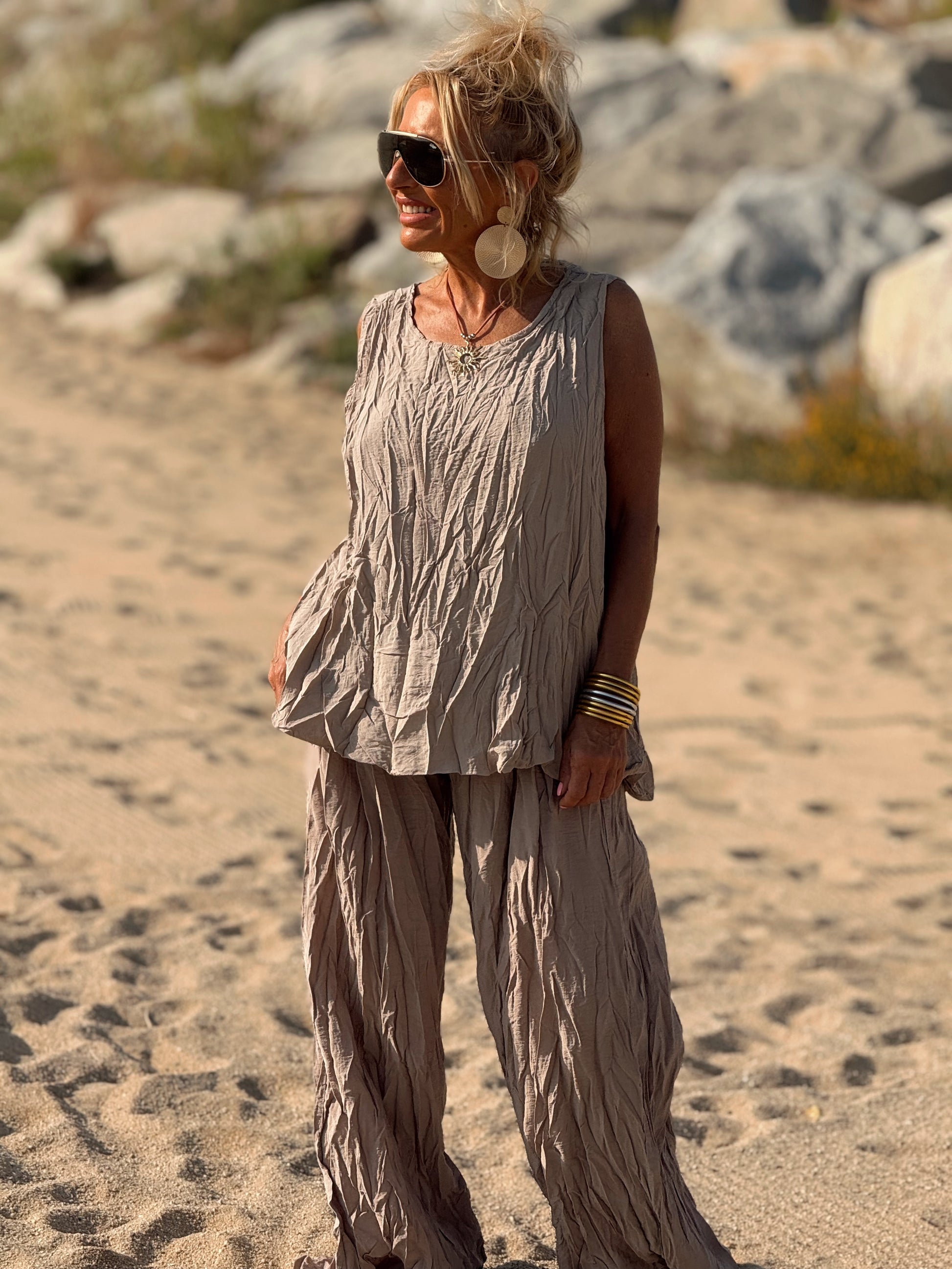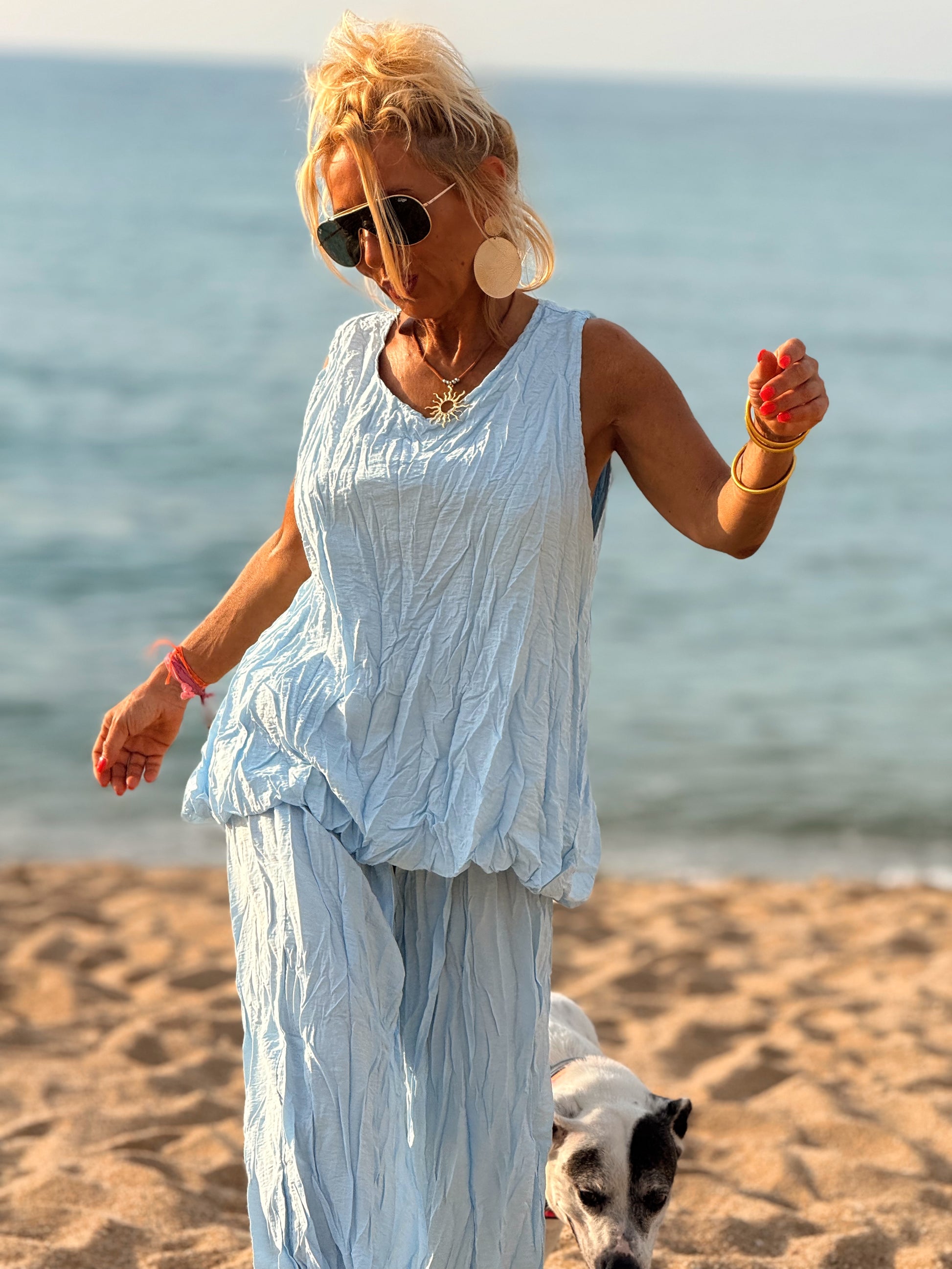 Este conjunto está formado por un top tipo blusa y un pantalón con cintura elástica. El tejido es plisado y con un efecto arrugado que se lleva así, y es justamente lo que le da todo su estilo y personalidad.