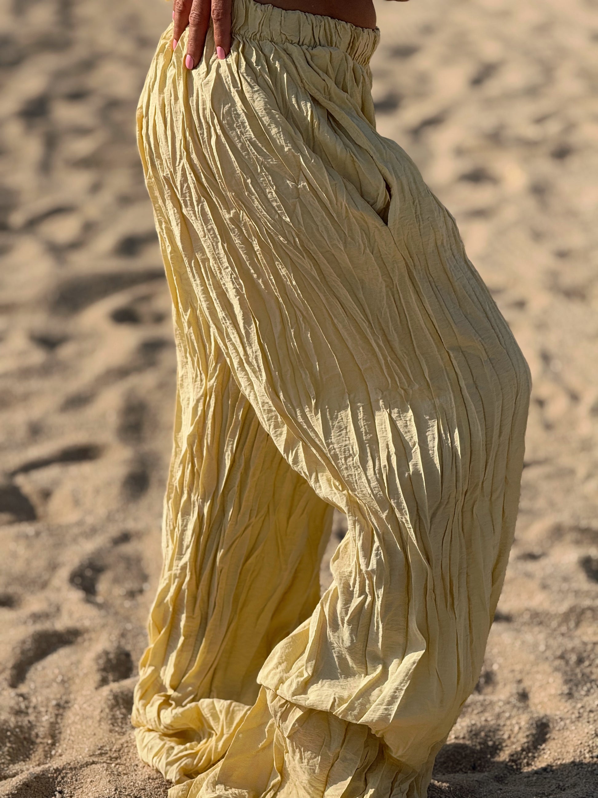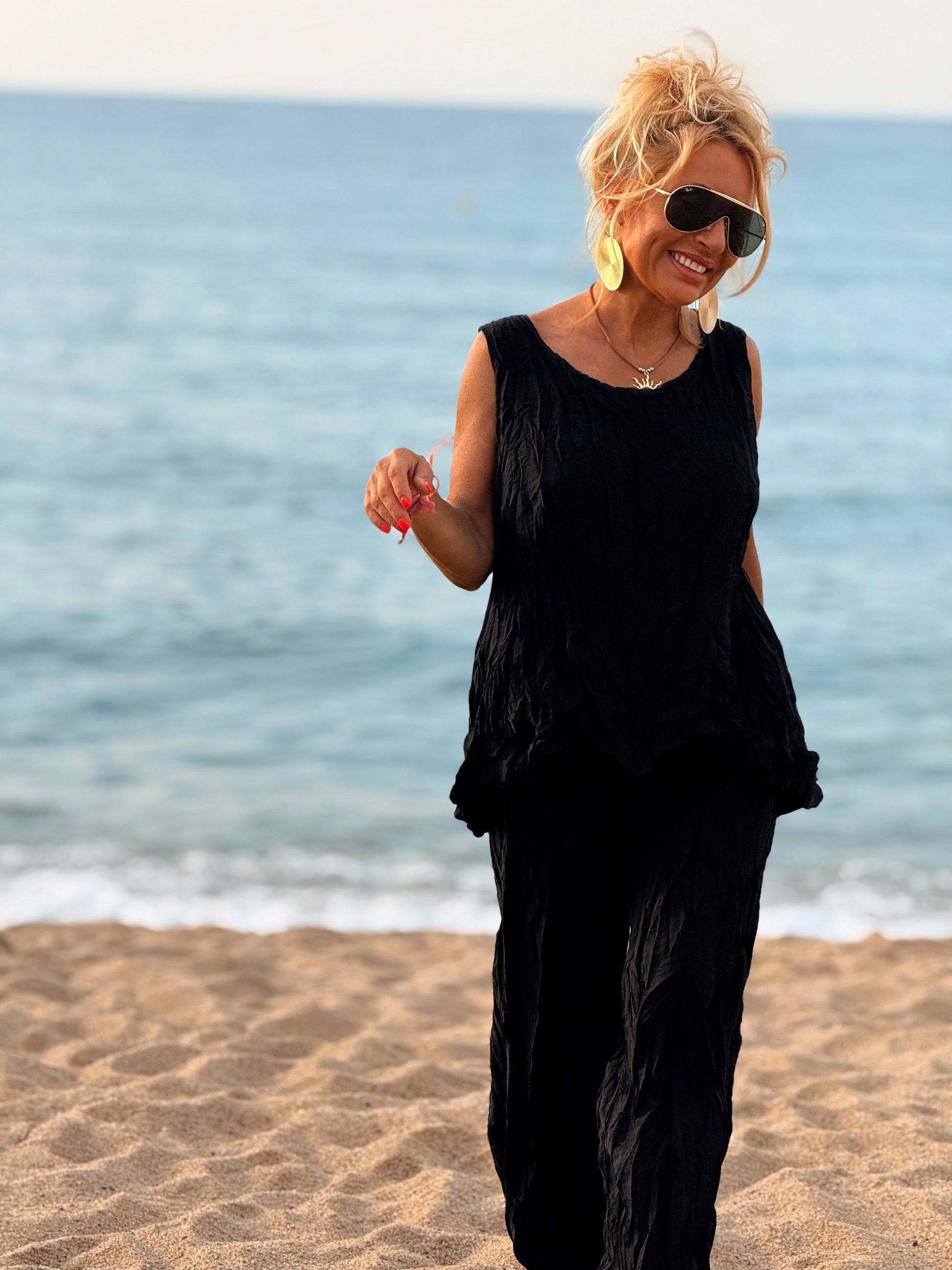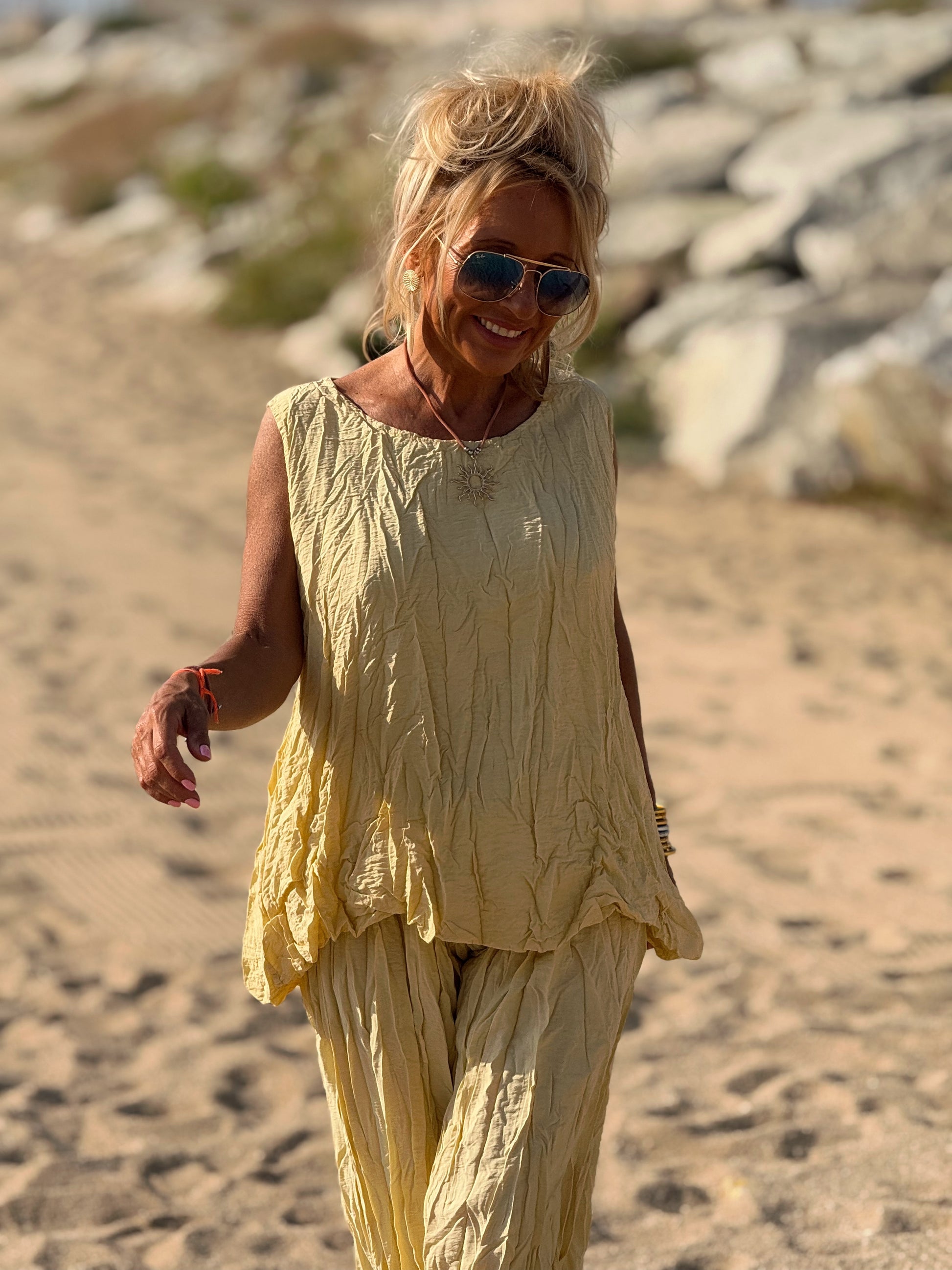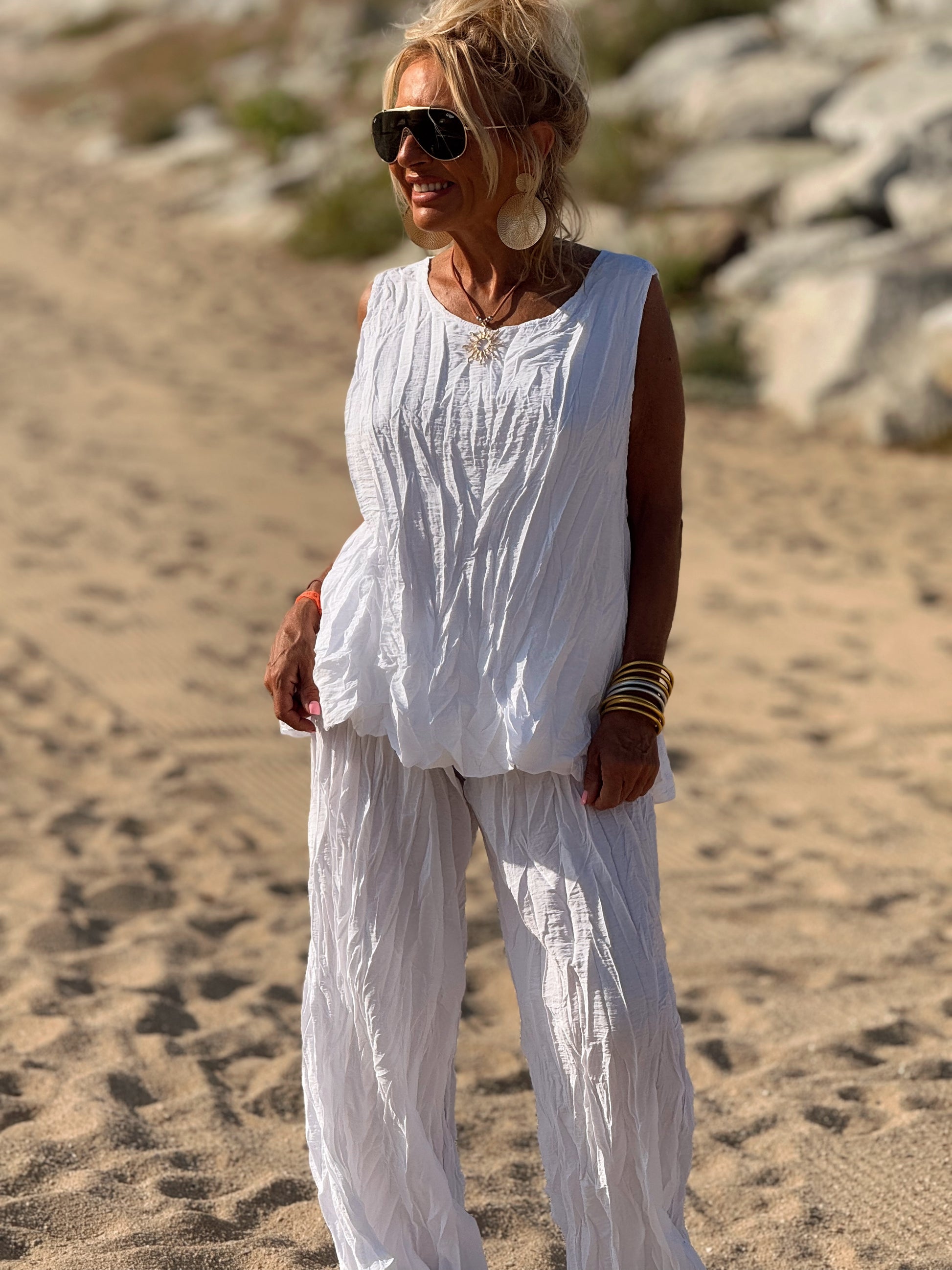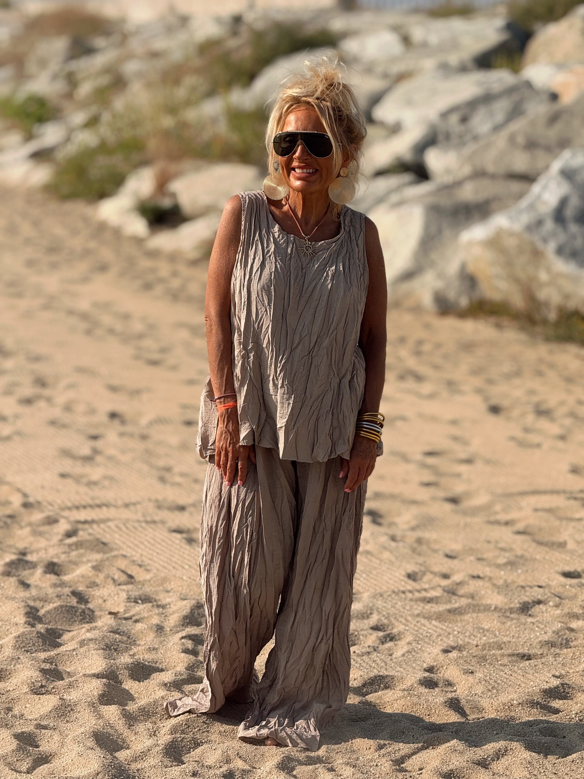 Este conjunto está formado por un top tipo blusa y un pantalón con cintura elástica. El tejido es plisado y con un efecto arrugado que se lleva así, y es justamente lo que le da todo su estilo y personalidad.