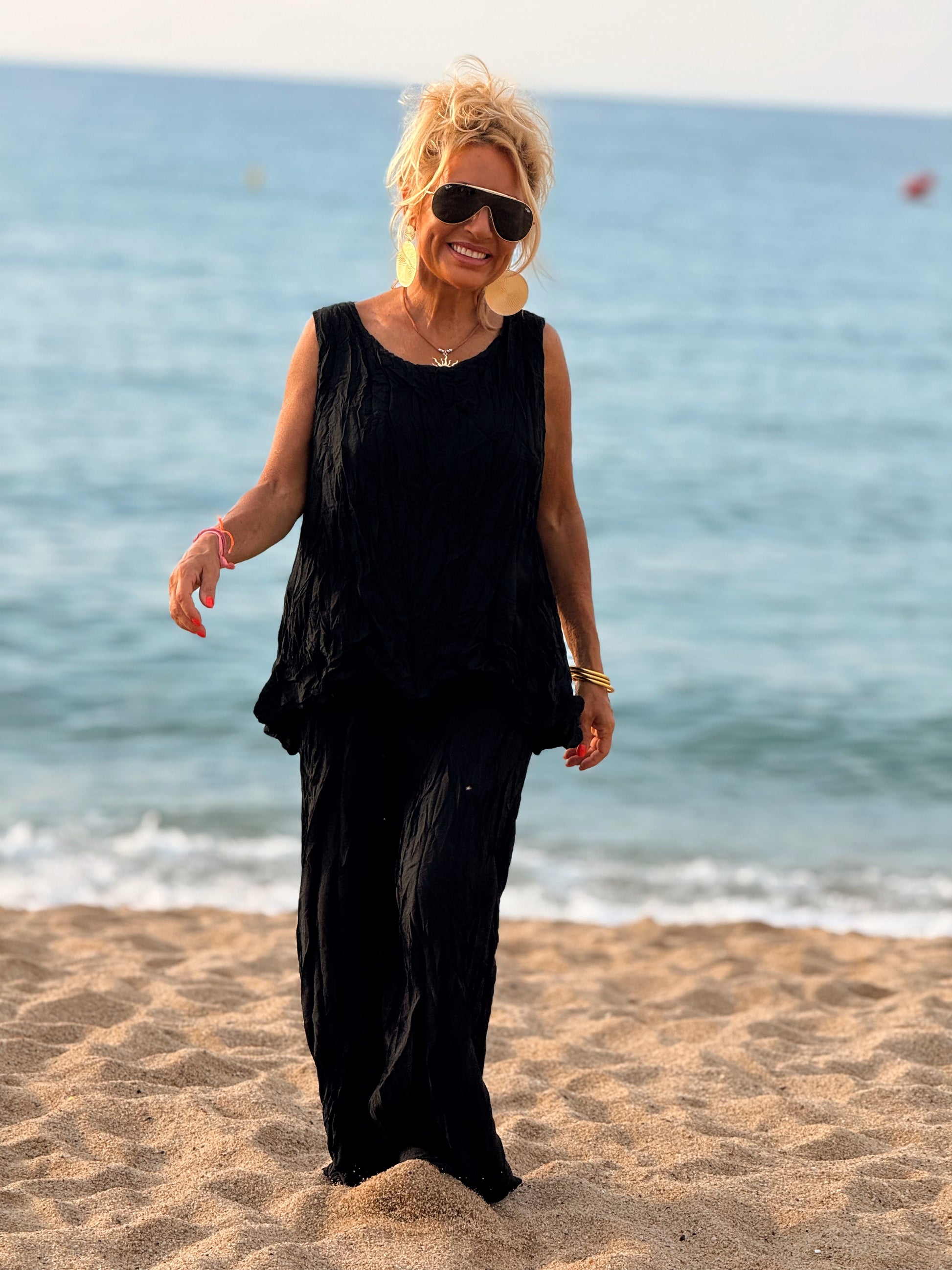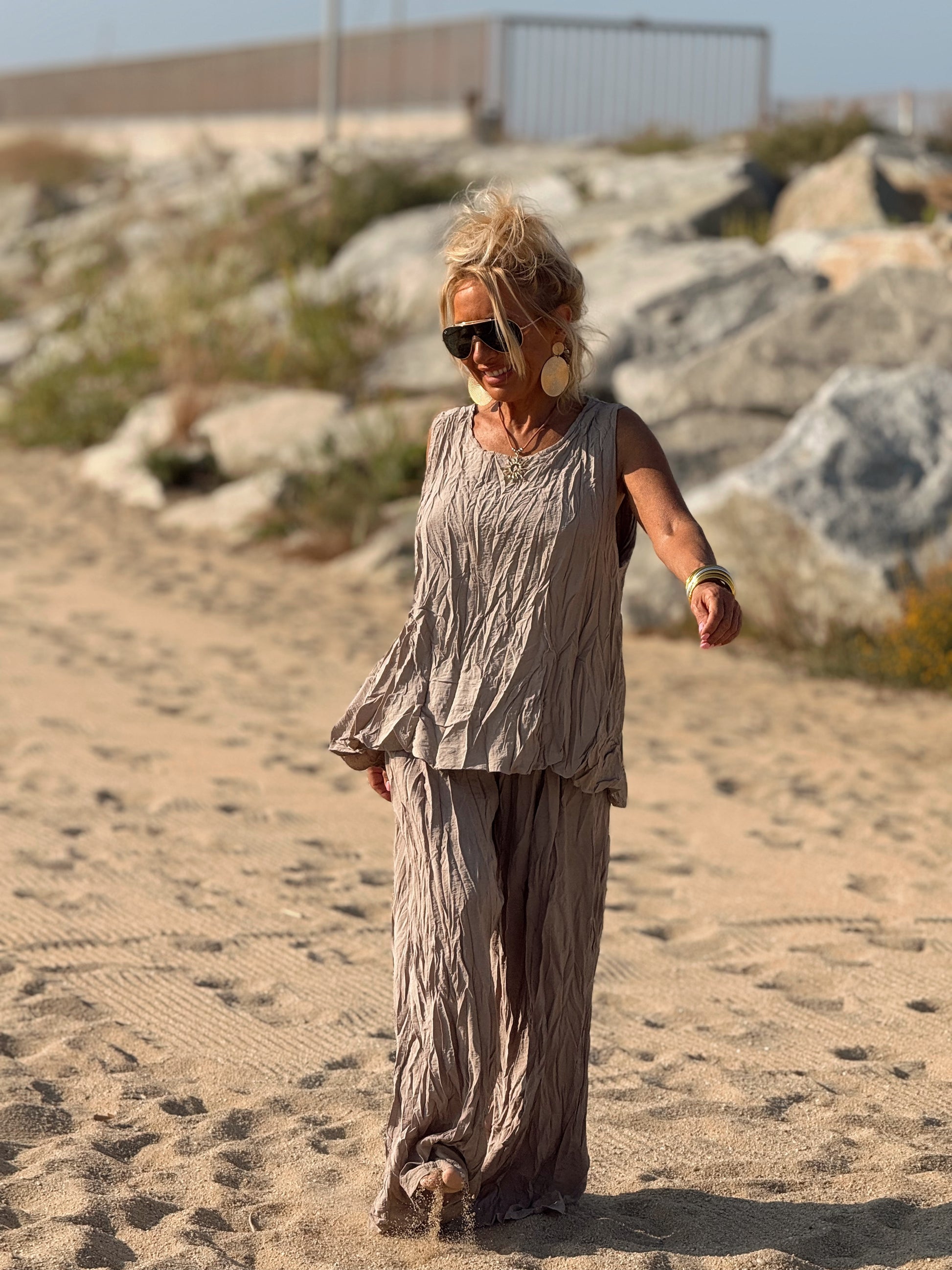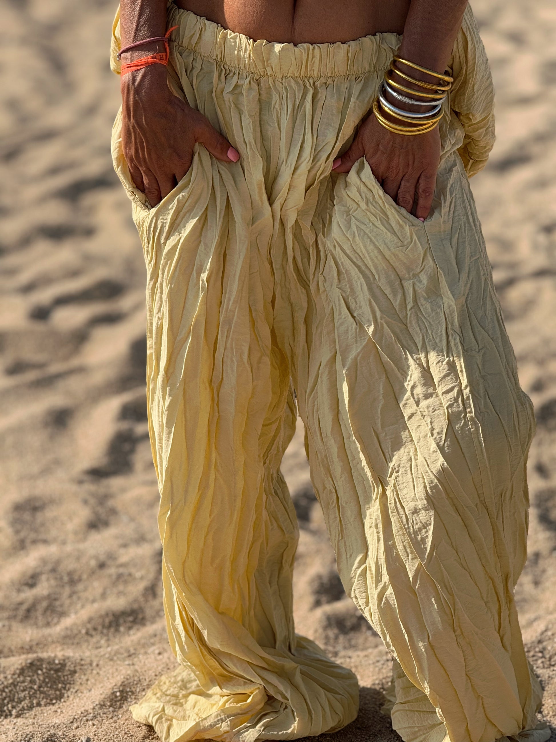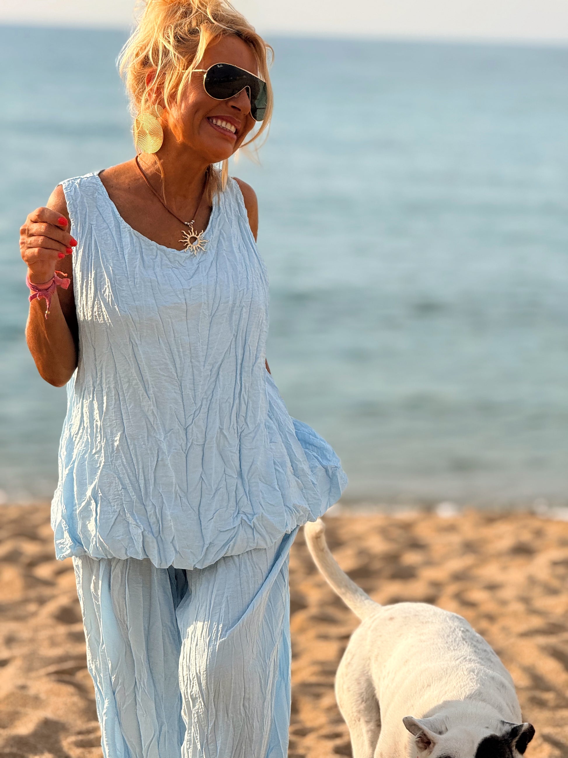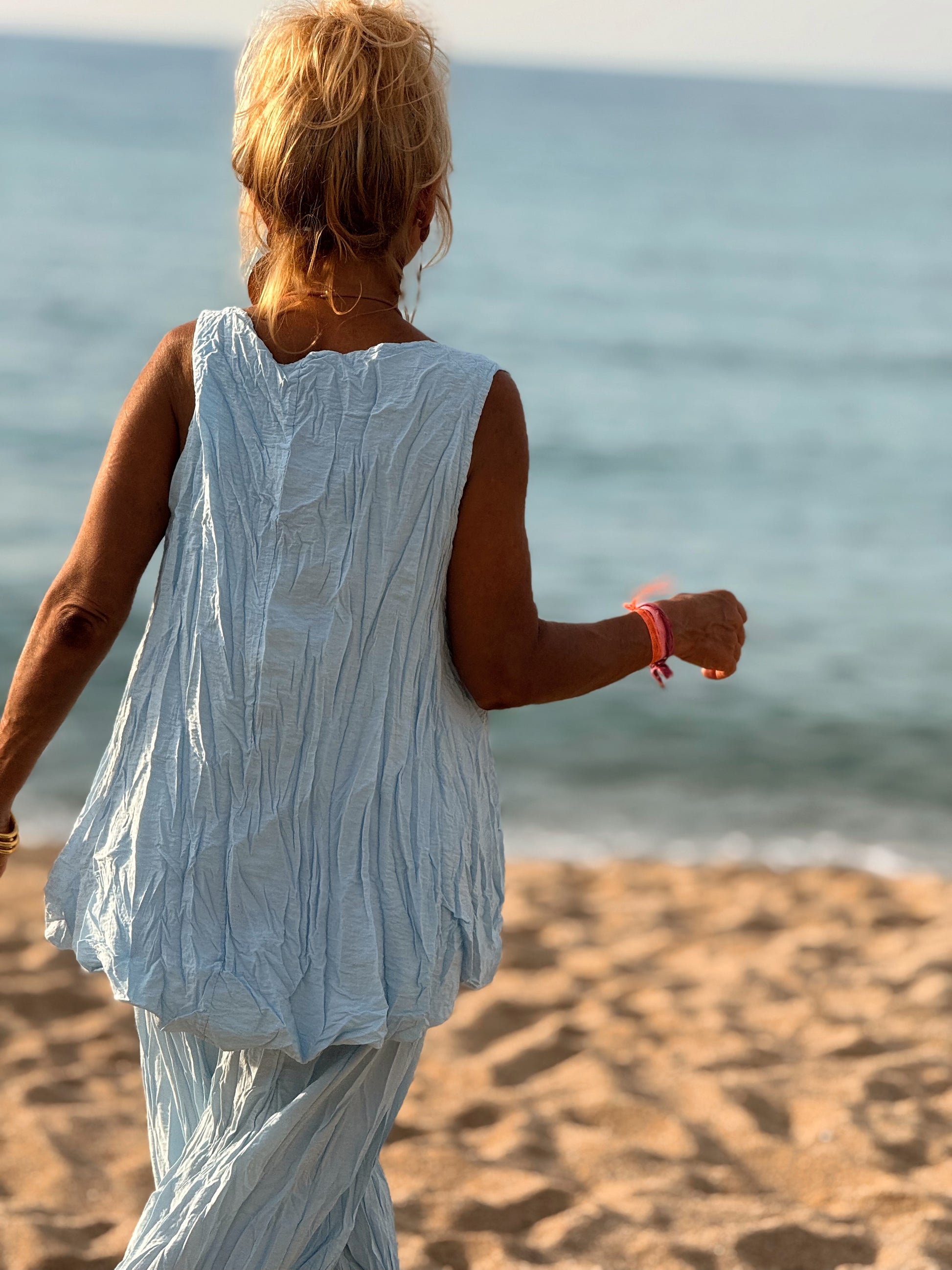 Este conjunto está formado por un top tipo blusa y un pantalón con cintura elástica. El tejido es plisado y con un efecto arrugado que se lleva así, y es justamente lo que le da todo su estilo y personalidad.