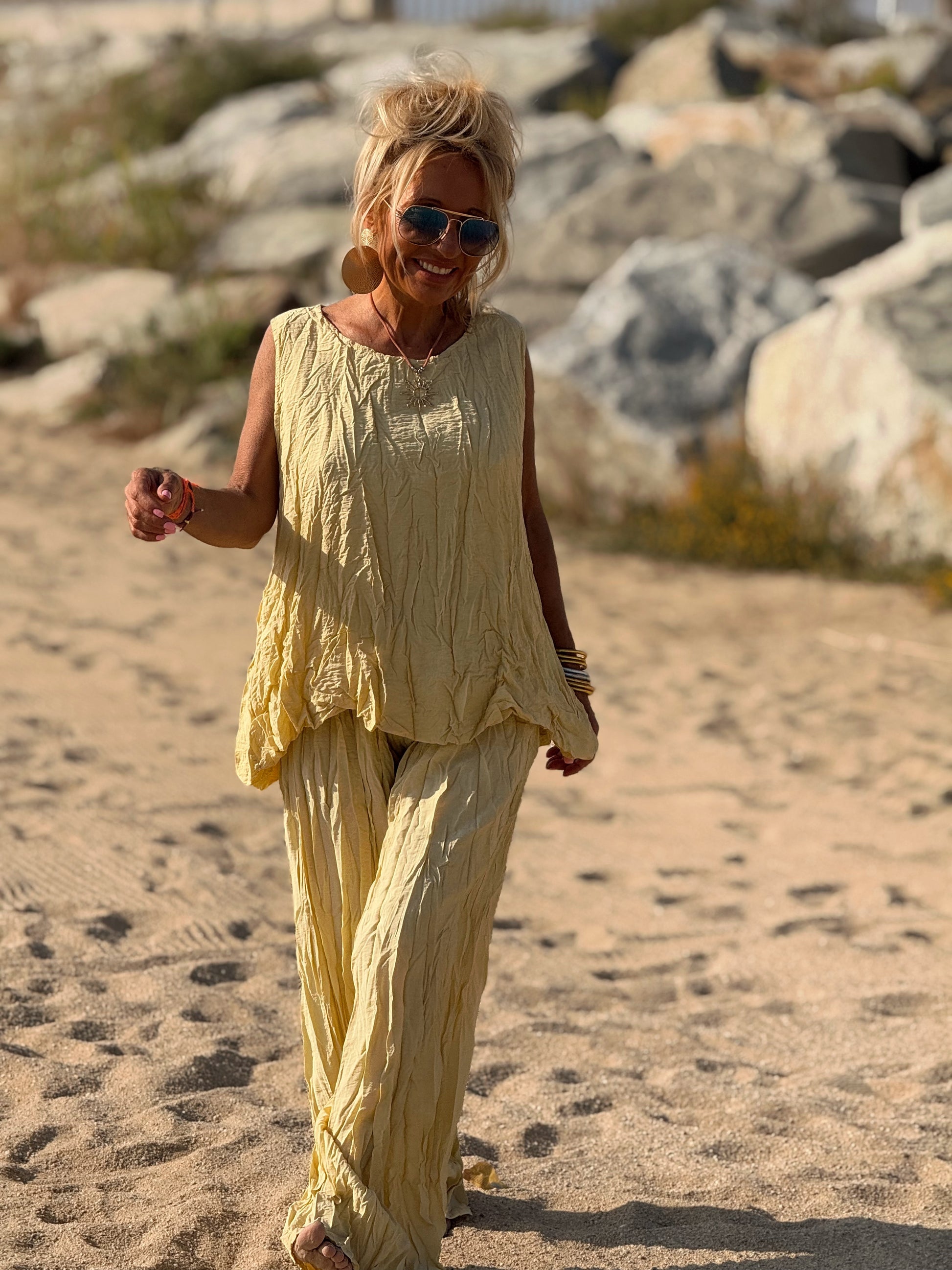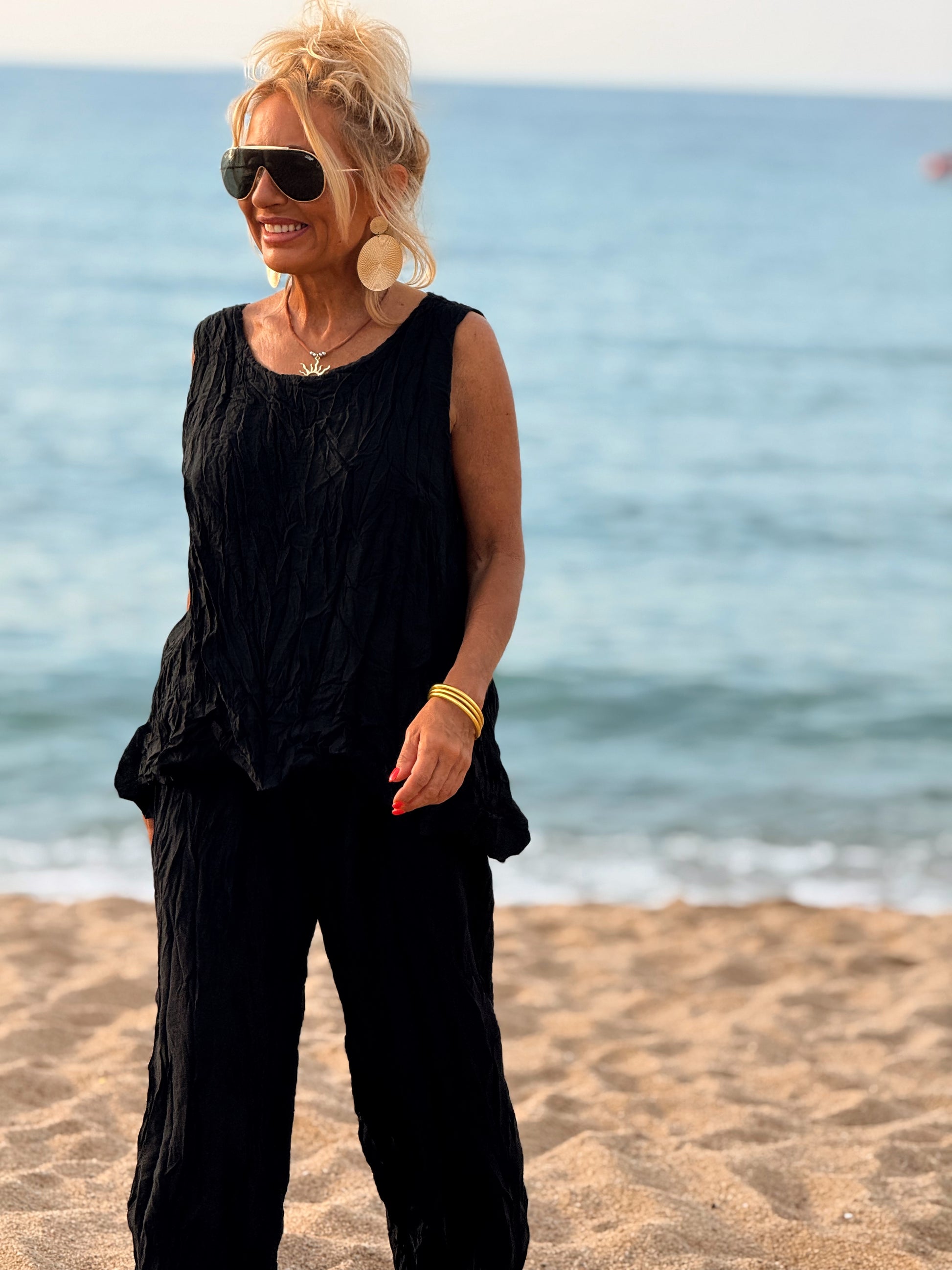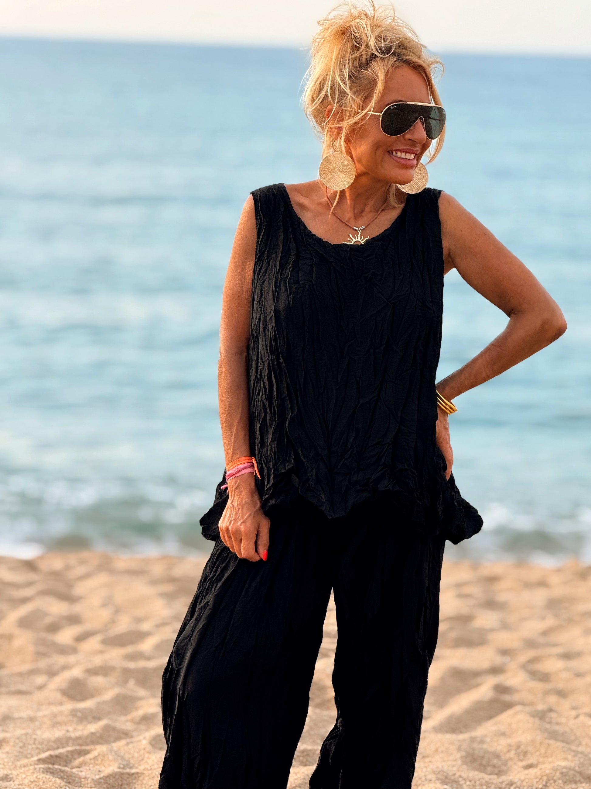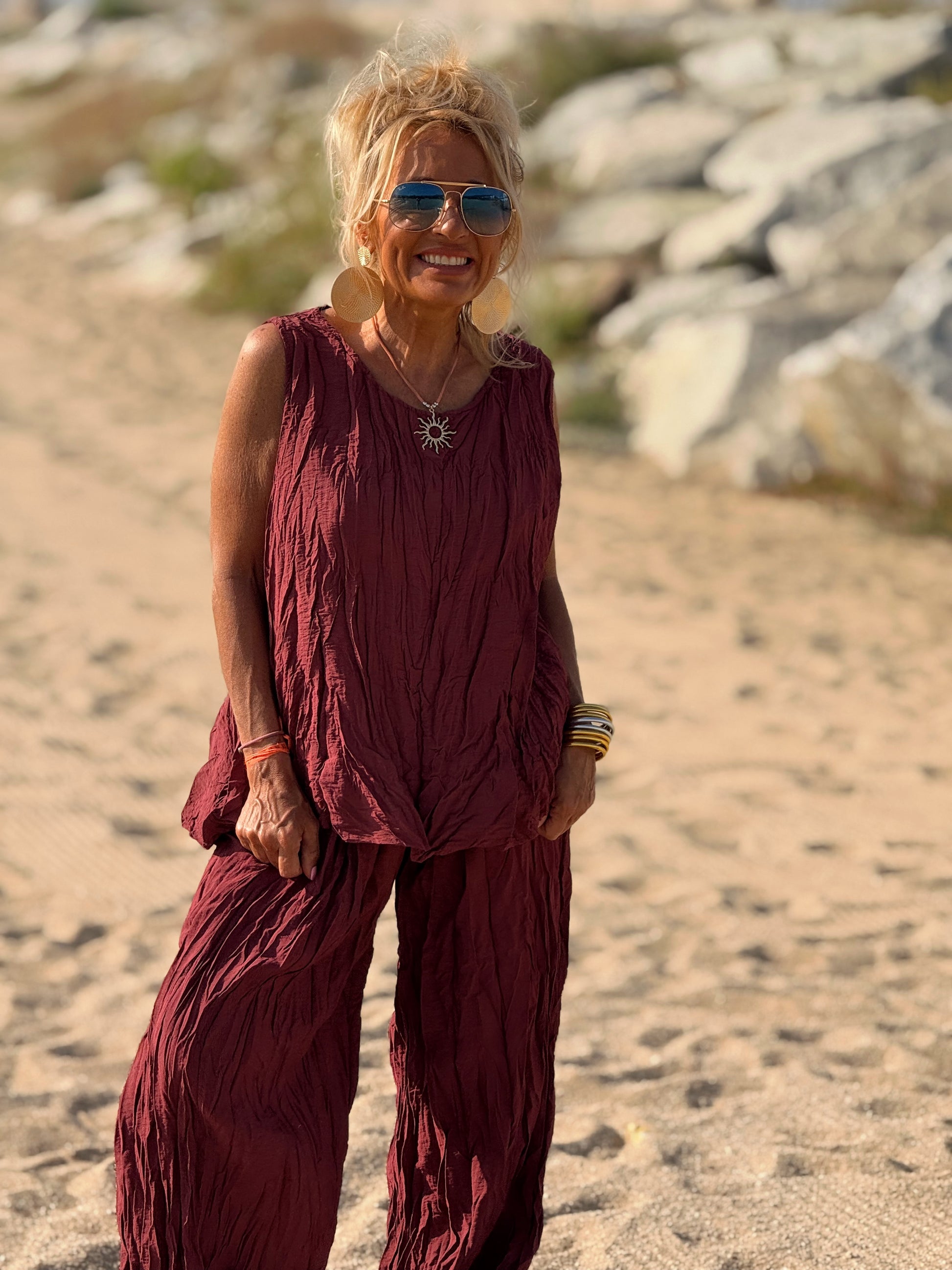 Este conjunto está formado por un top tipo blusa y un pantalón con cintura elástica. El tejido es plisado y con un efecto arrugado que se lleva así, y es justamente lo que le da todo su estilo y personalidad.