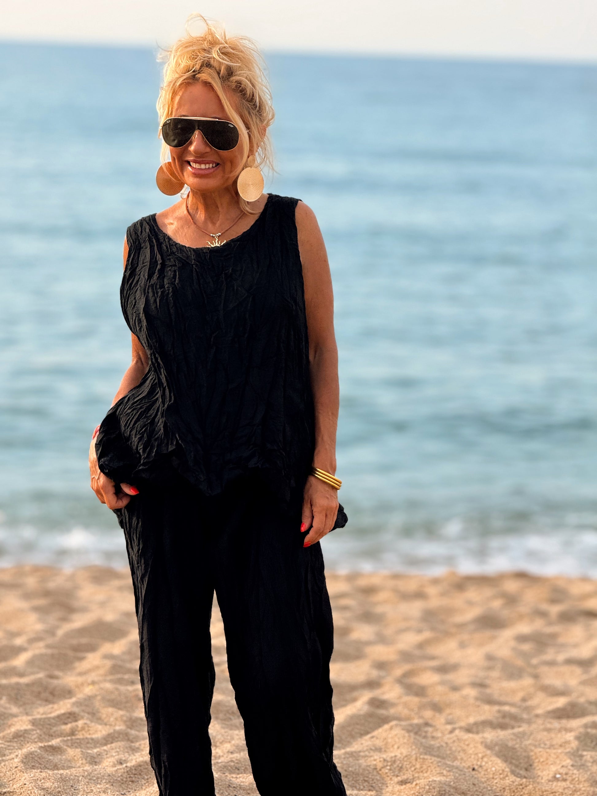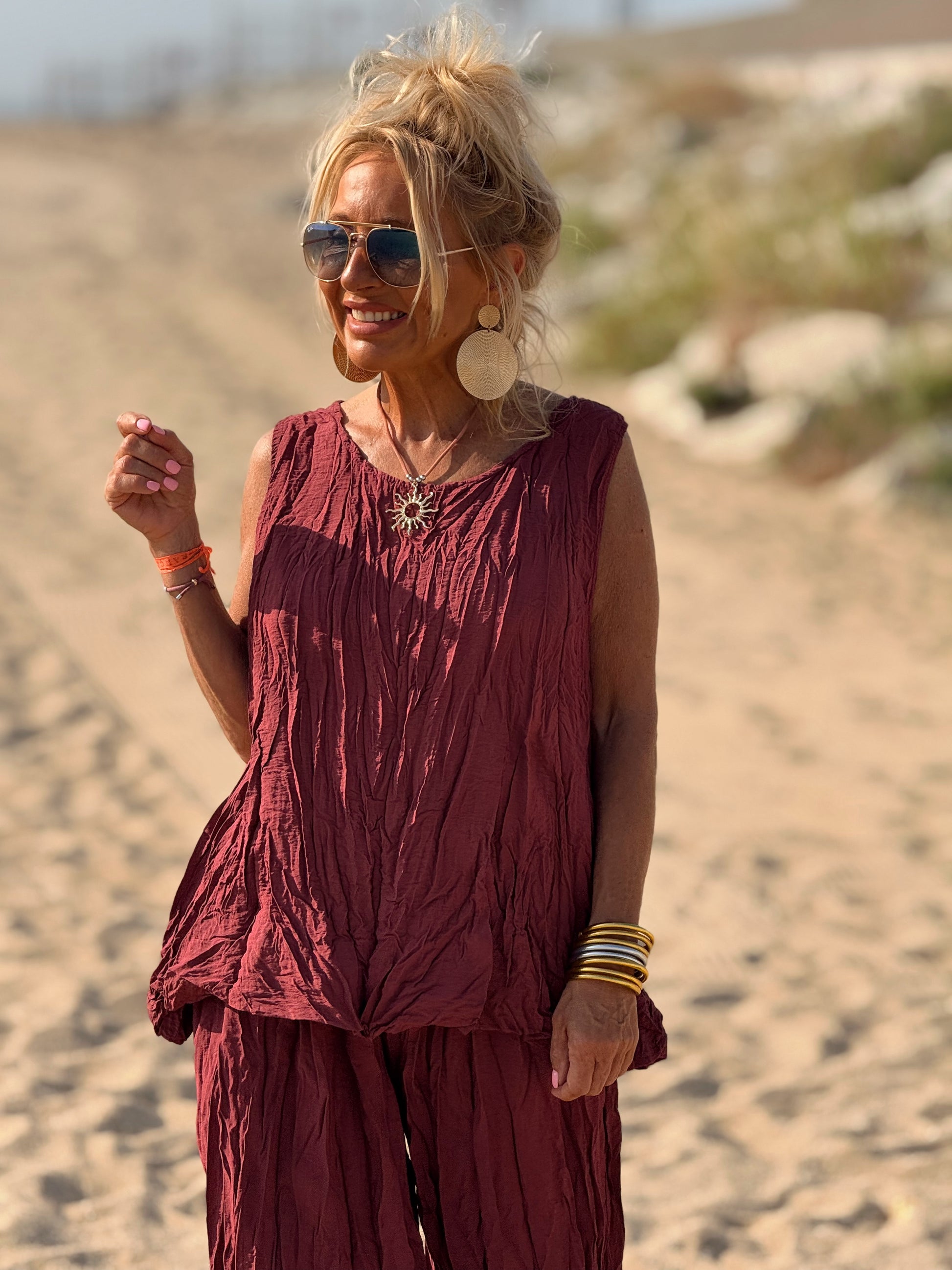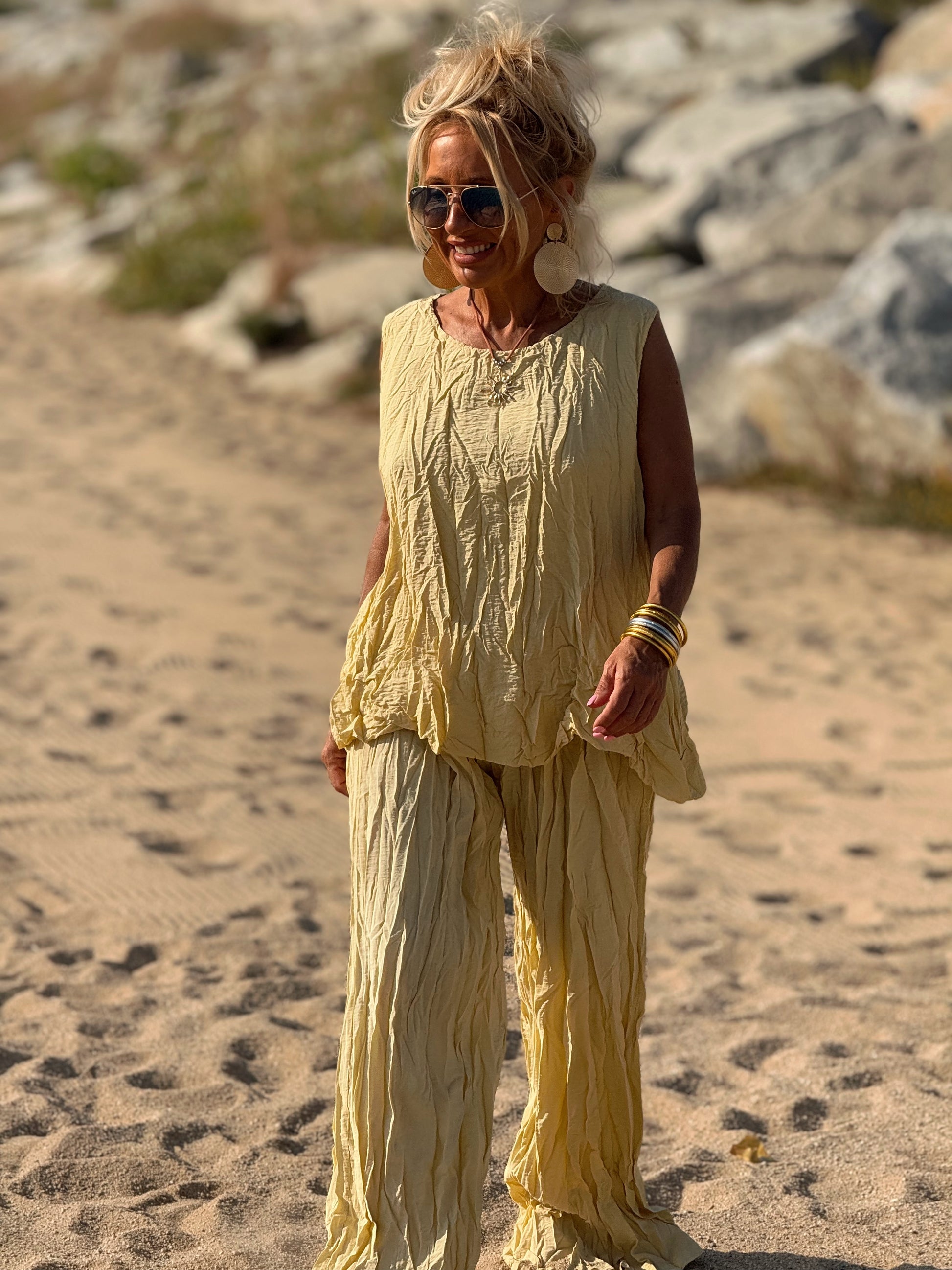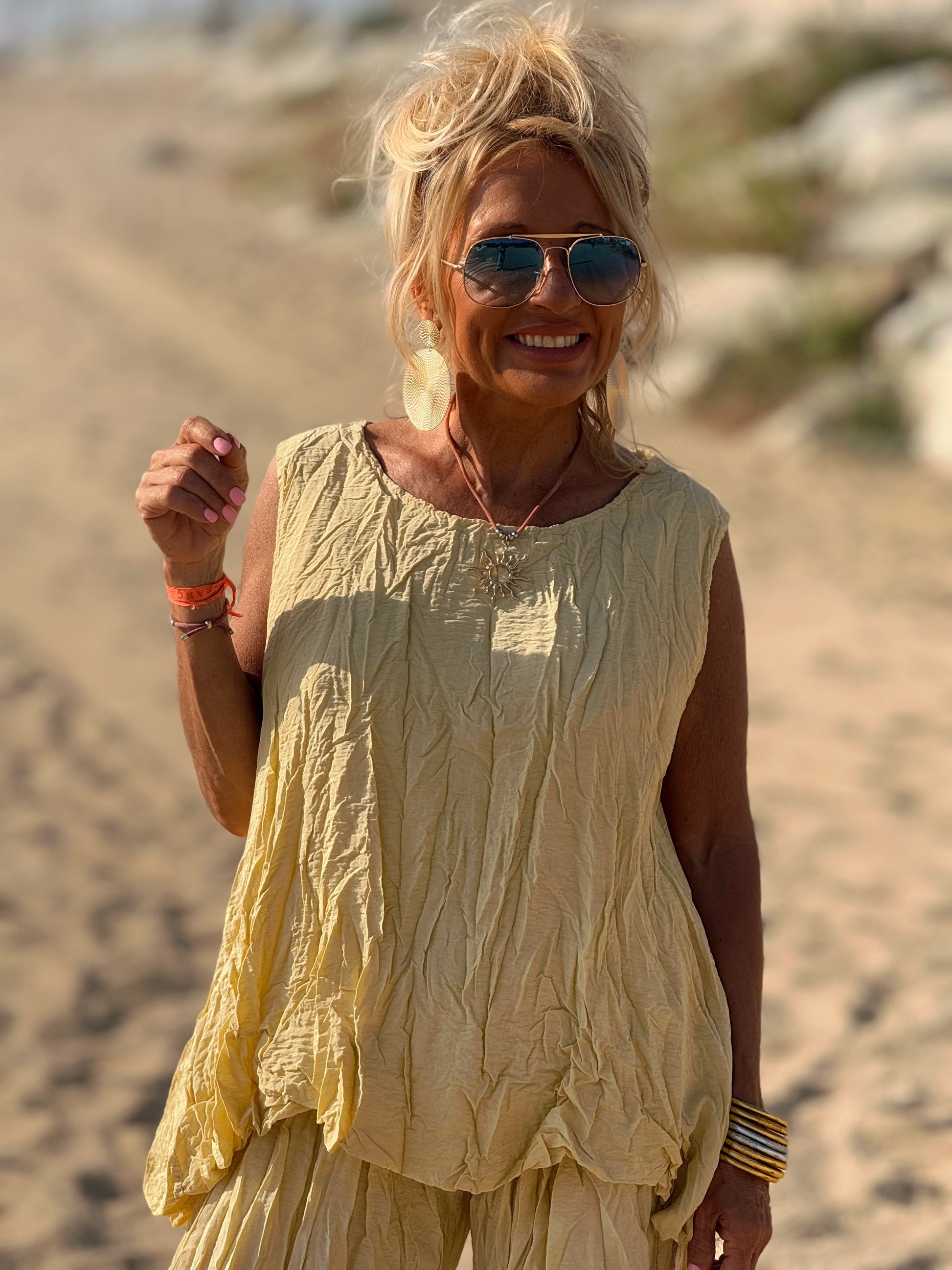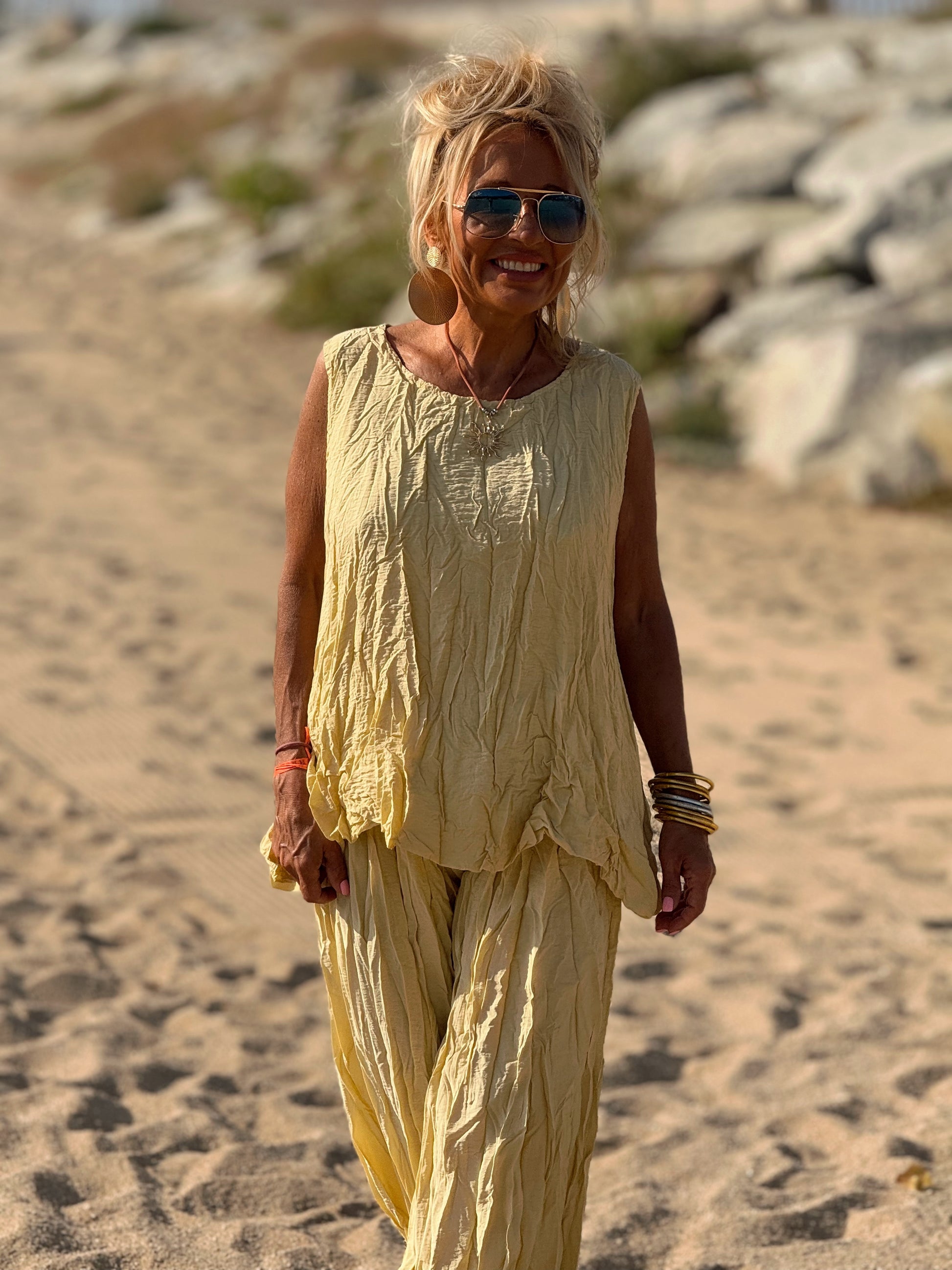 Este conjunto está formado por un top tipo blusa y un pantalón con cintura elástica. El tejido es plisado y con un efecto arrugado que se lleva así, y es justamente lo que le da todo su estilo y personalidad.