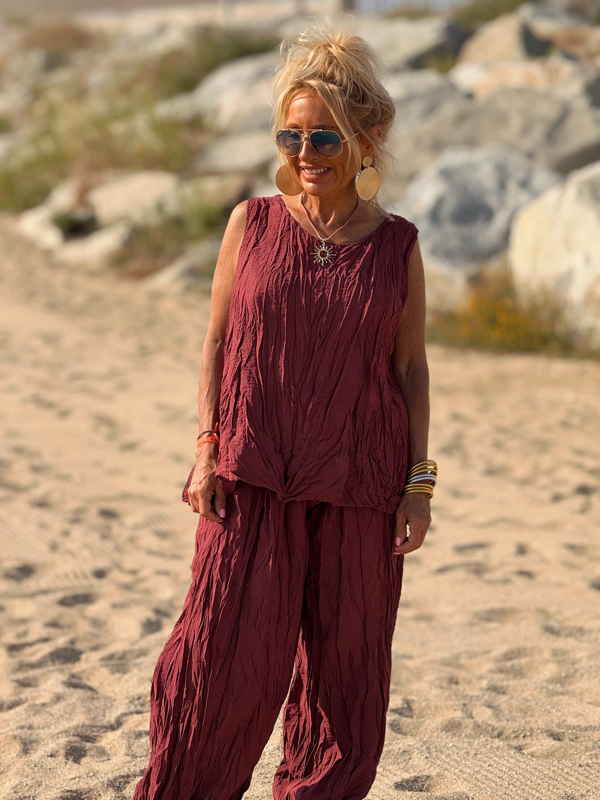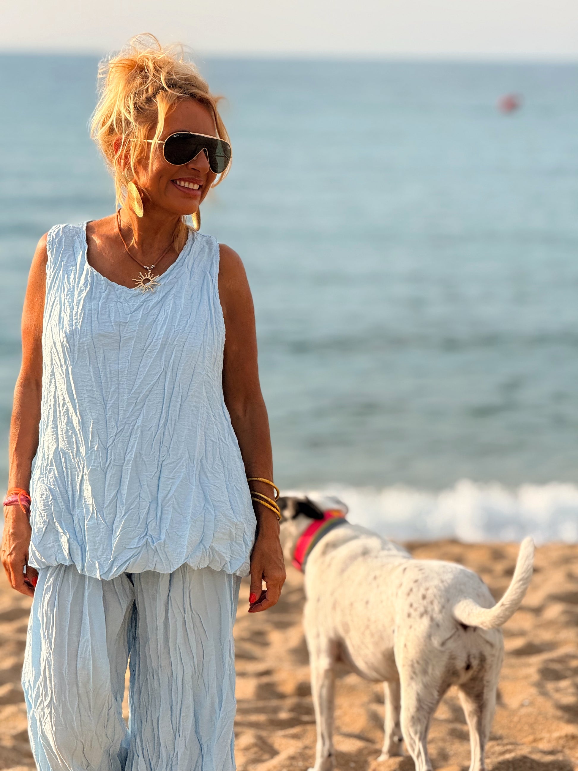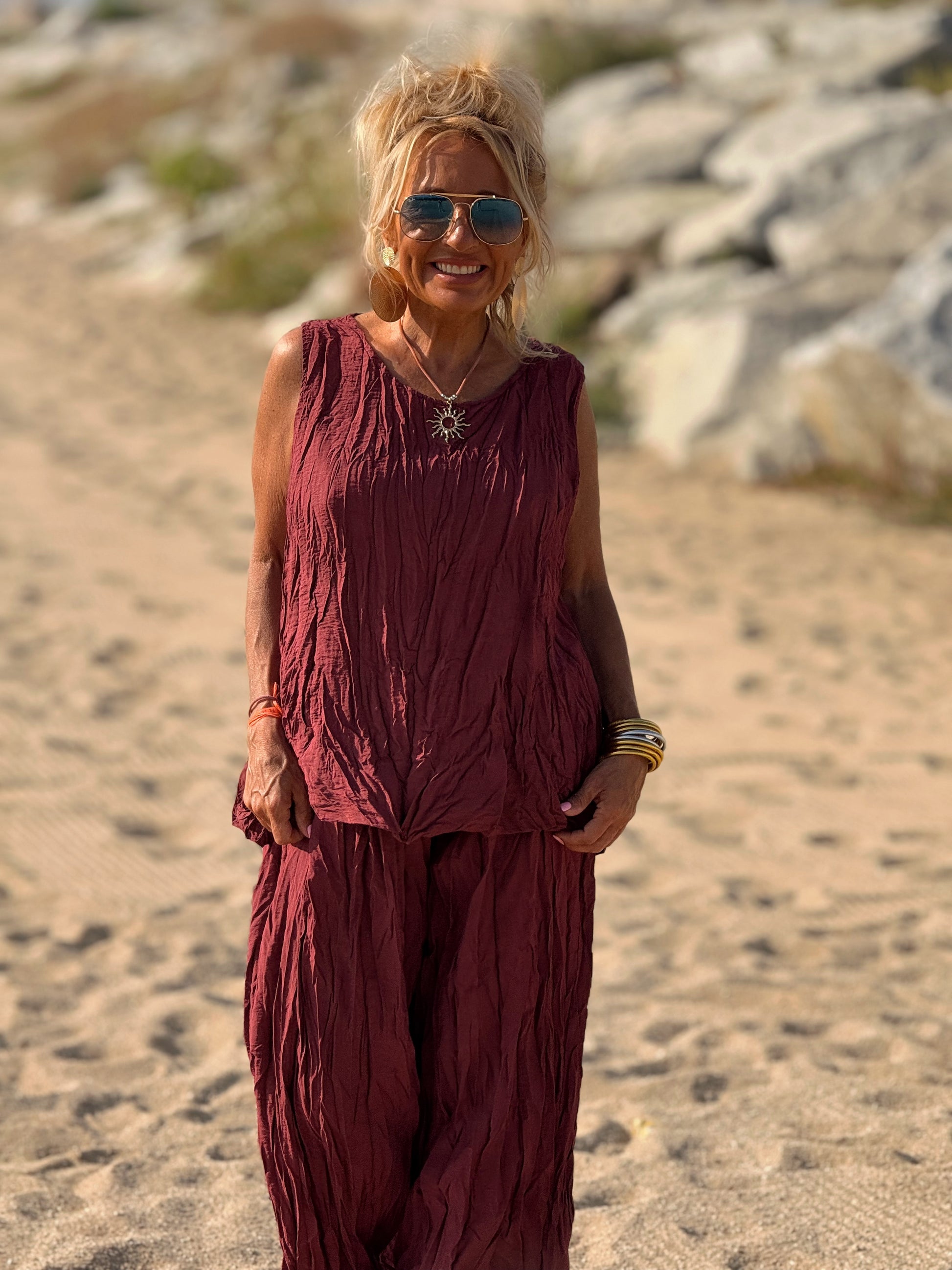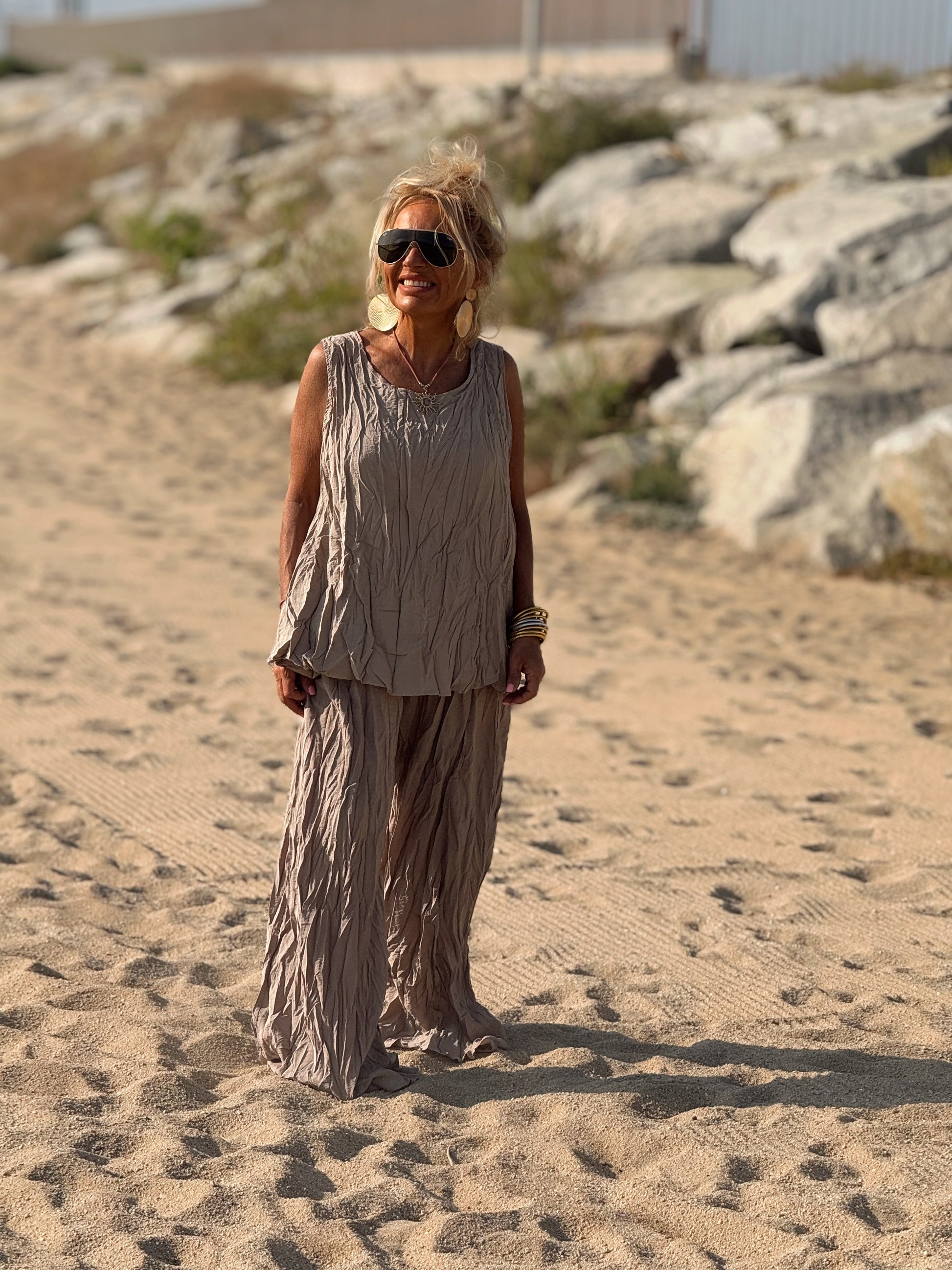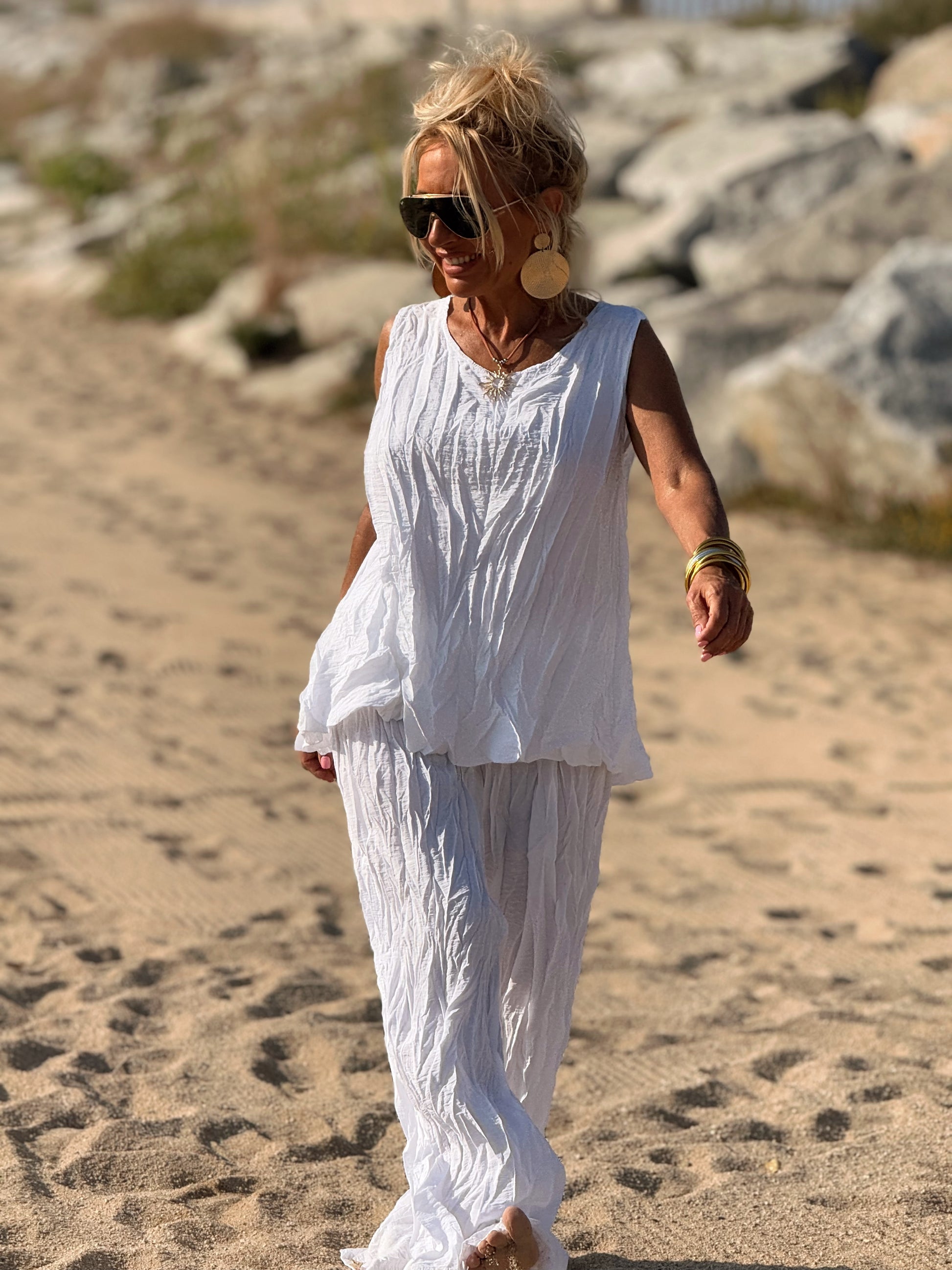 Este conjunto está formado por un top tipo blusa y un pantalón con cintura elástica. El tejido es plisado y con un efecto arrugado que se lleva así, y es justamente lo que le da todo su estilo y personalidad.