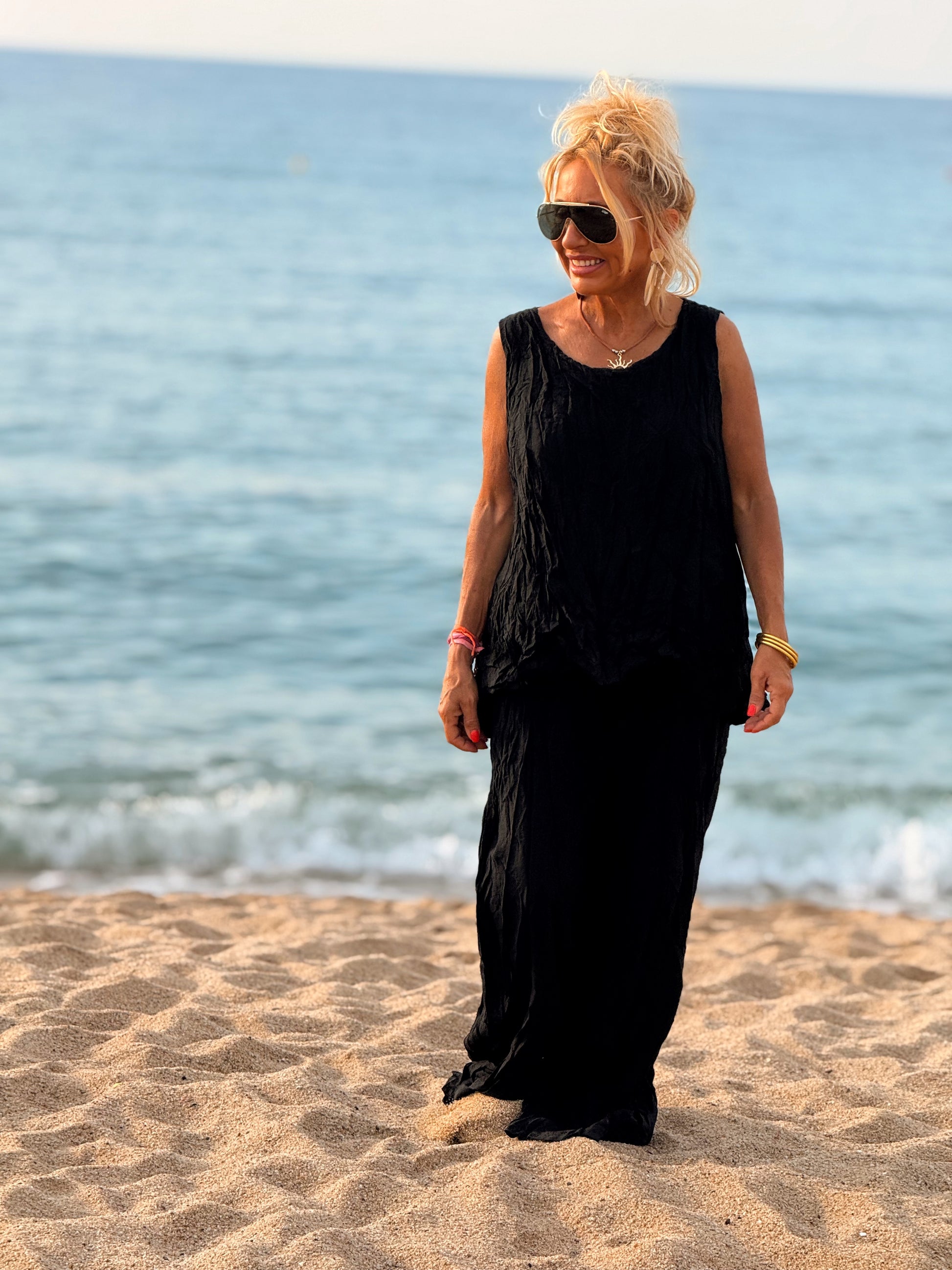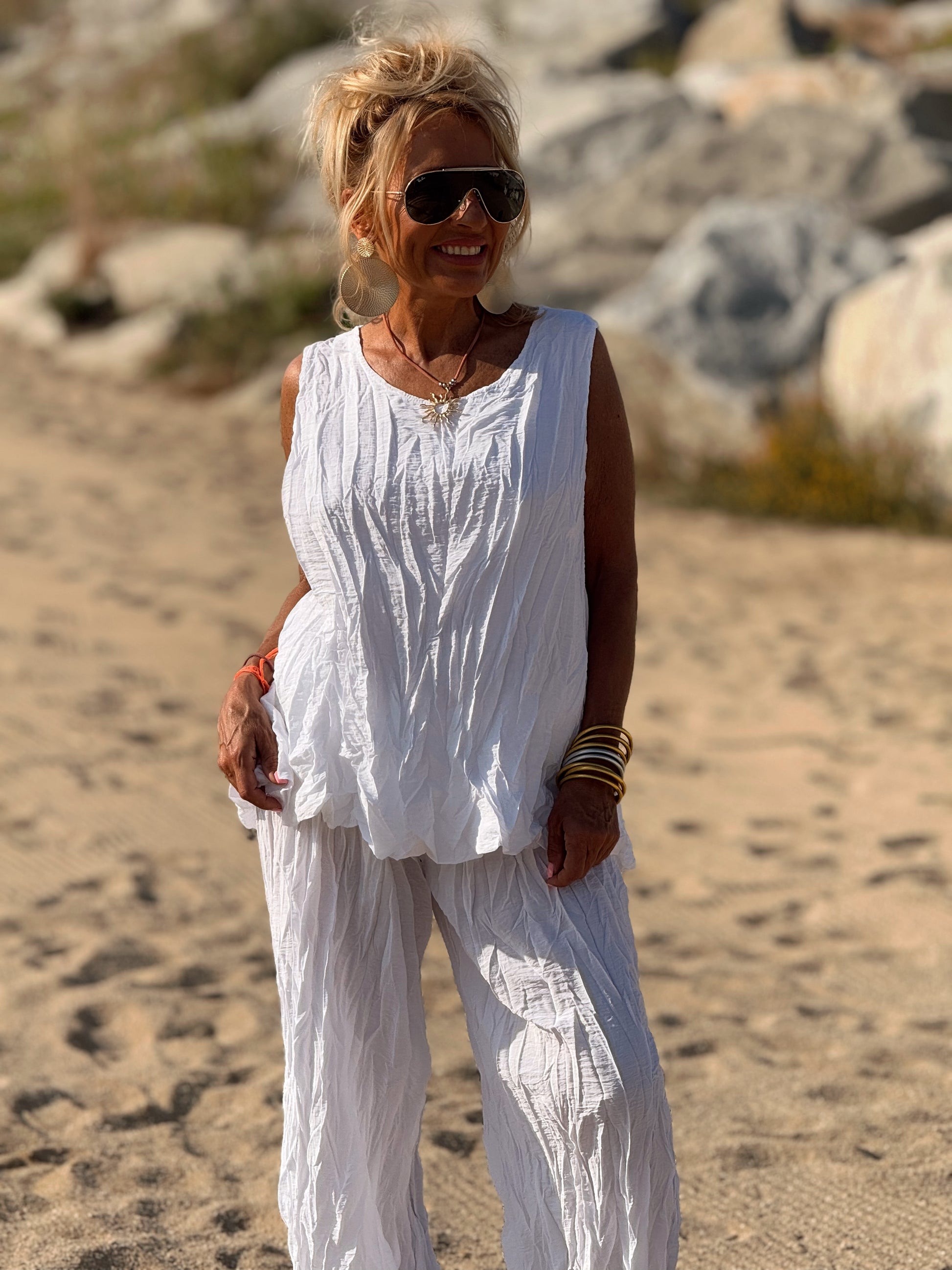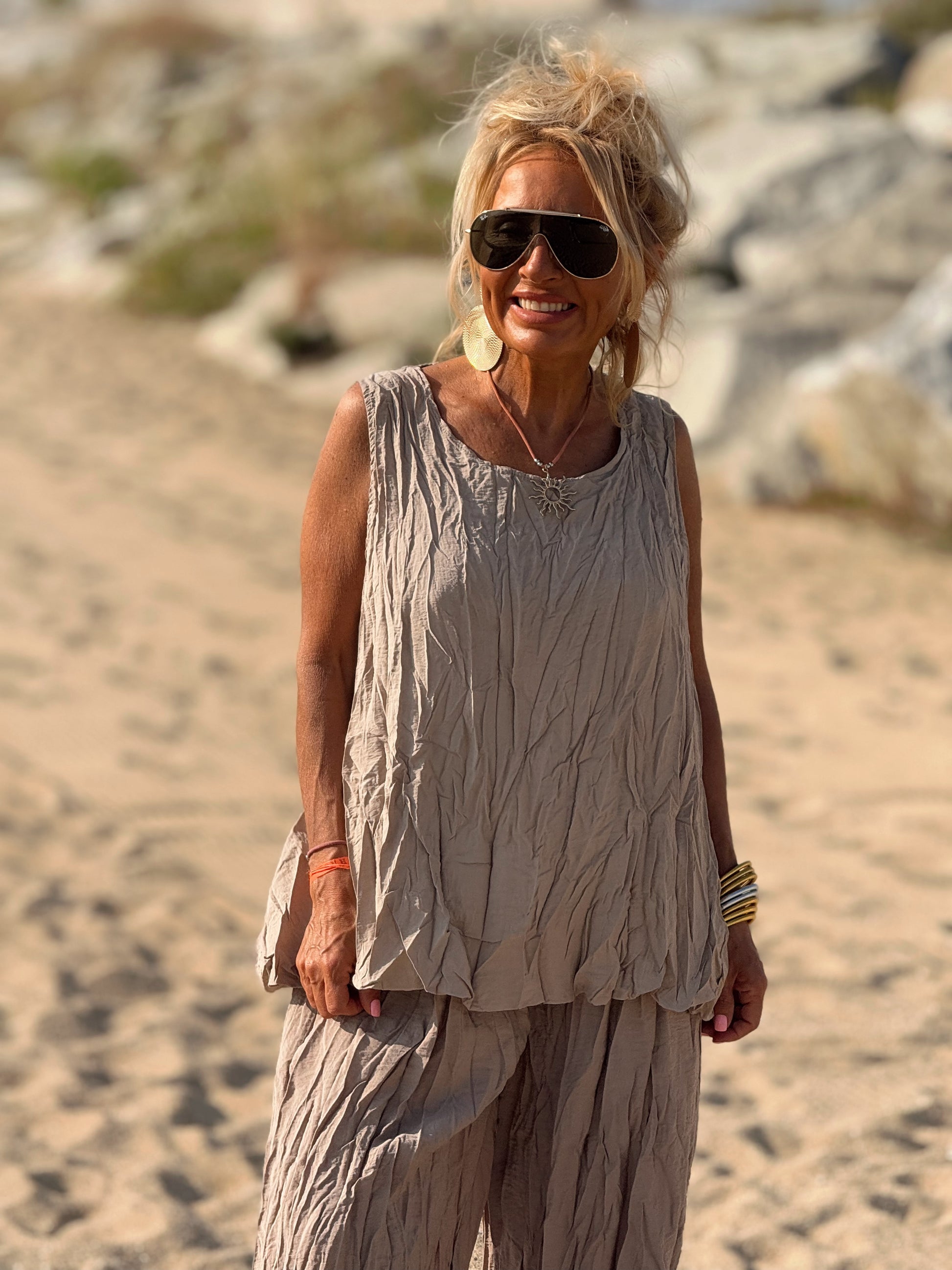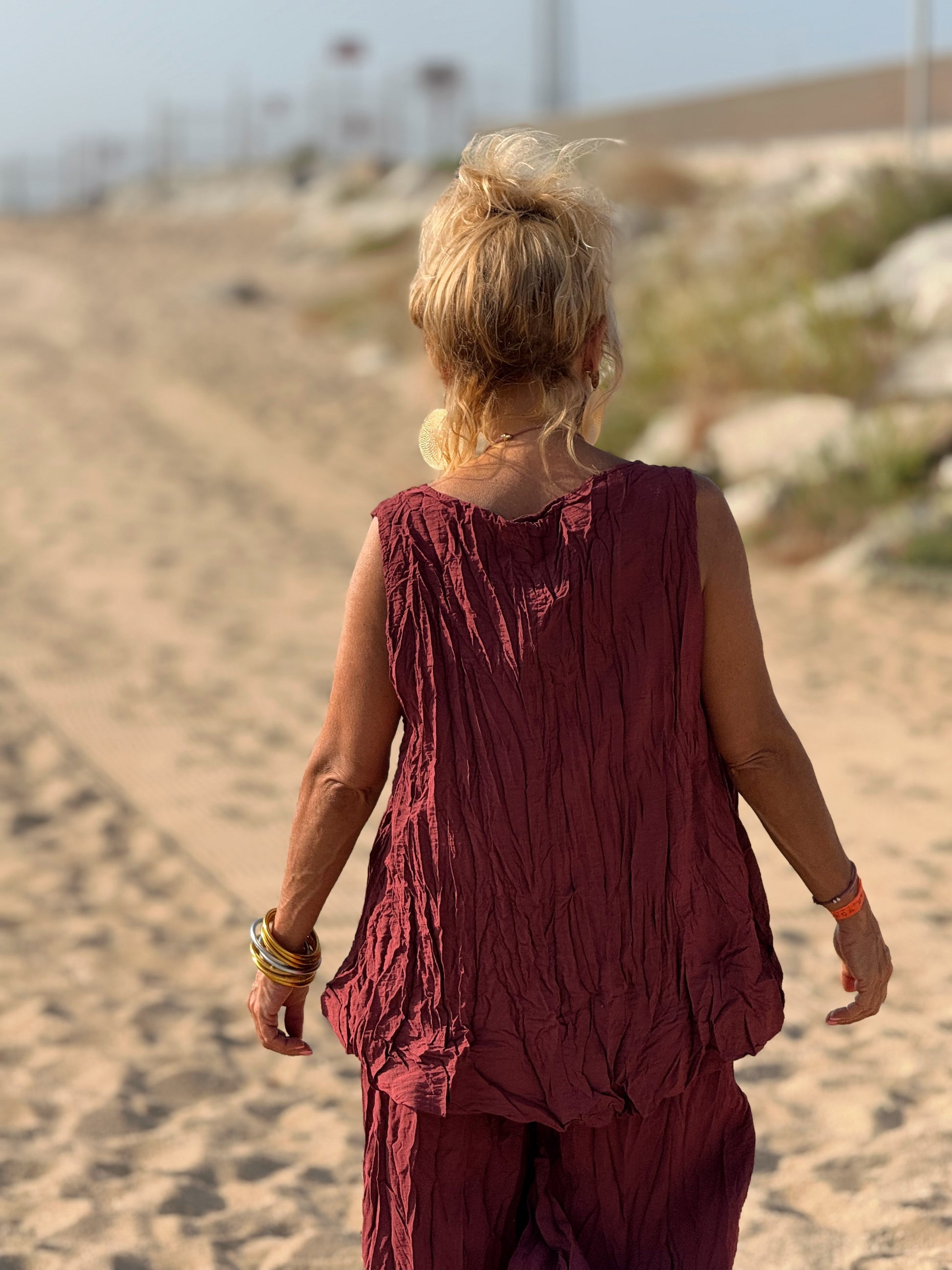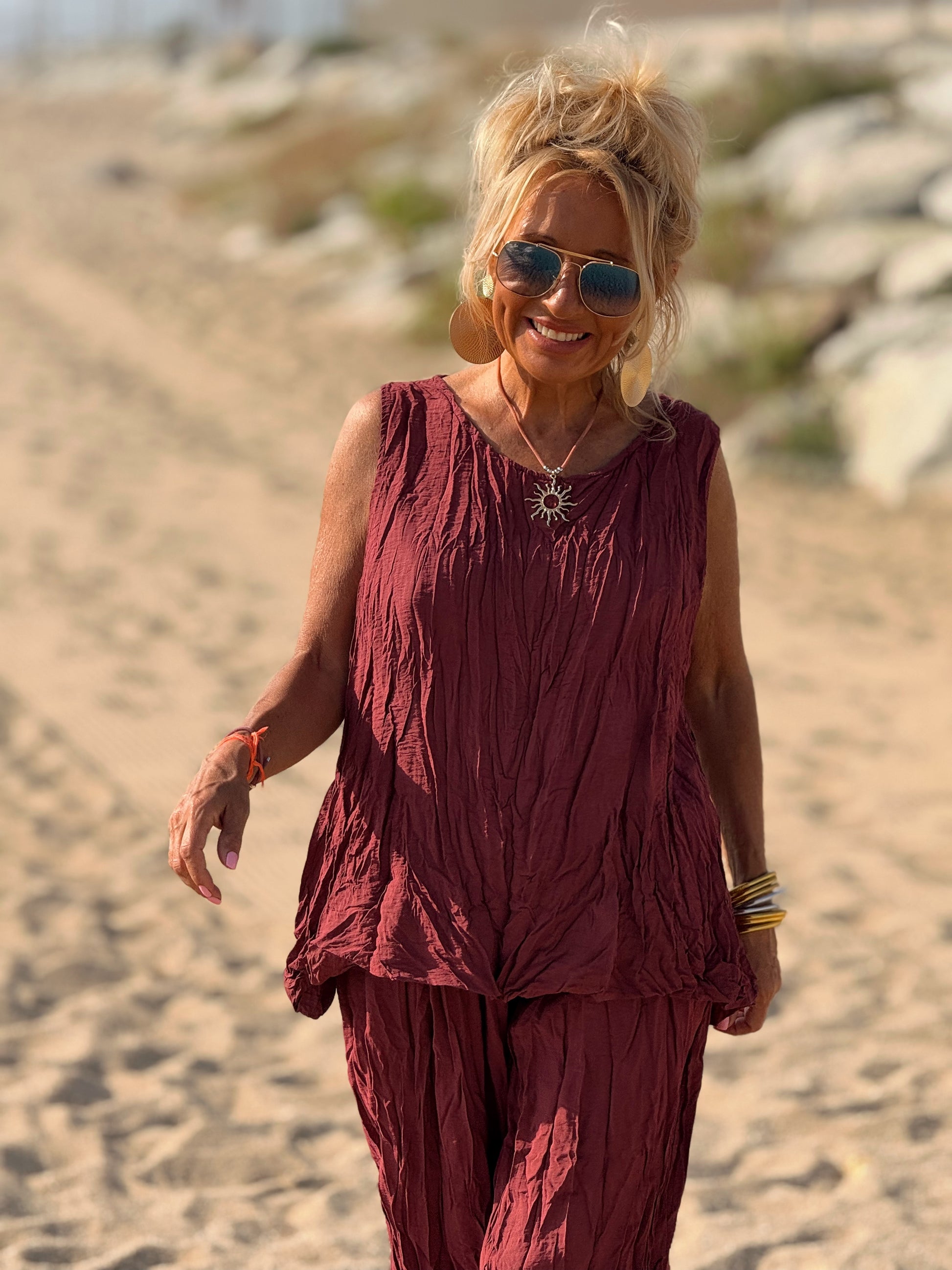 Este conjunto está formado por un top tipo blusa y un pantalón con cintura elástica. El tejido es plisado y con un efecto arrugado que se lleva así, y es justamente lo que le da todo su estilo y personalidad.