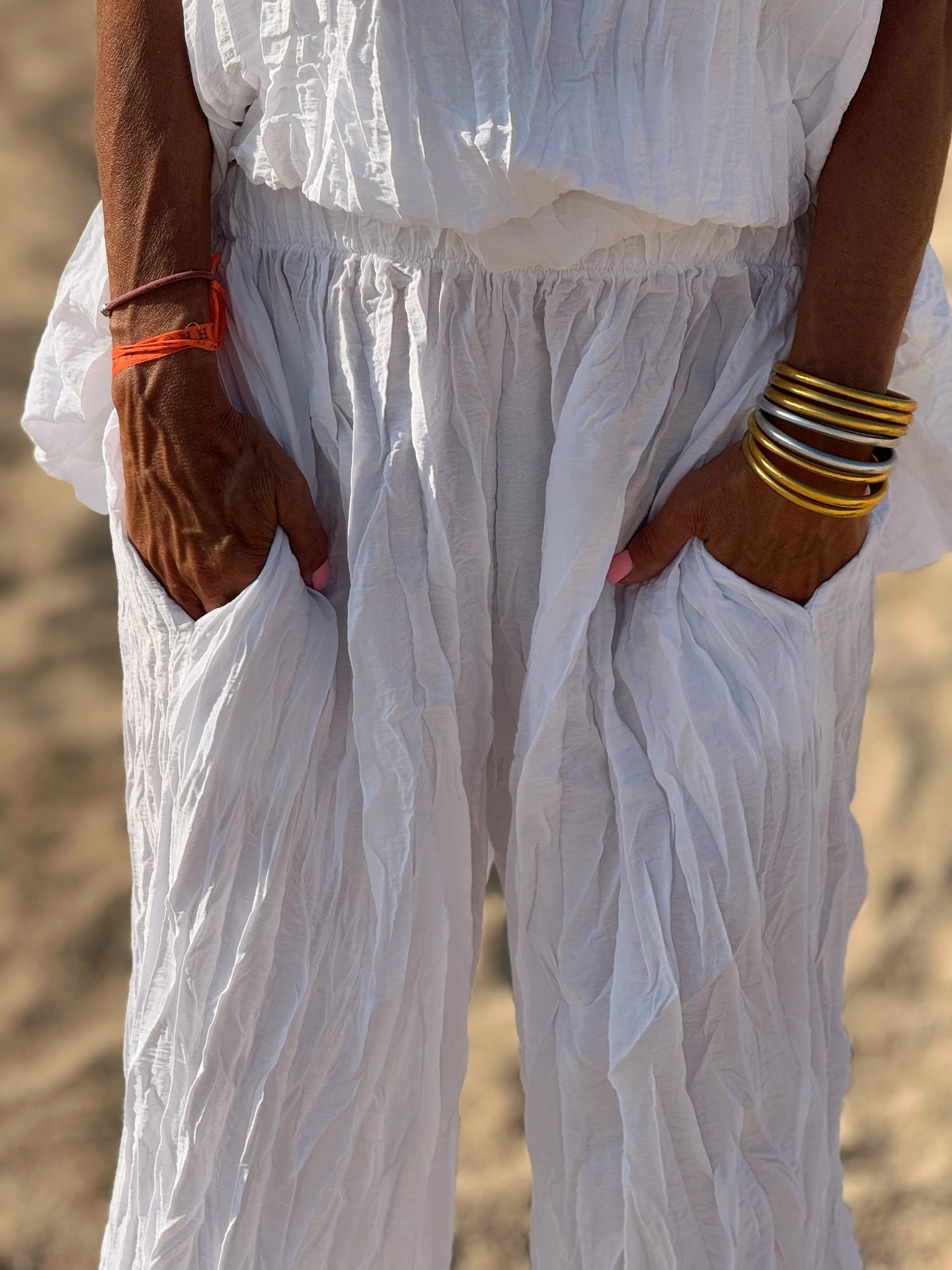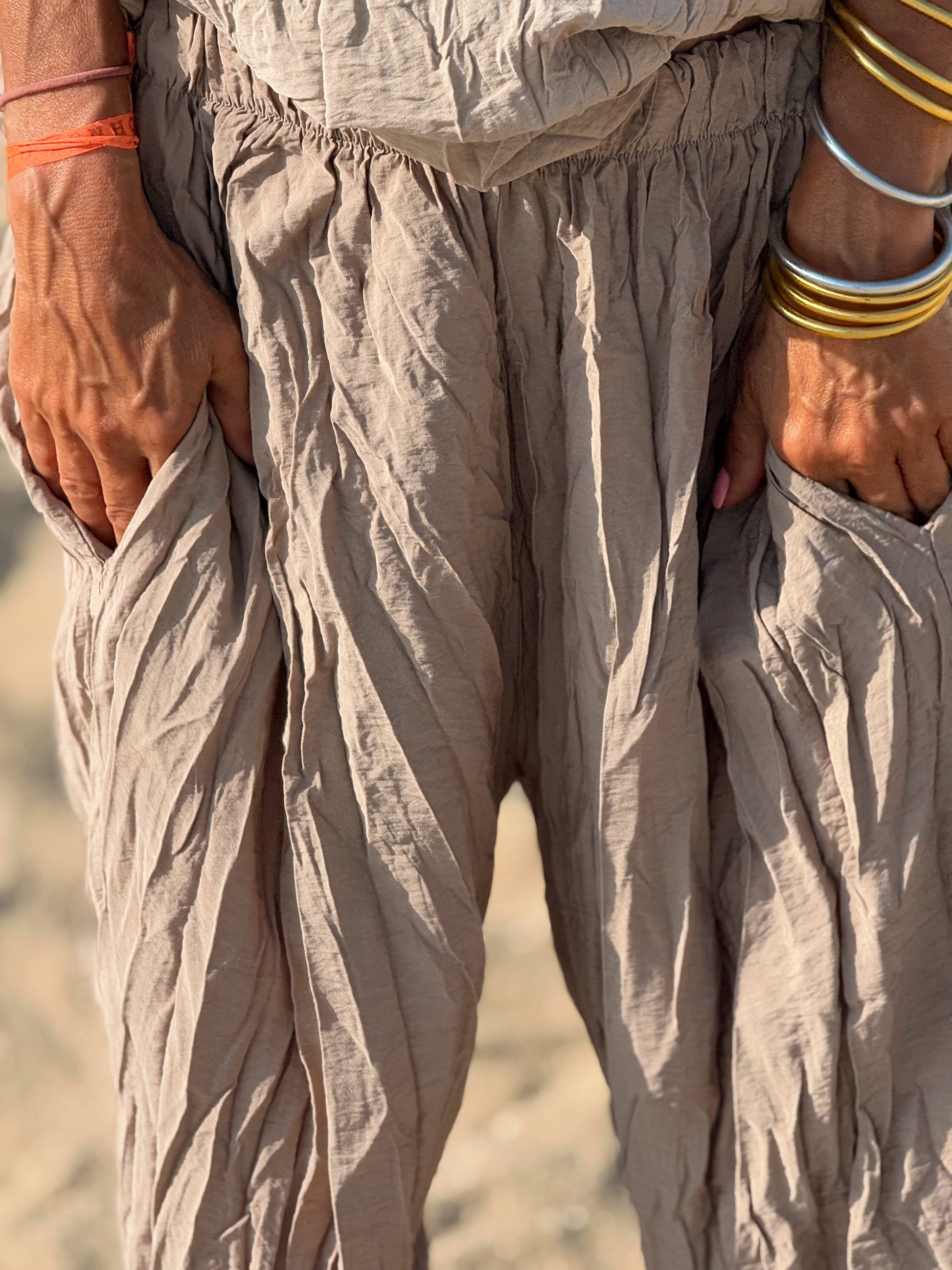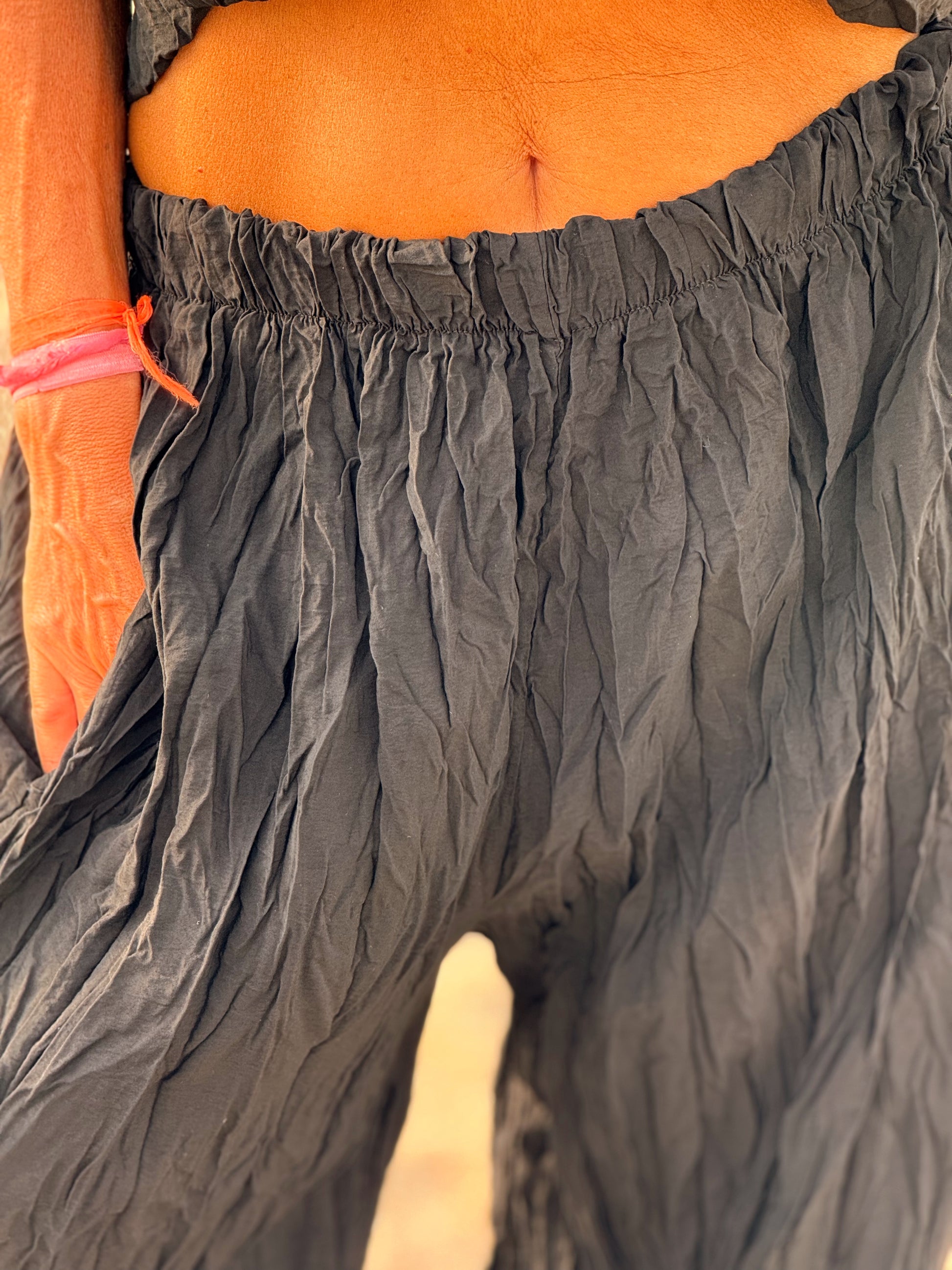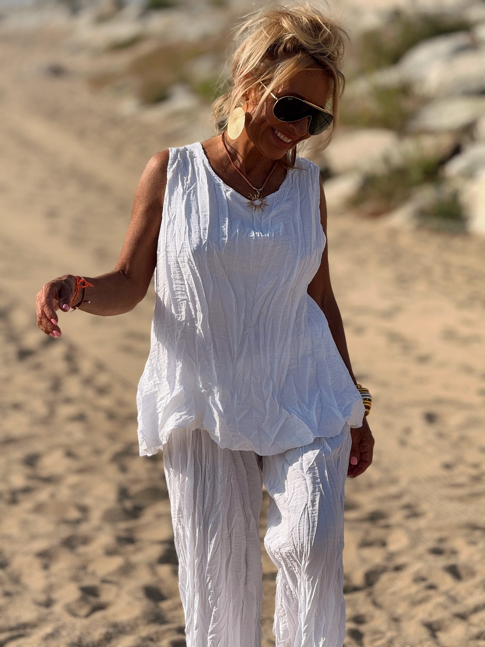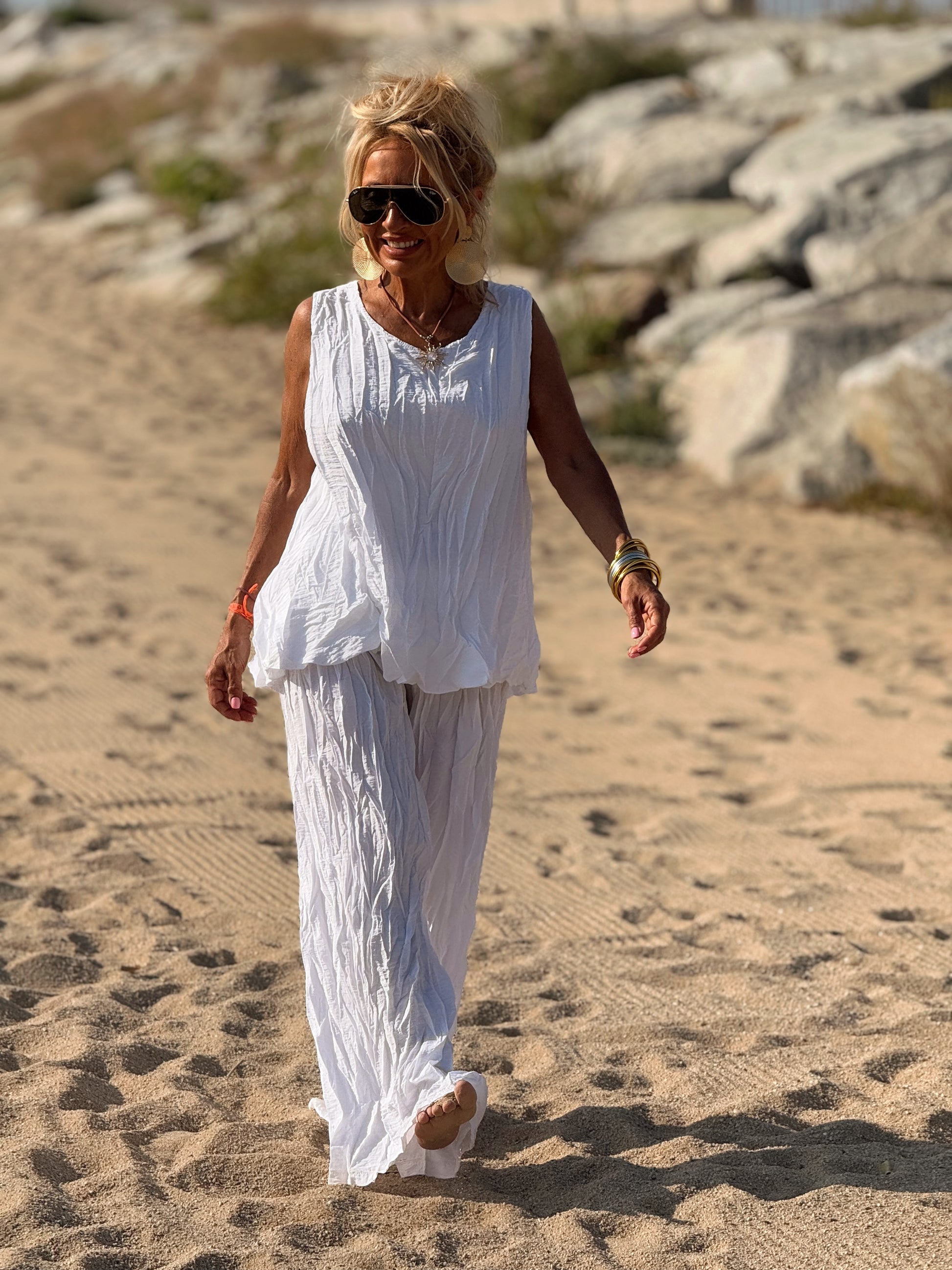Este conjunto está formado por un top tipo blusa y un pantalón con cintura elástica. El tejido es plisado y con un efecto arrugado que se lleva así, y es justamente lo que le da todo su estilo y personalidad.