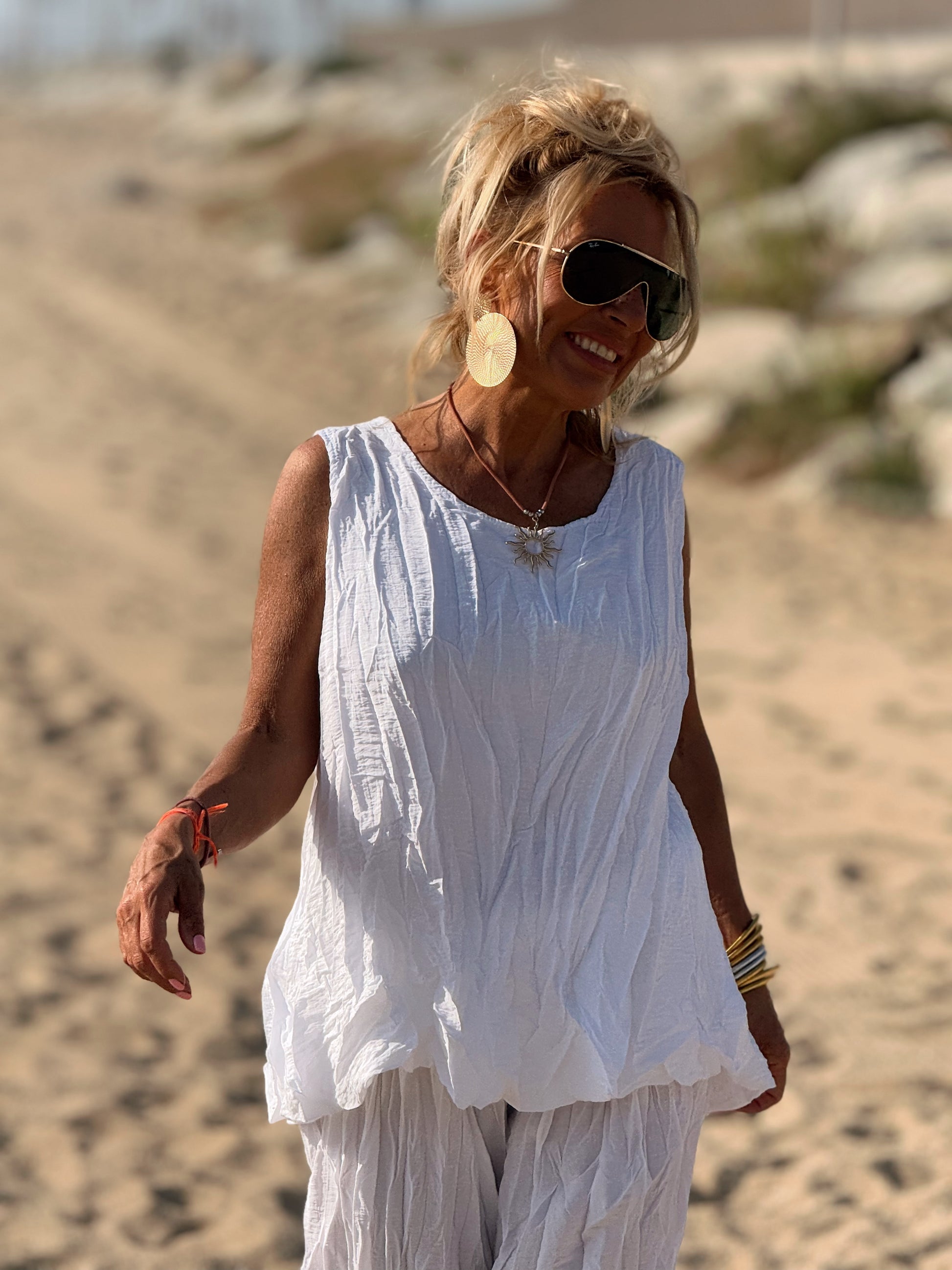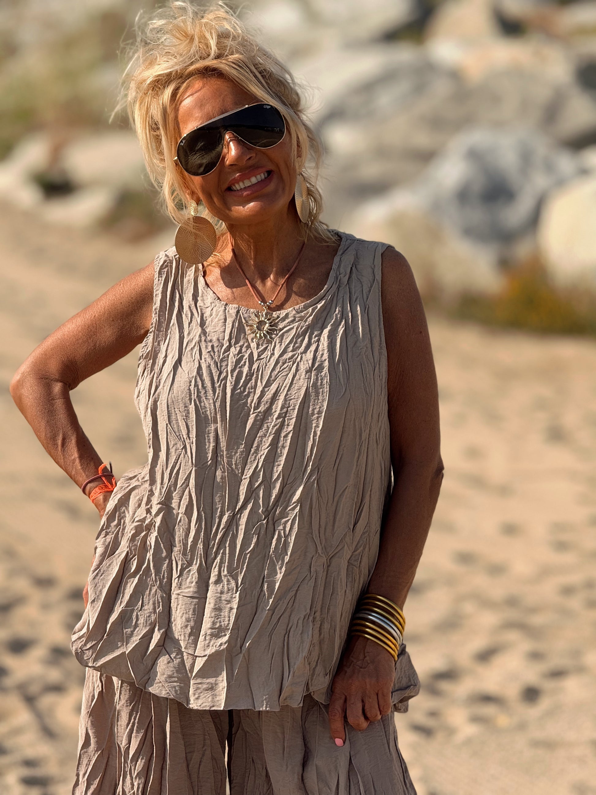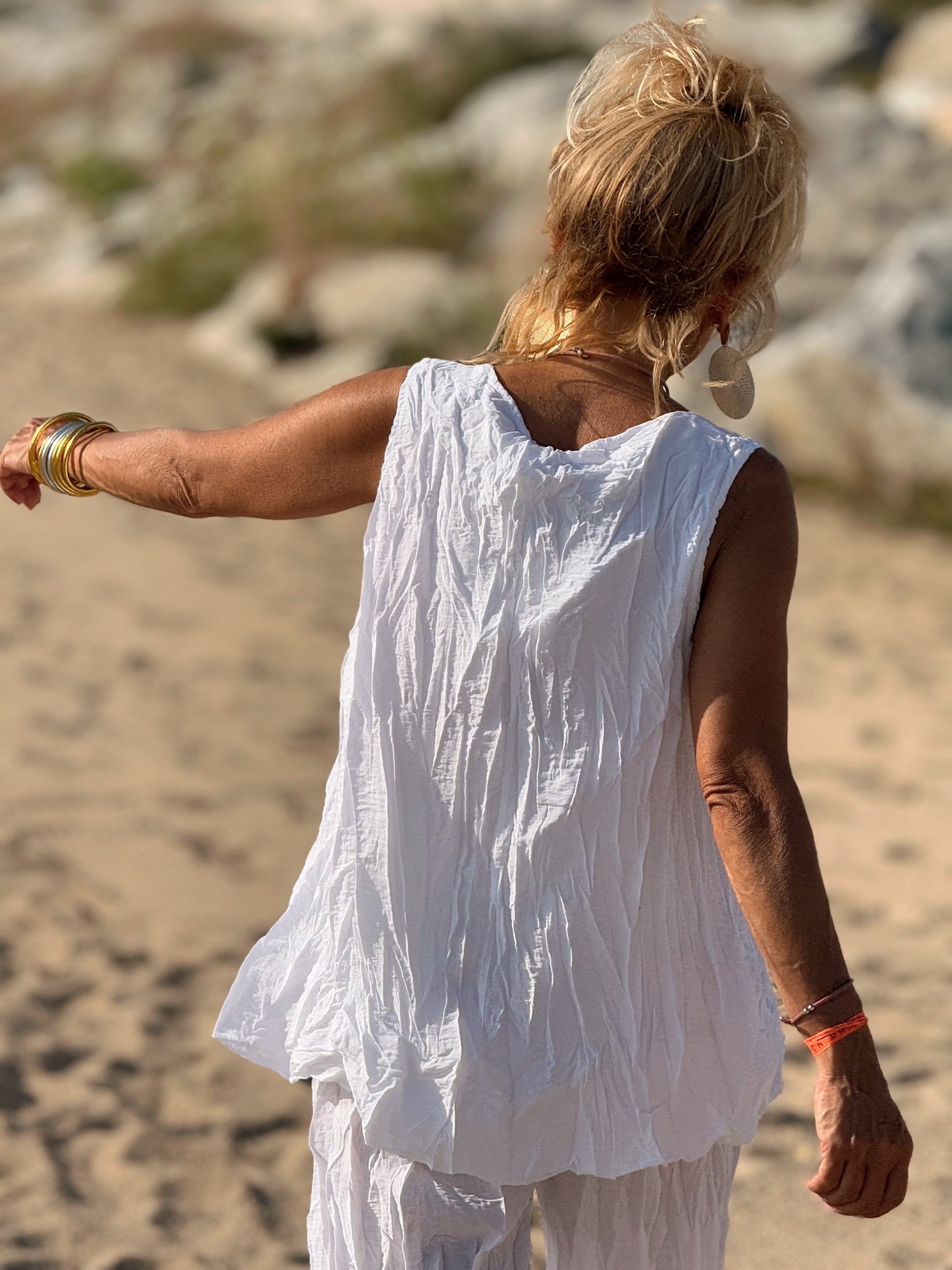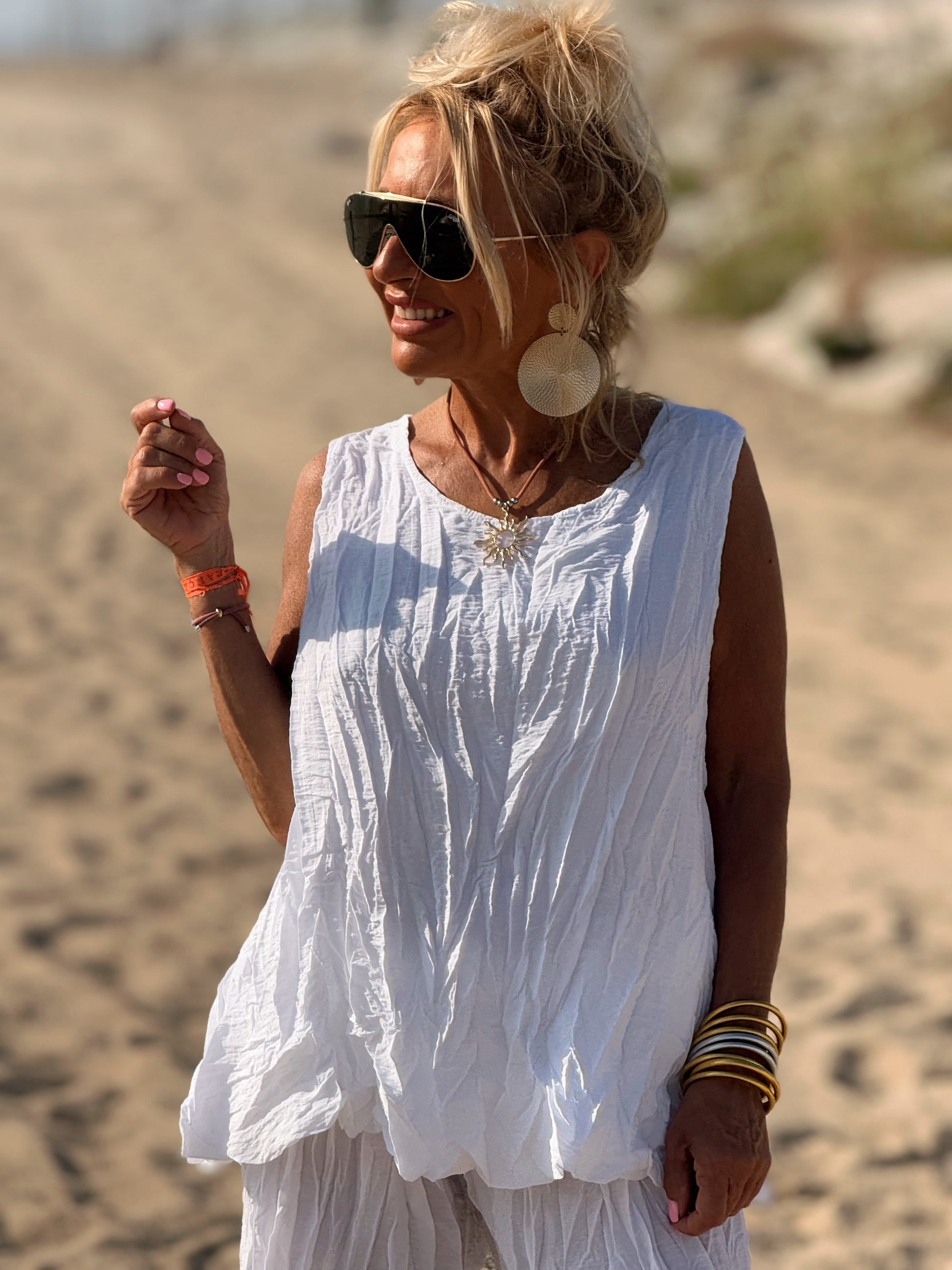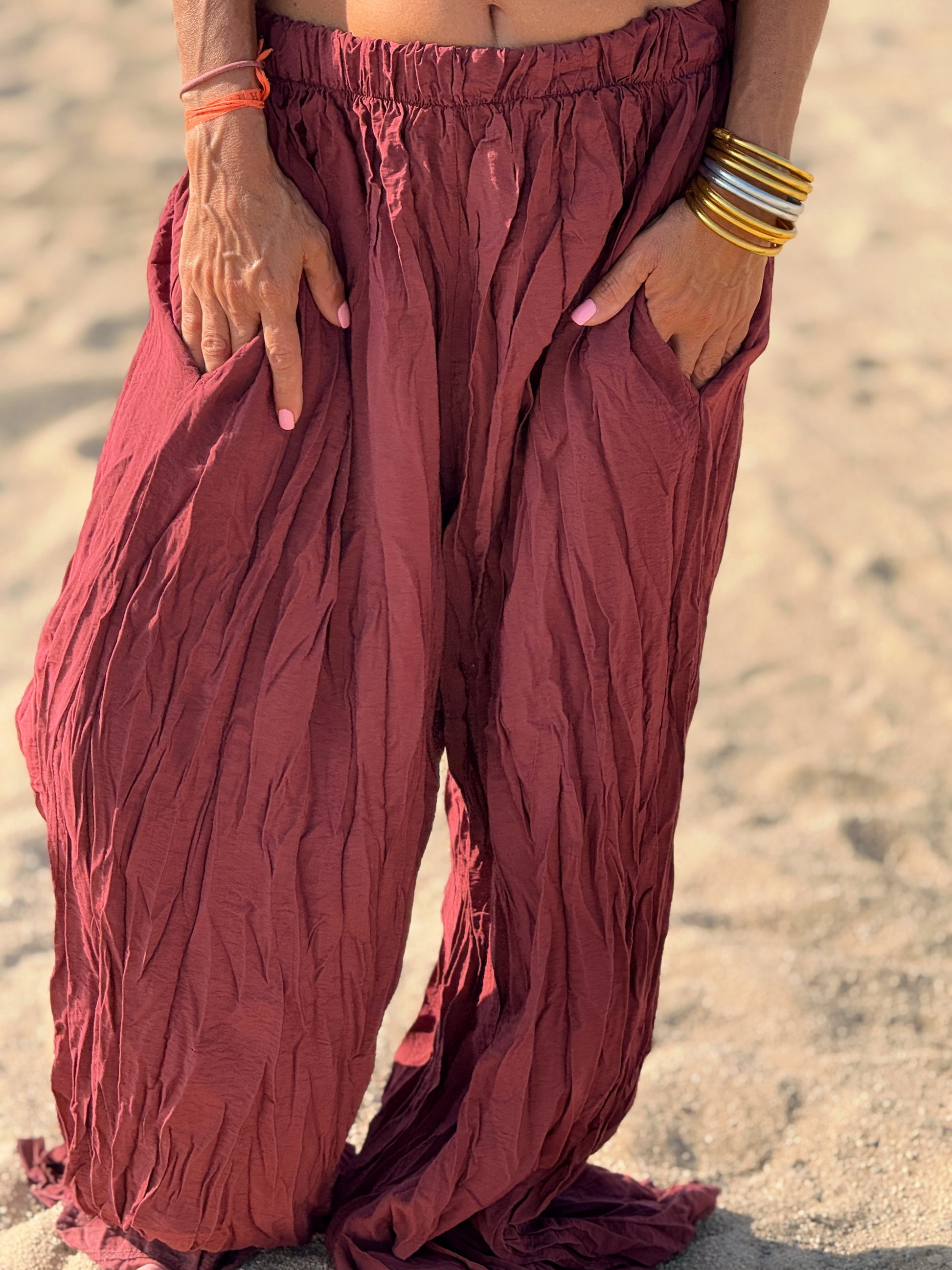 Este conjunto está formado por un top tipo blusa y un pantalón con cintura elástica. El tejido es plisado y con un efecto arrugado que se lleva así, y es justamente lo que le da todo su estilo y personalidad.