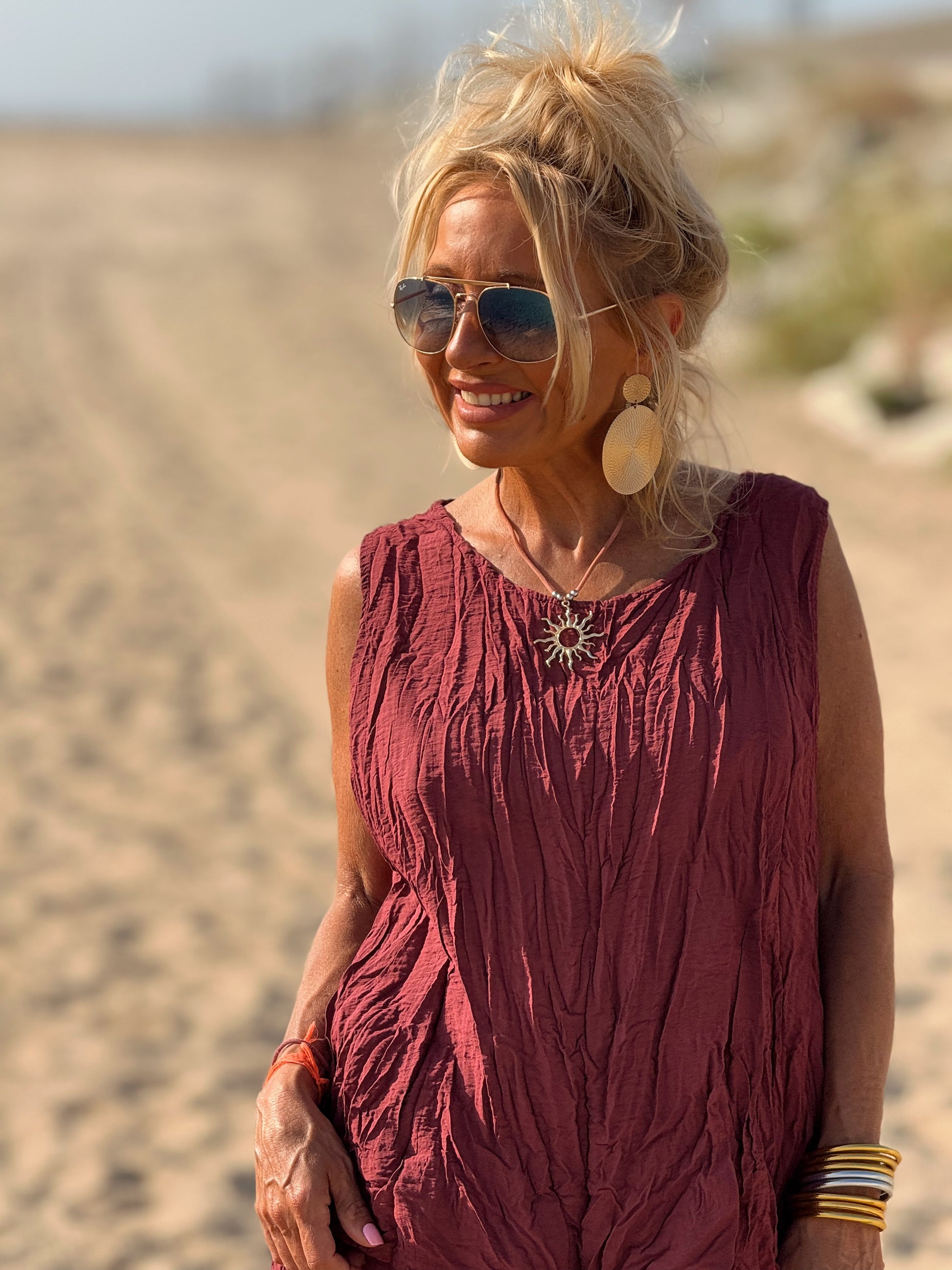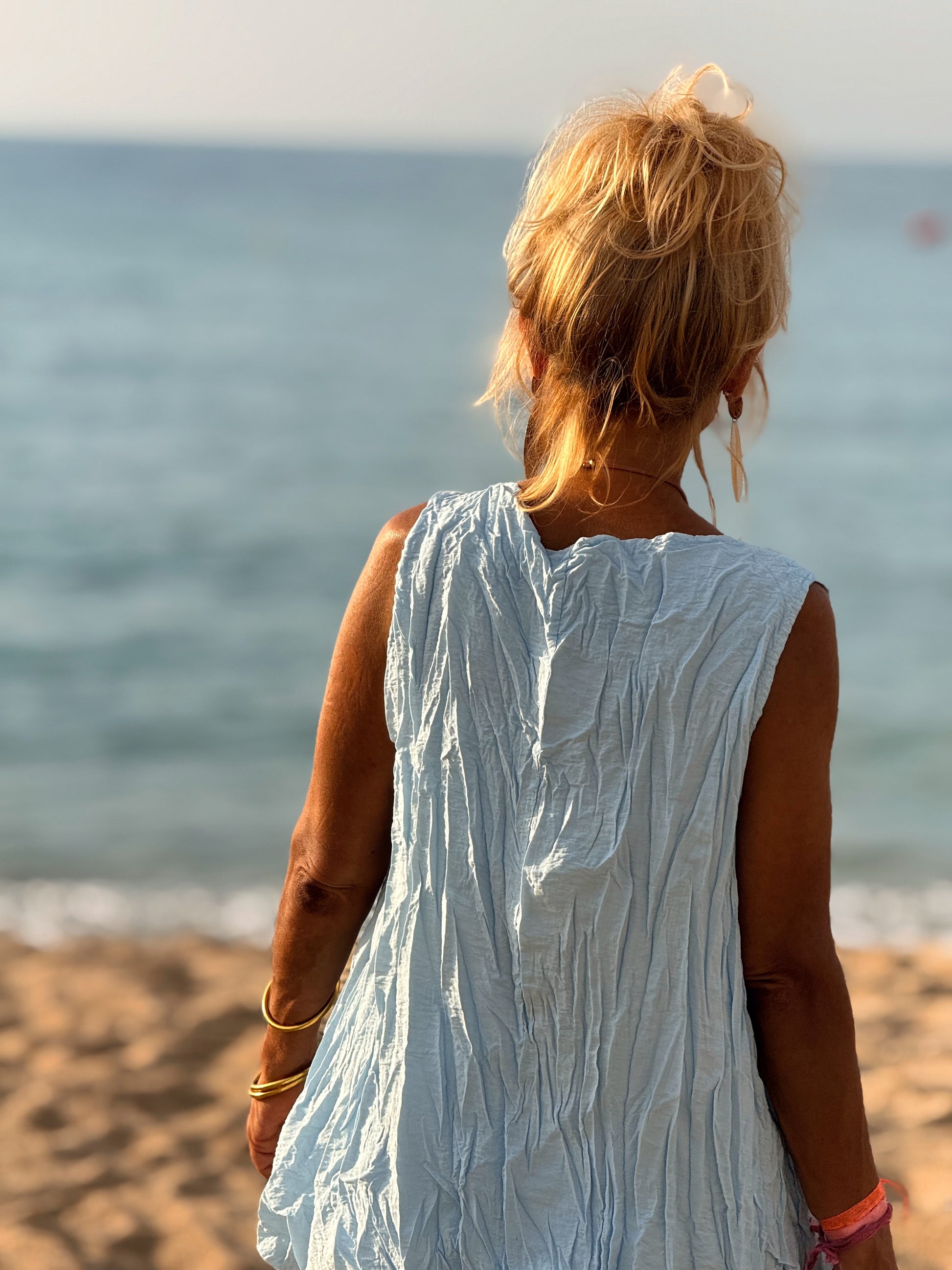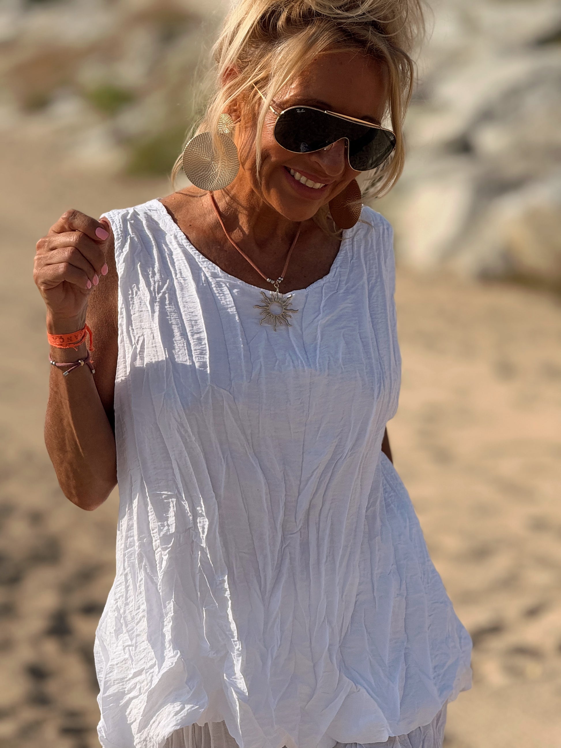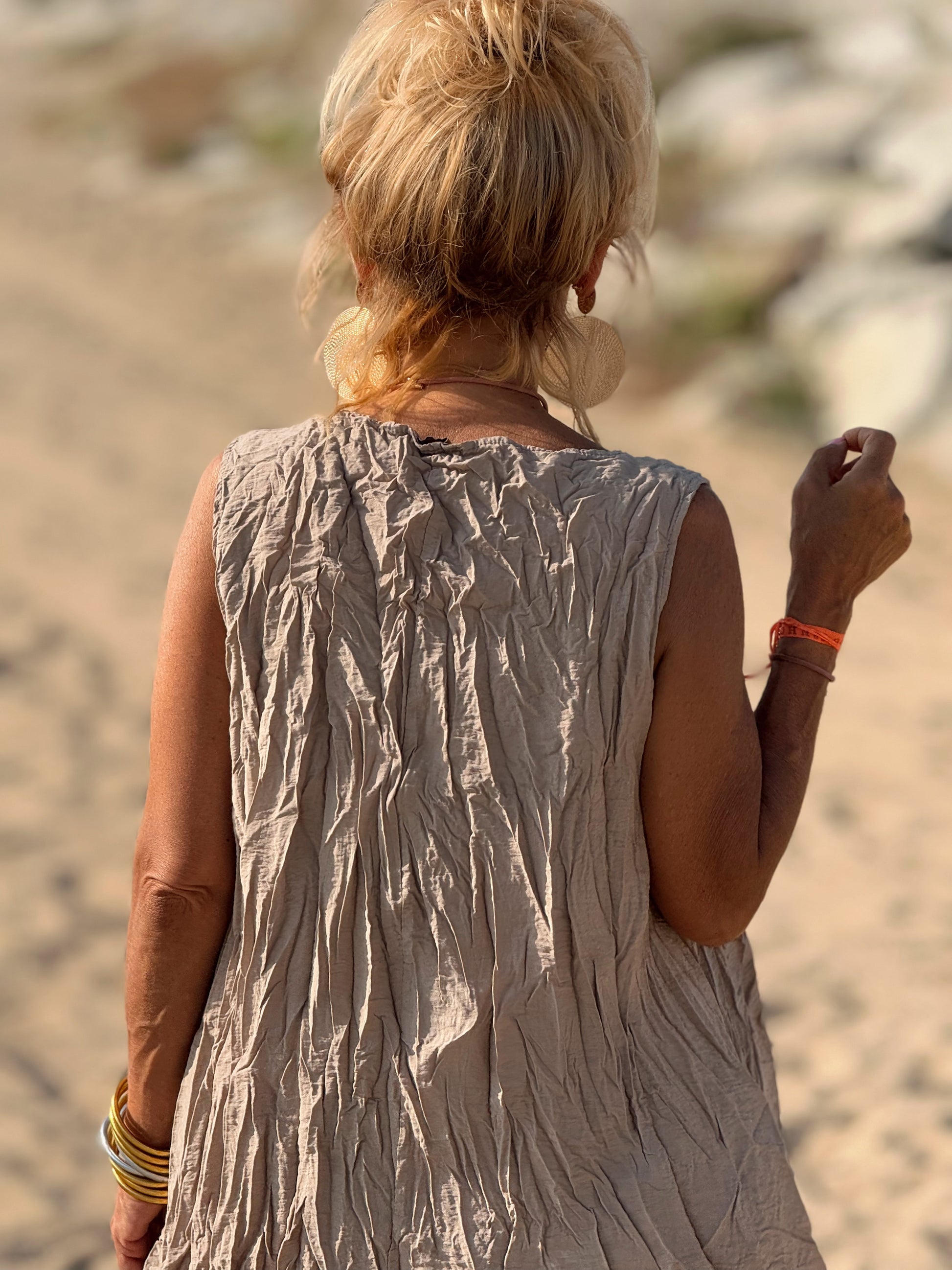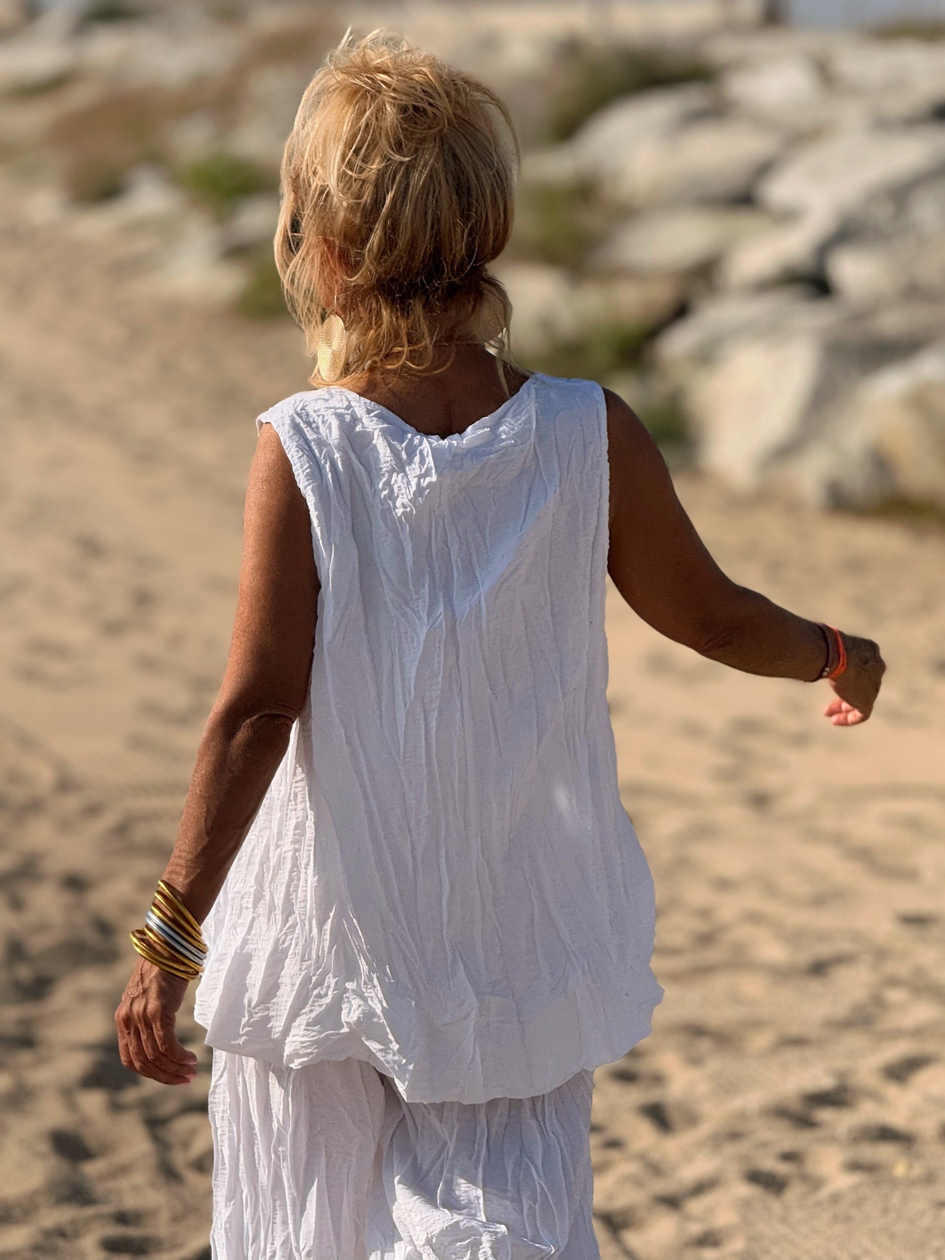 Este conjunto está formado por un top tipo blusa y un pantalón con cintura elástica. El tejido es plisado y con un efecto arrugado que se lleva así, y es justamente lo que le da todo su estilo y personalidad.