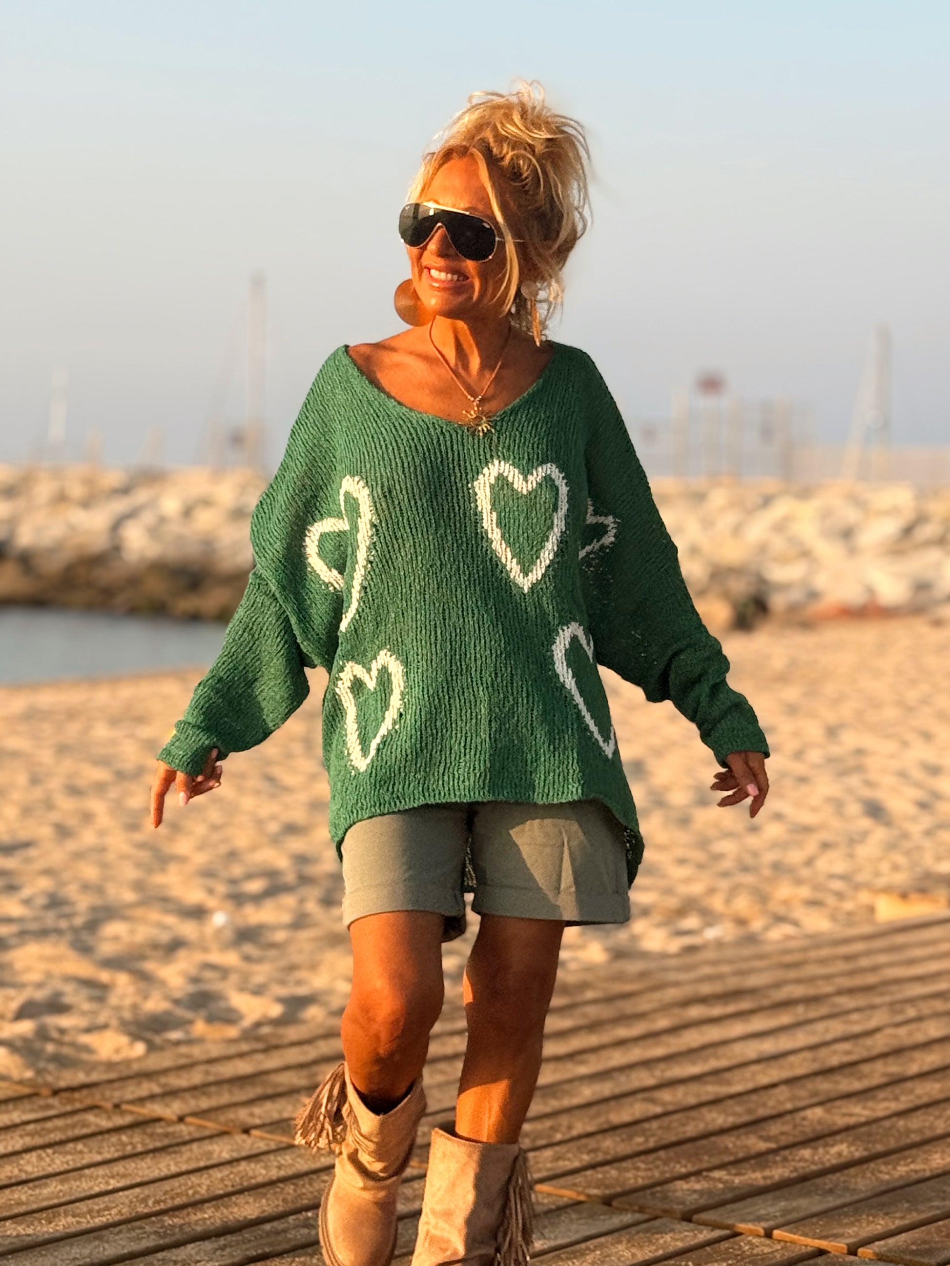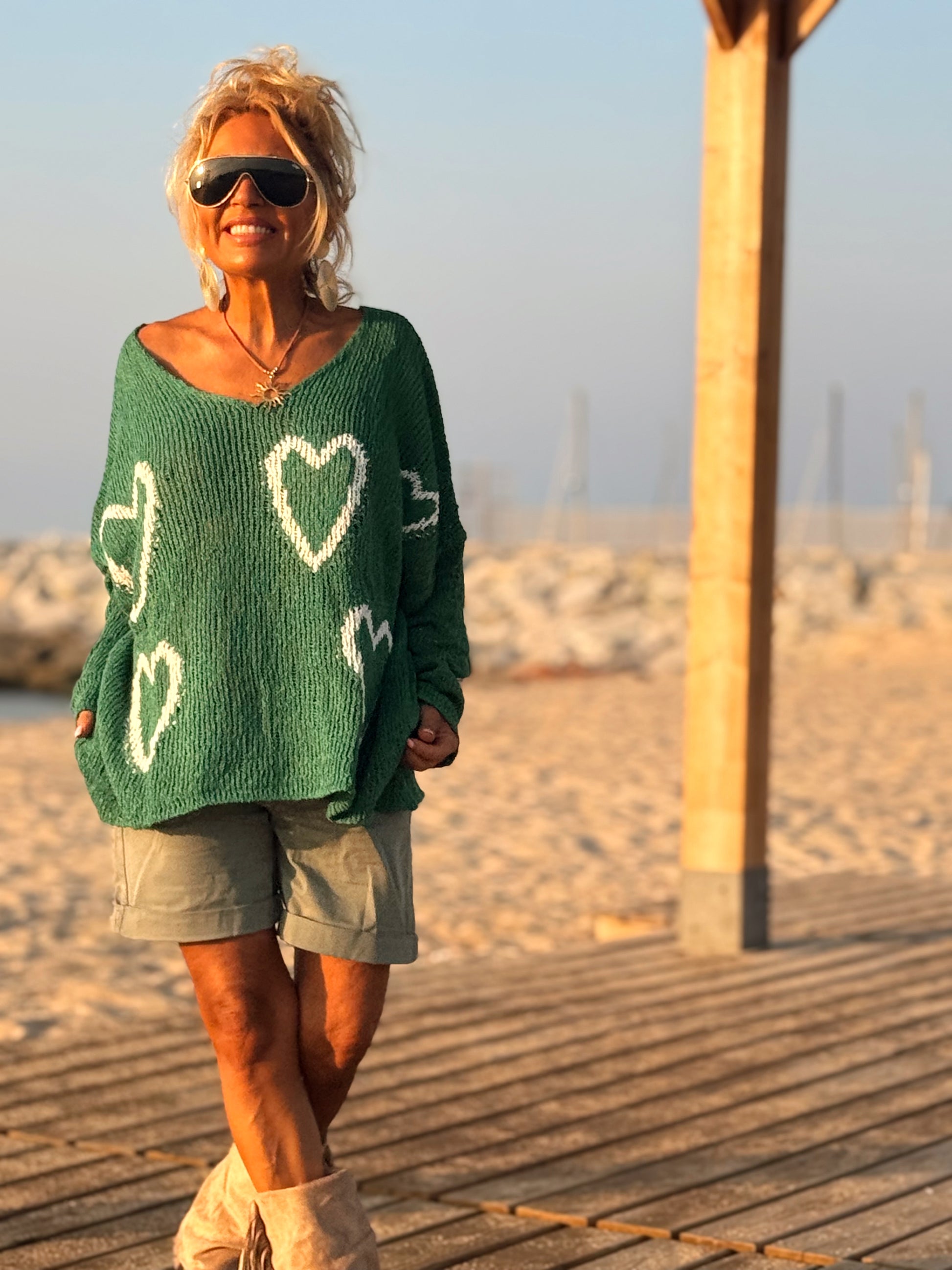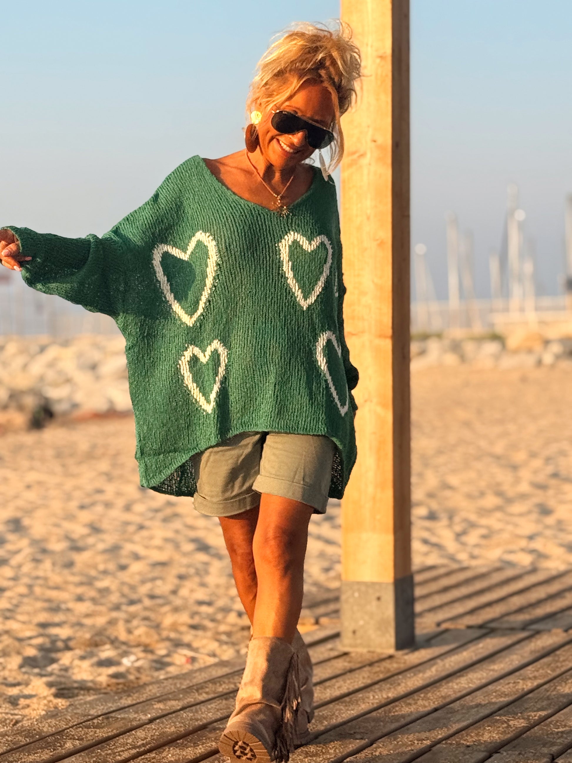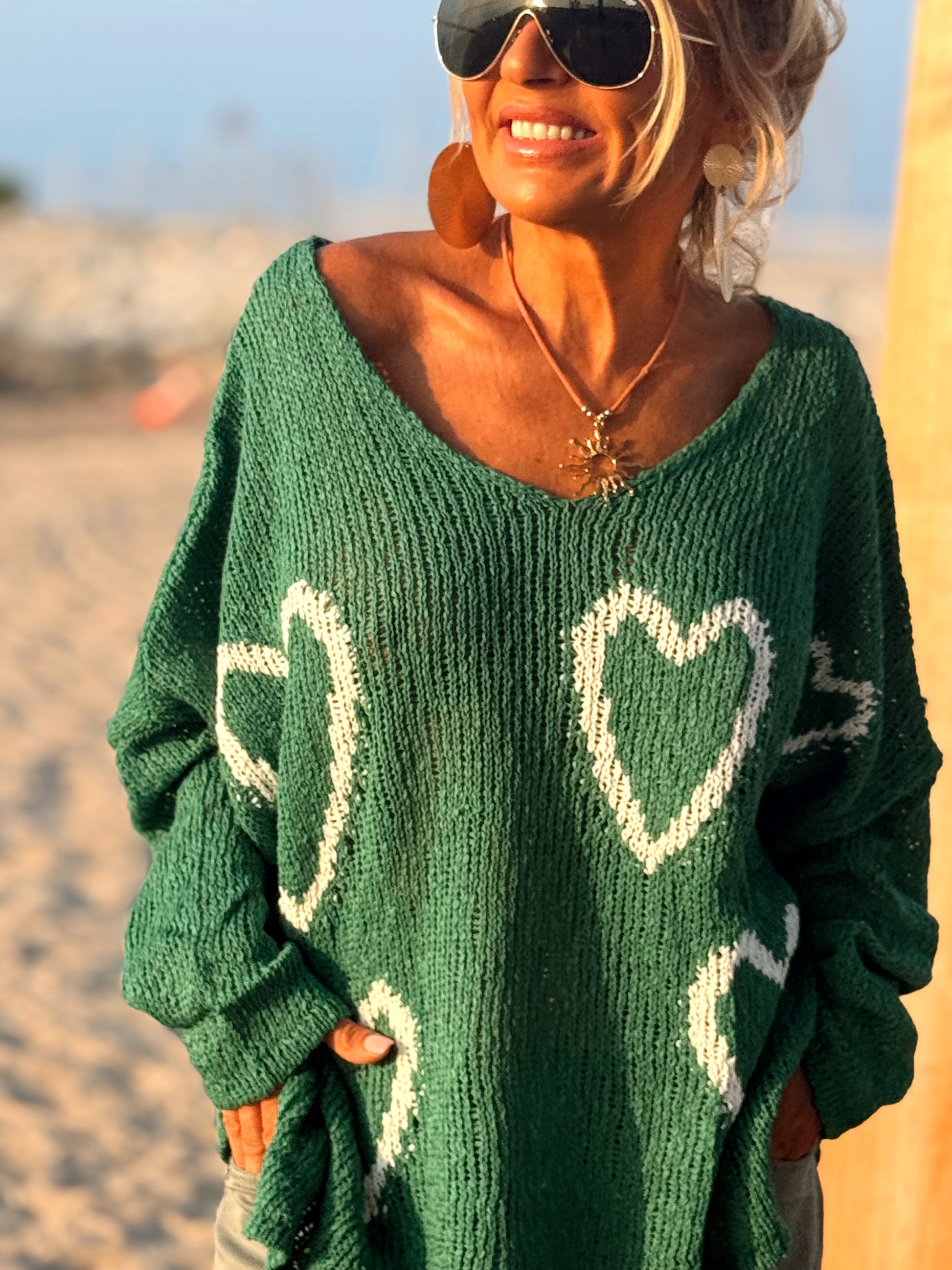 Suéter con corazones, simplemente precioso. Oversize y con un corte asimétrico, se adapta hasta la talla 44. Moderno, cómodo y lleno de estilo, es perfecto para aportar un toque único a cualquier look.✨